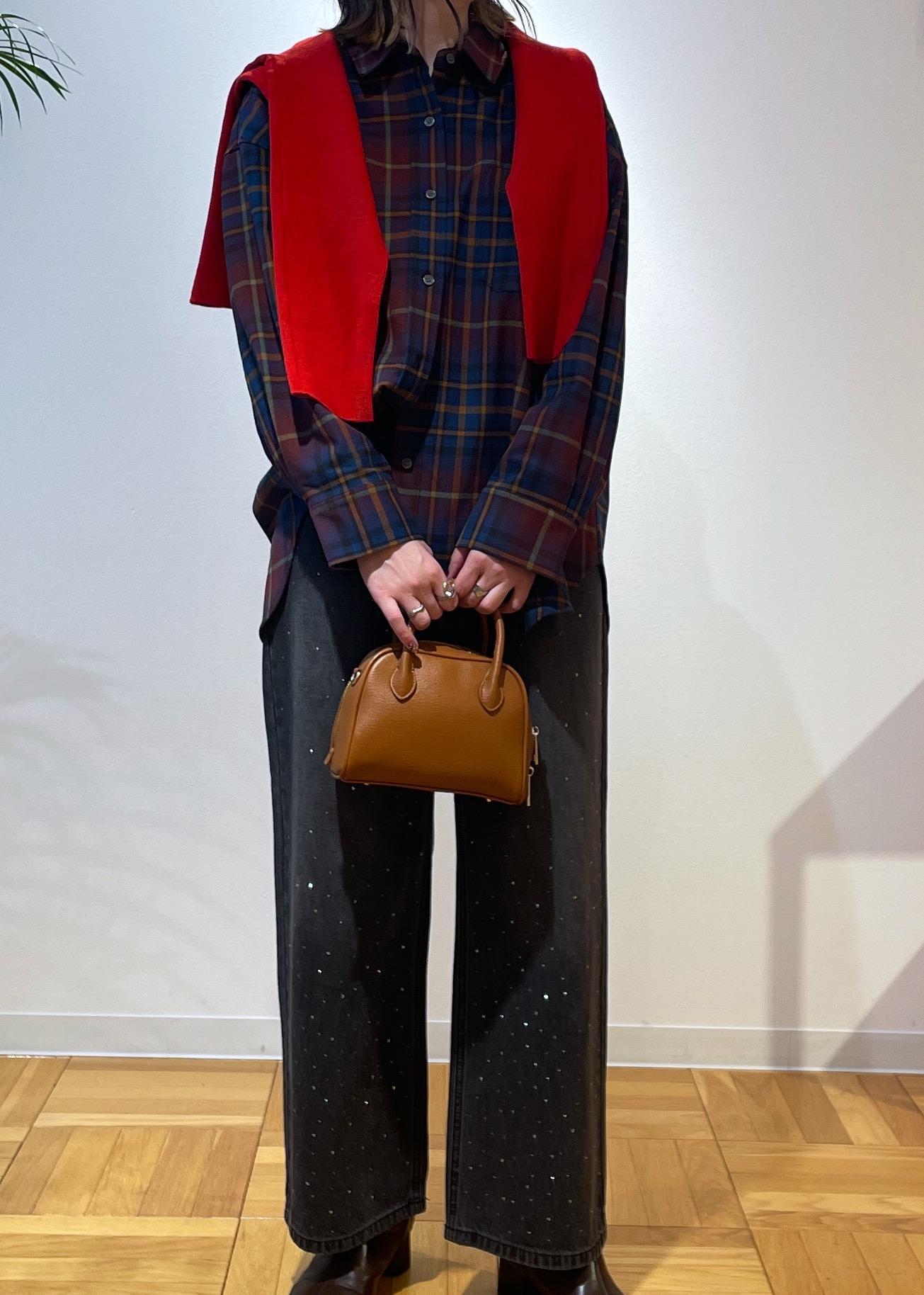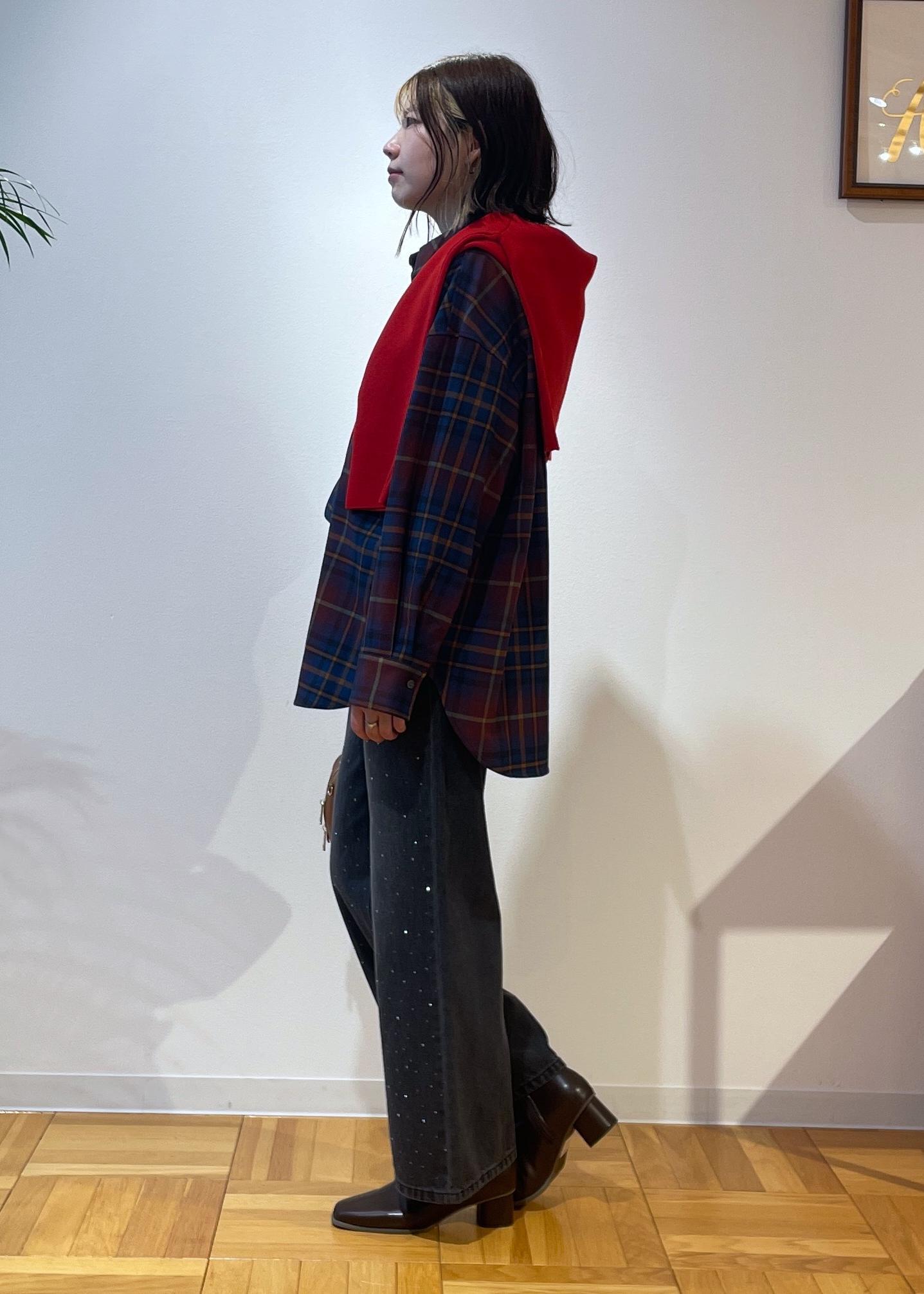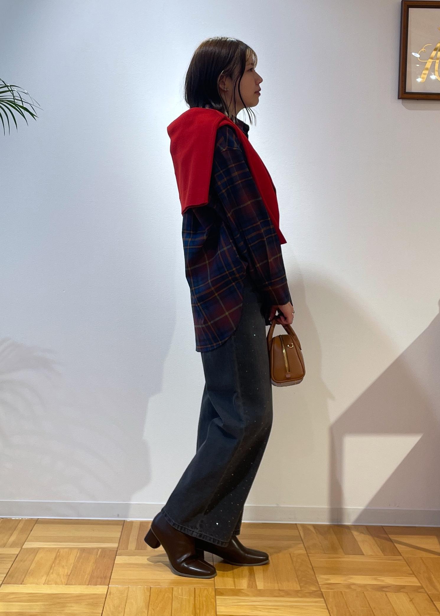 まだ少し残暑を感じるのでら、ミラノリブカーディガンは肩がけに...ネルシャツと色を合わせて、デニムは落ち着いた色でメリハリをつけました◎