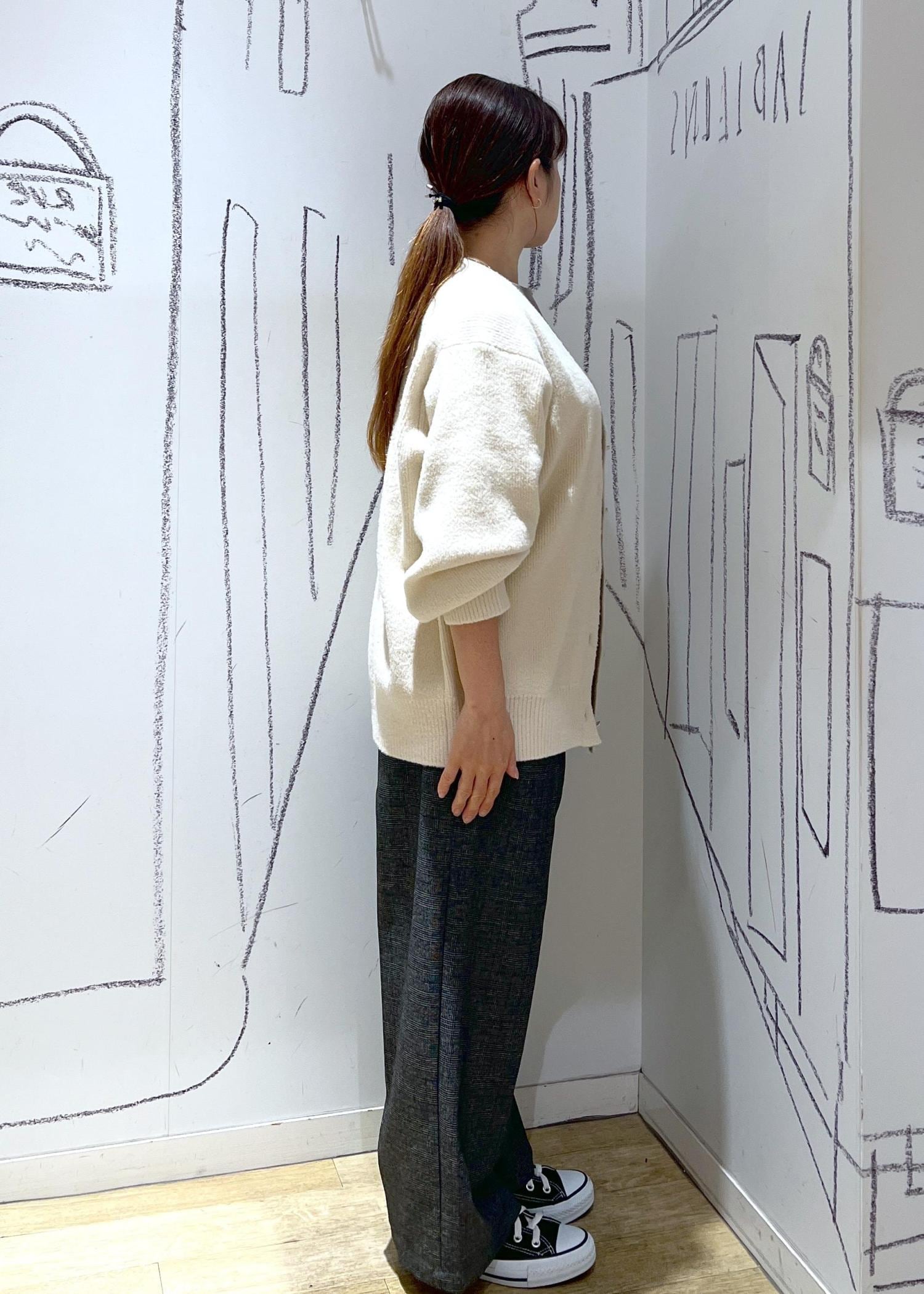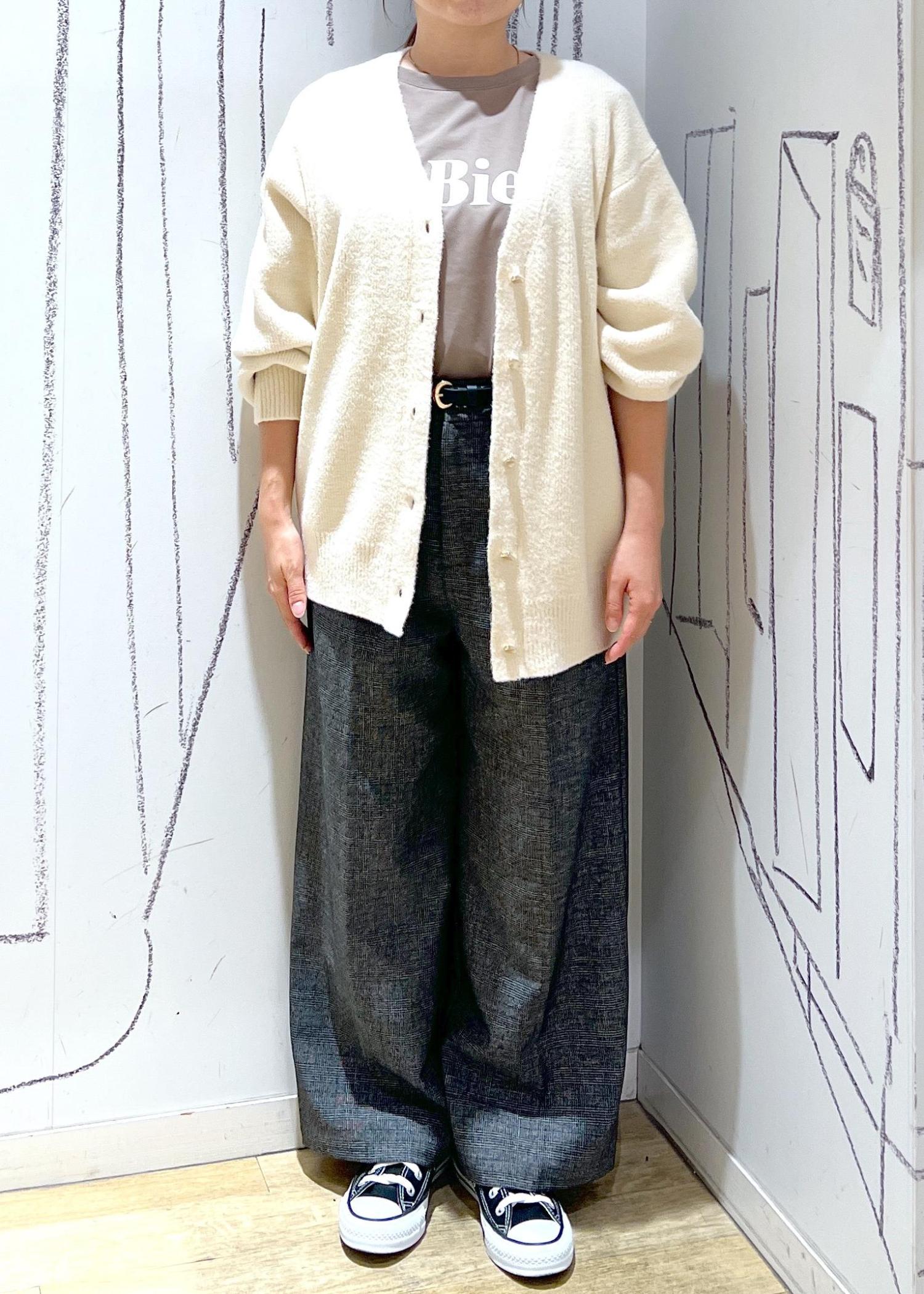 小柄さんにも着やすいVネック開きのミドル丈カーディガンです!端境期で着るものに困る時期の見方コーディネート!