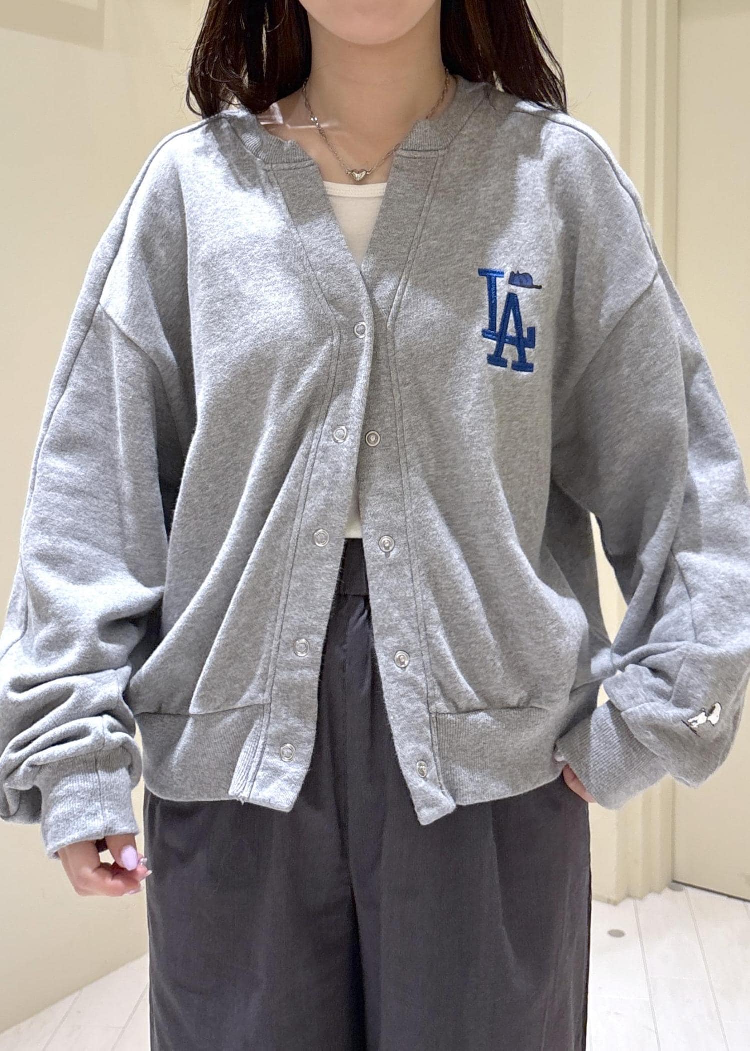 スヌーピーのスウェットカーディガンがお気に入りで、最近の出勤ではこればかり着用しています!