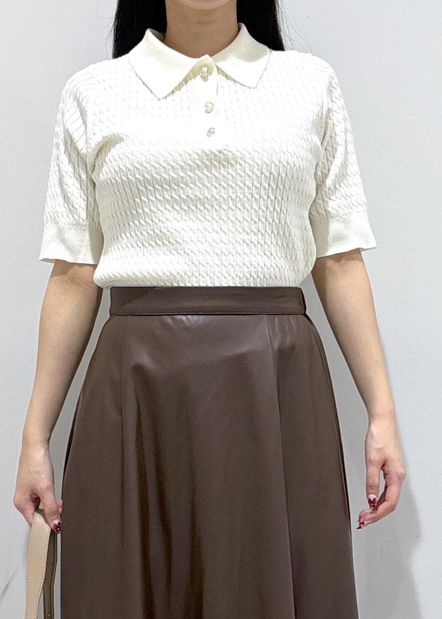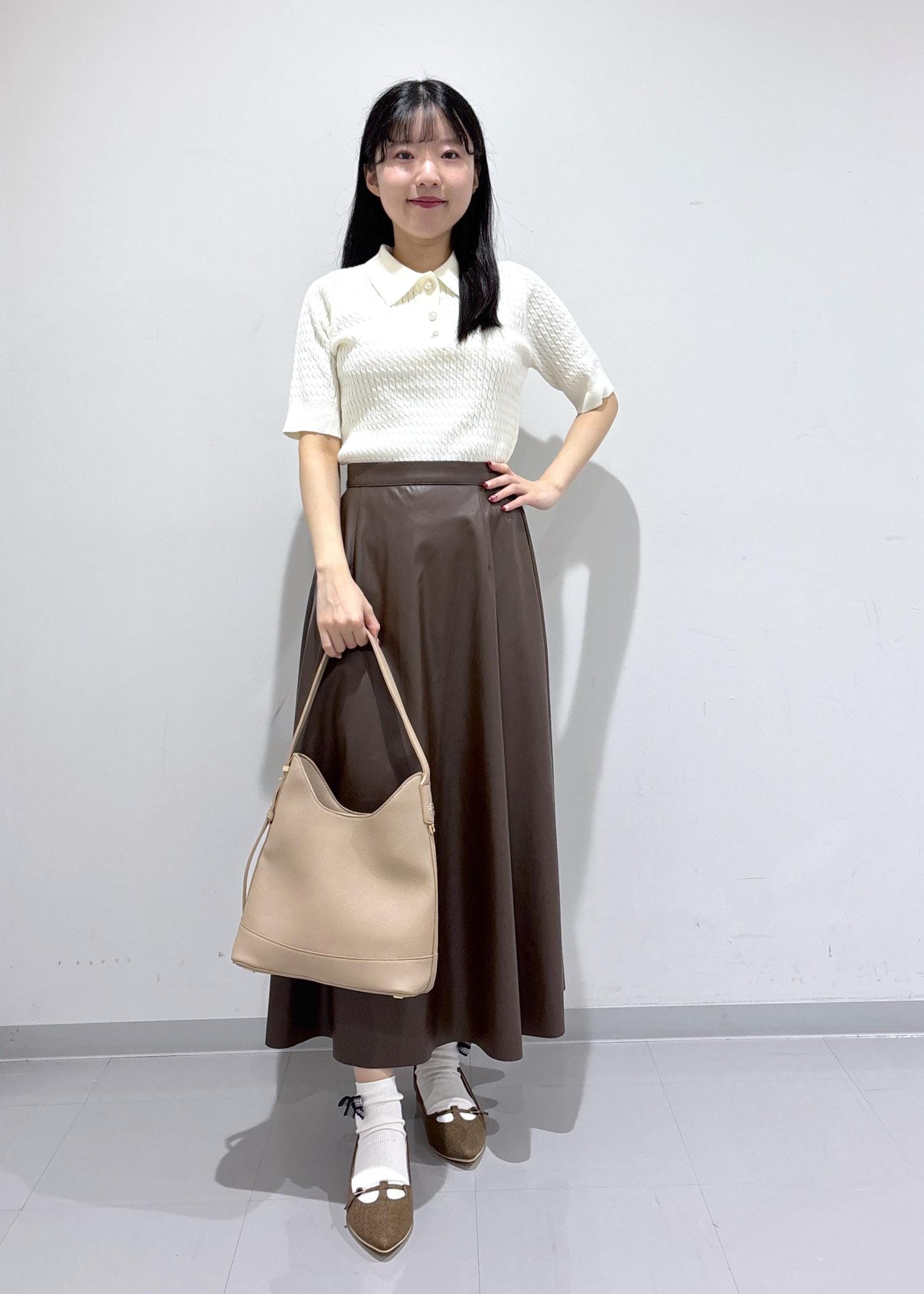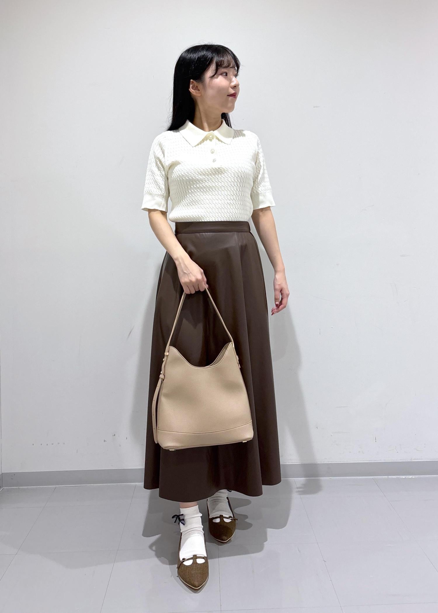 ポロニットに、レザースカートを合わせた大人カジュアルコーデです!