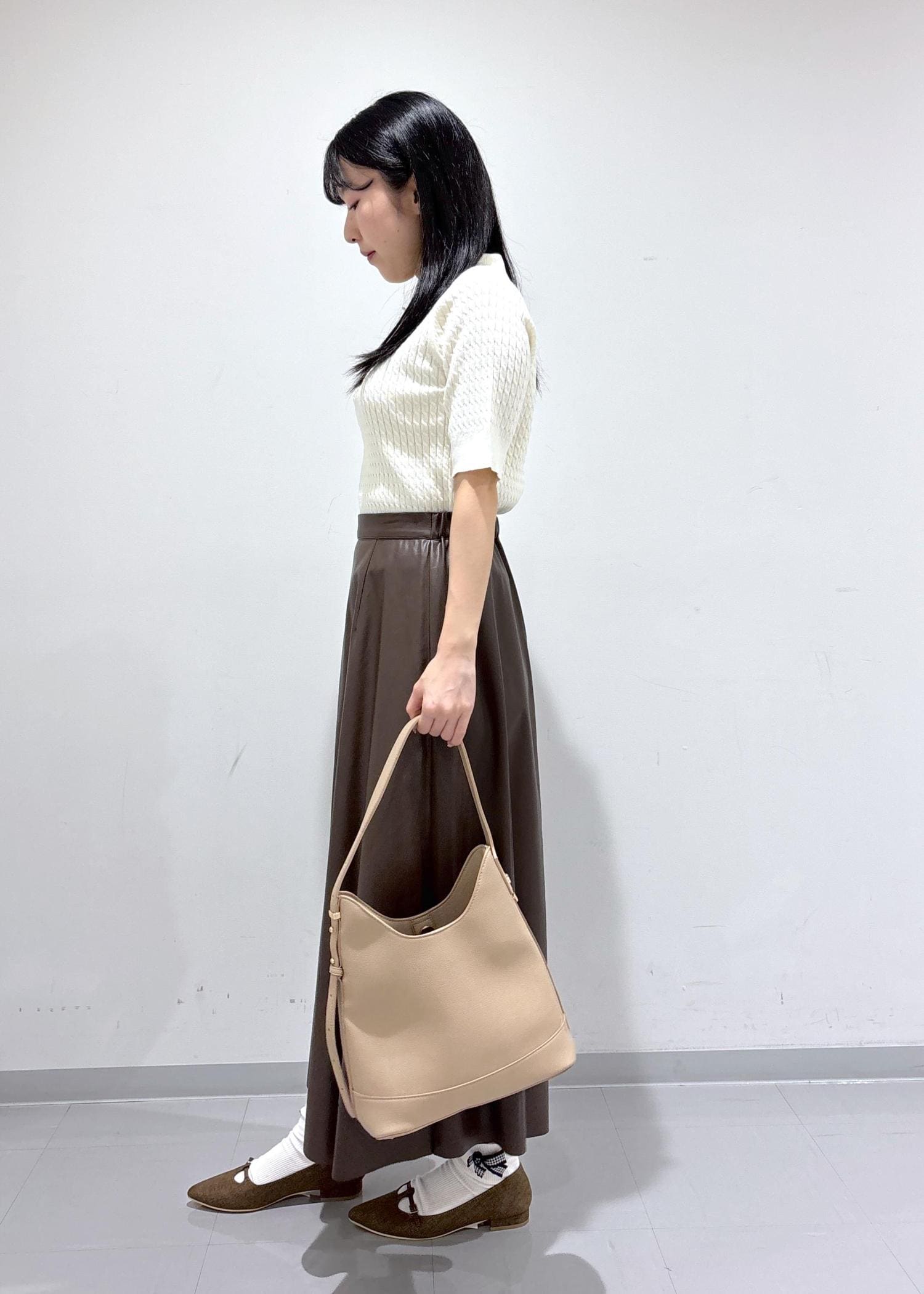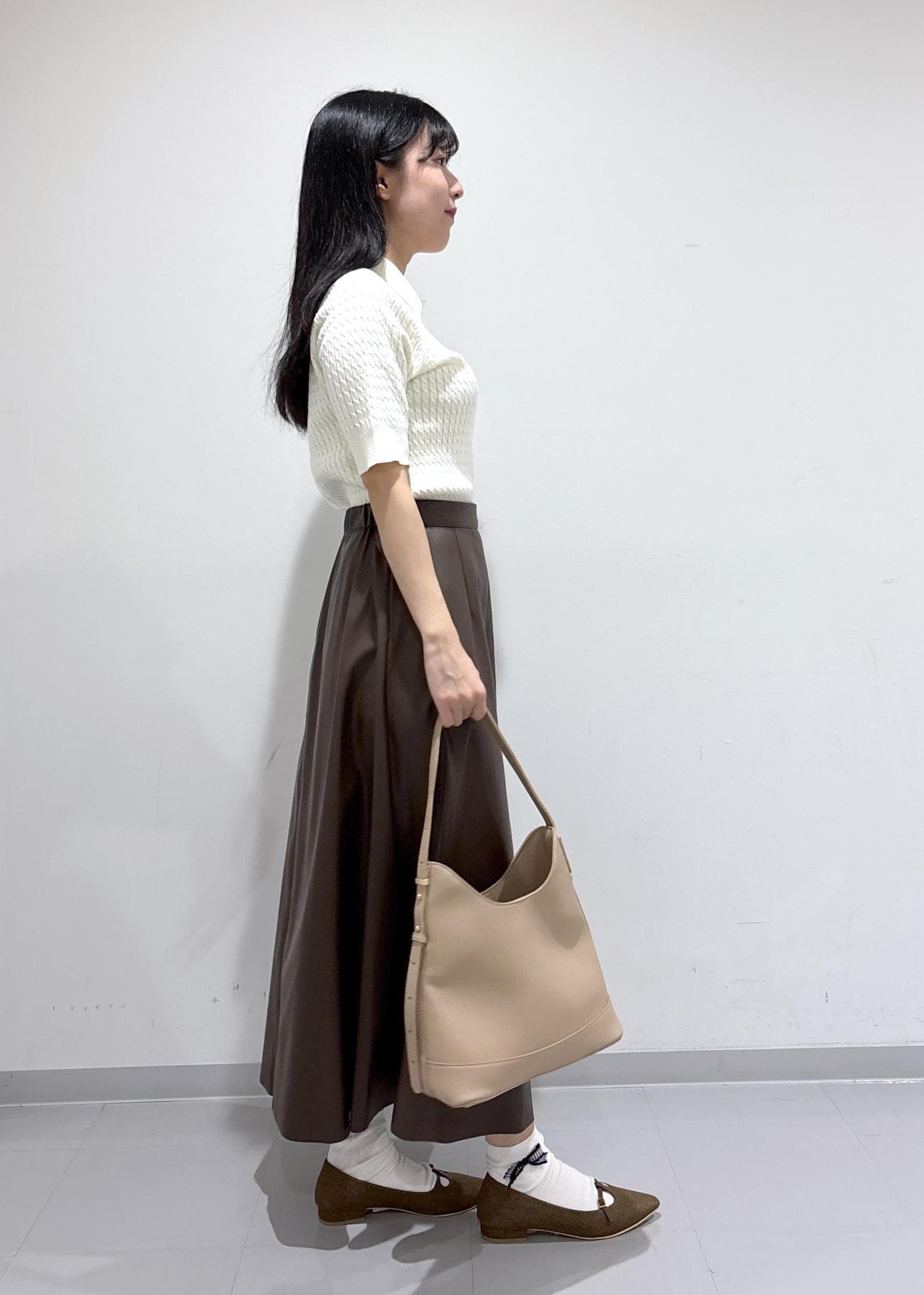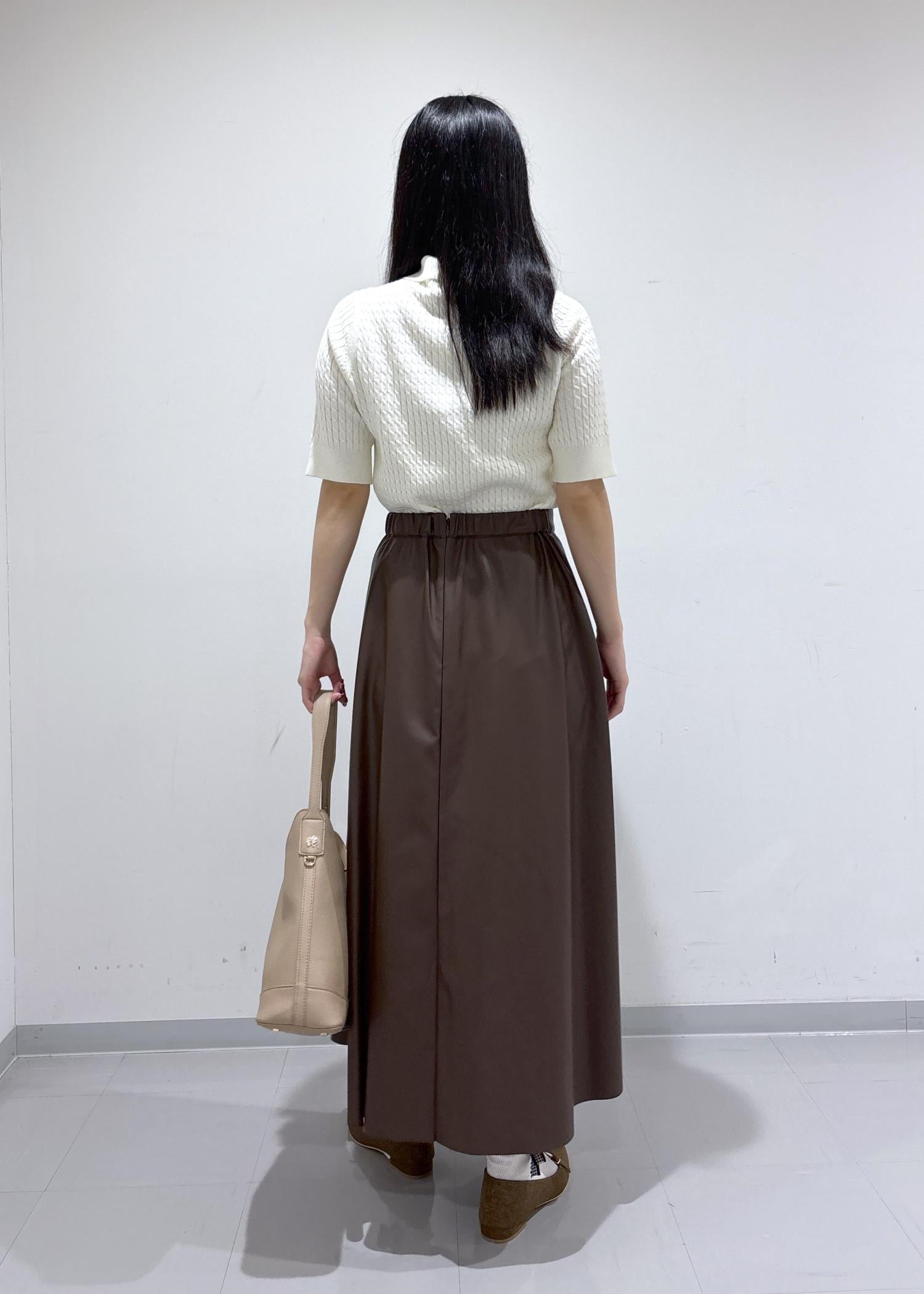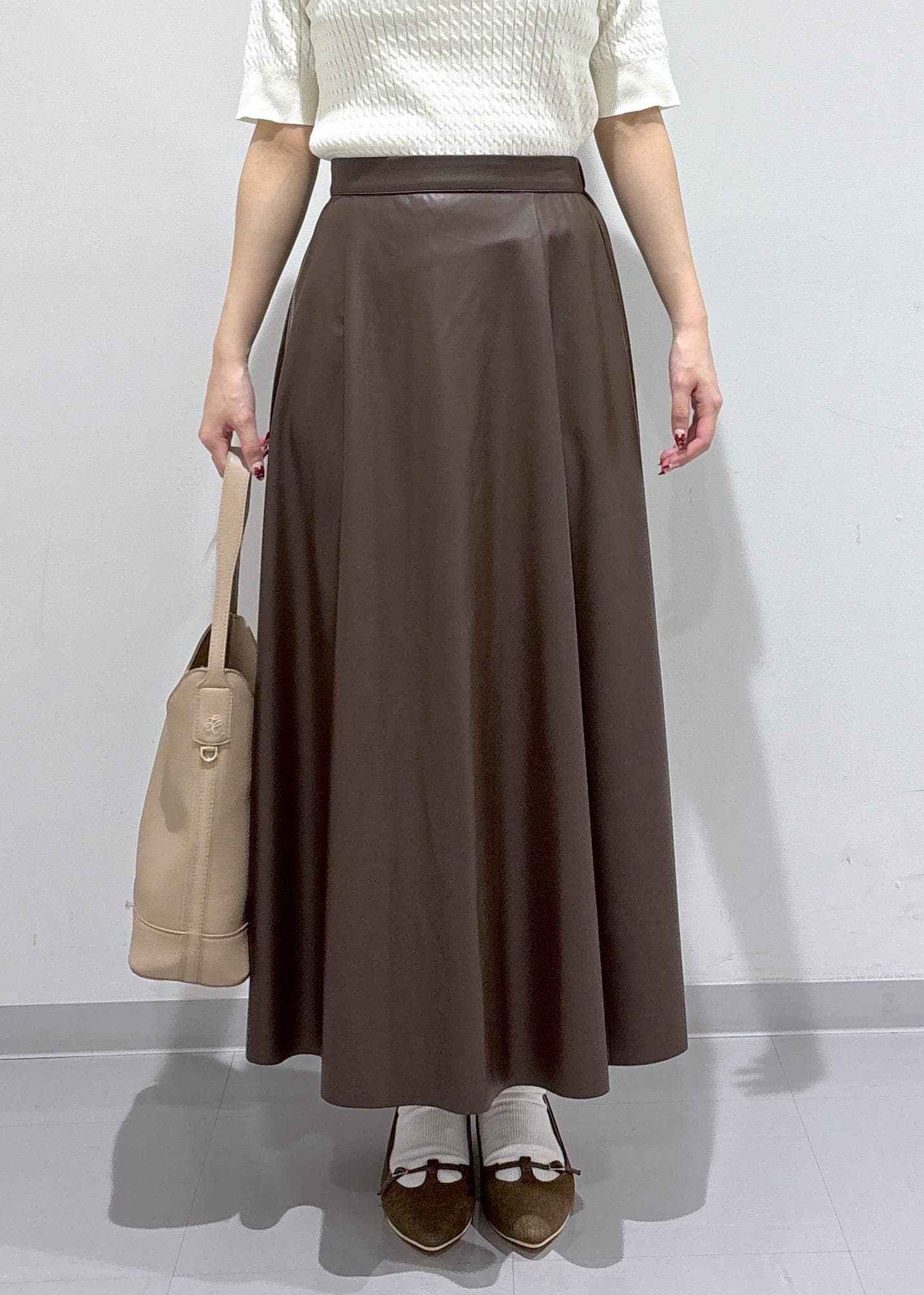 コーディネートにブラウンのレザースカートを取り入れると、一気に季節感が出るのでオススメです◎