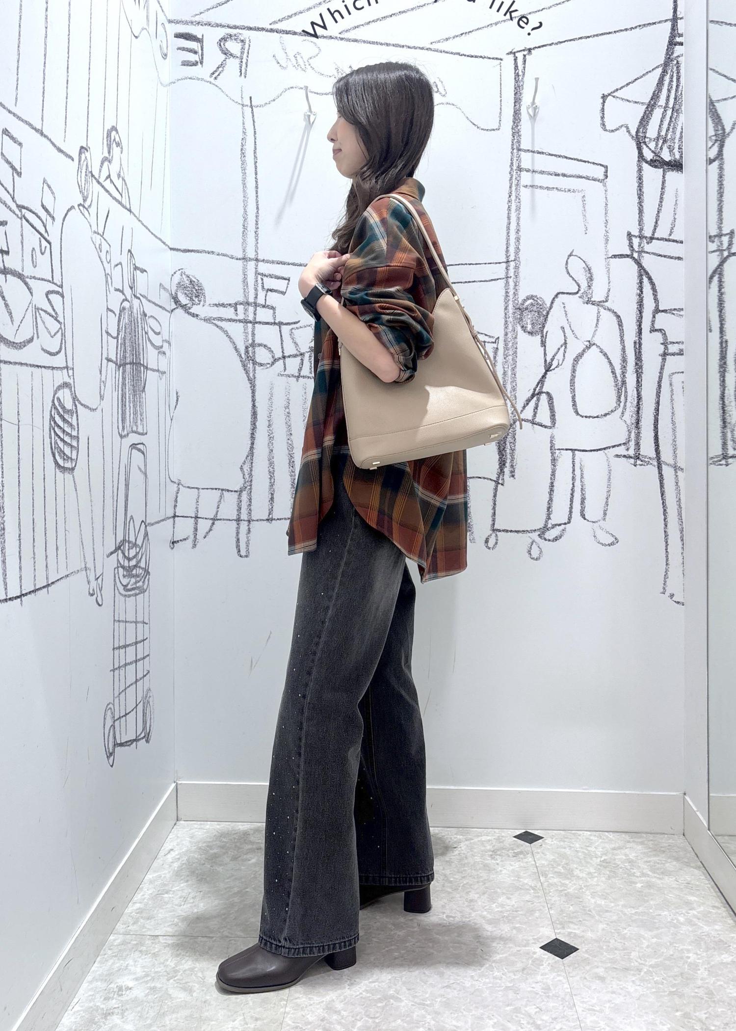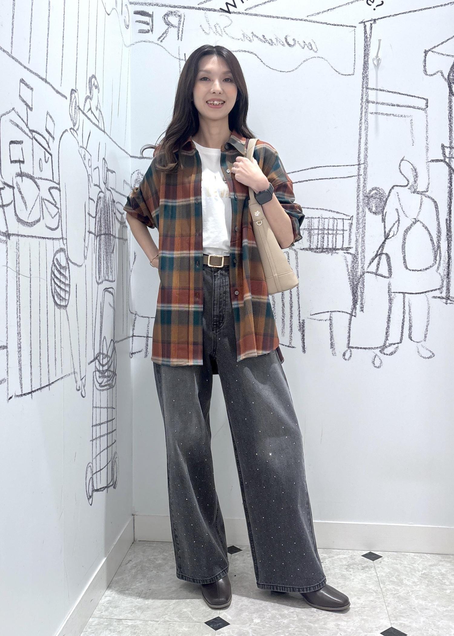 秋らしいチェックシャツとデニムパンツを合わせたカジュアルなコーディネートです。
