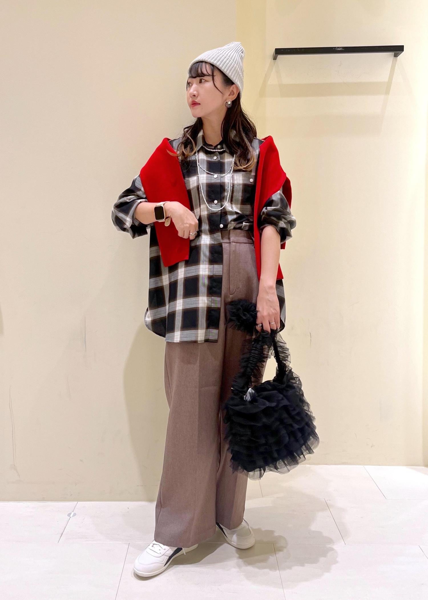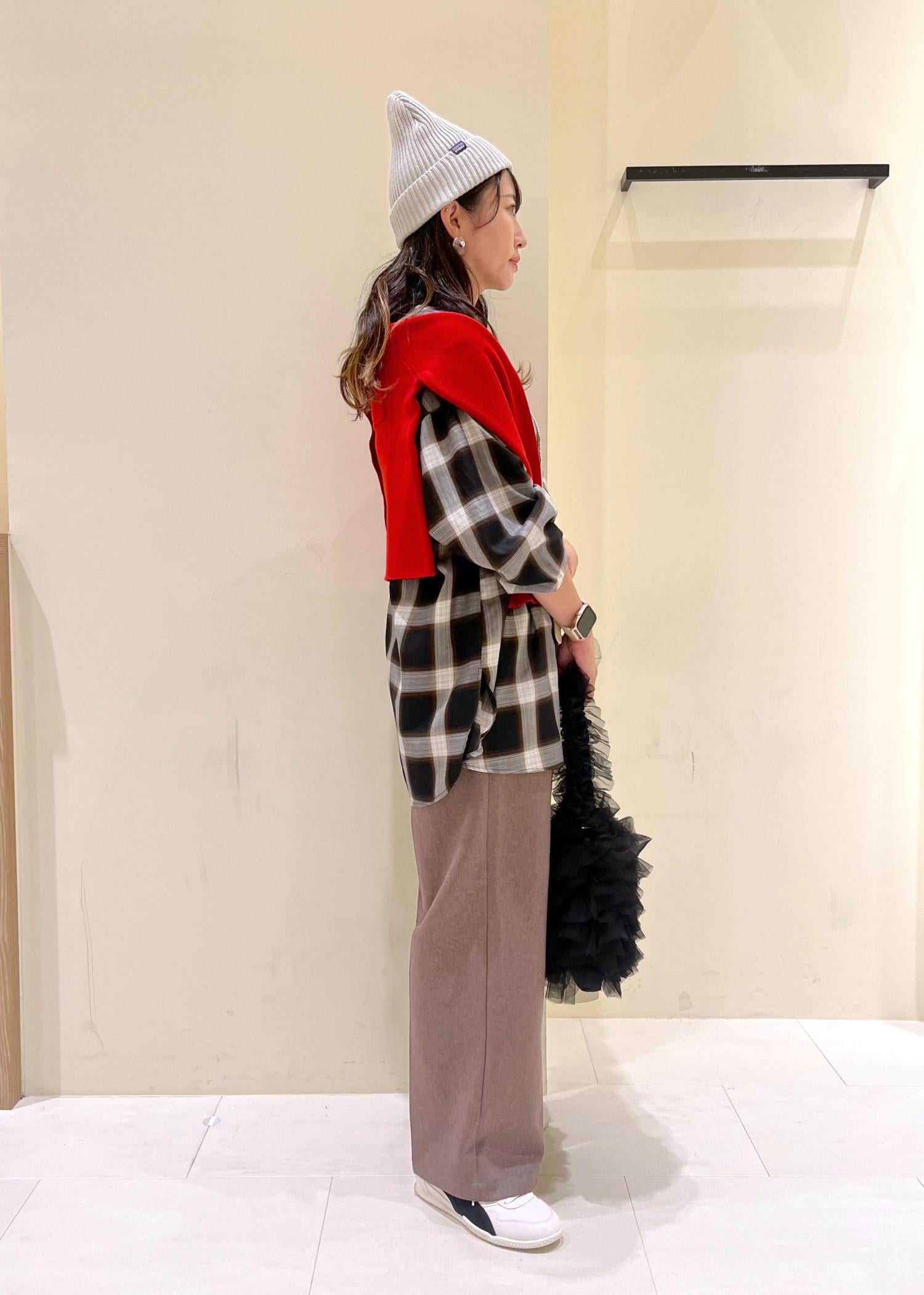 秋らしいブラック×ブラウンコーデに赤のカーディガンを差し色にしたコーディネート。