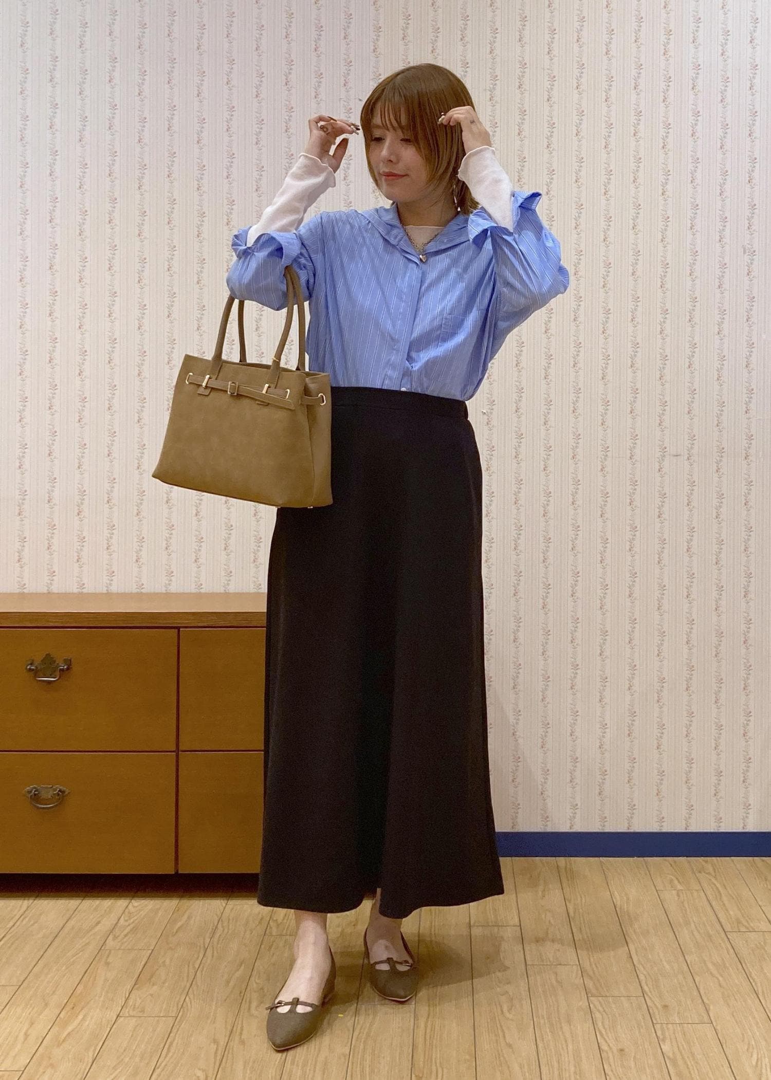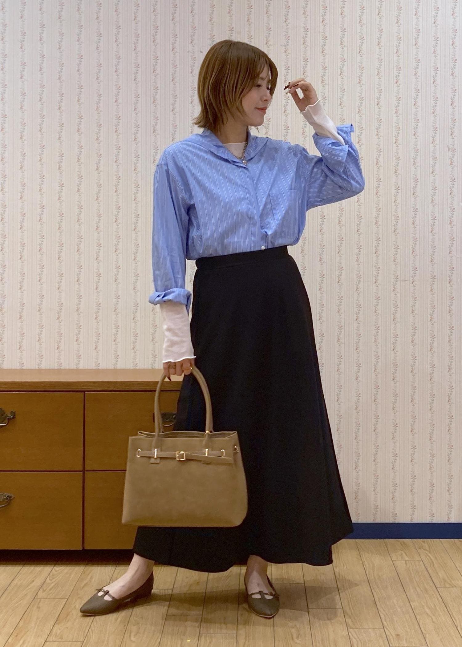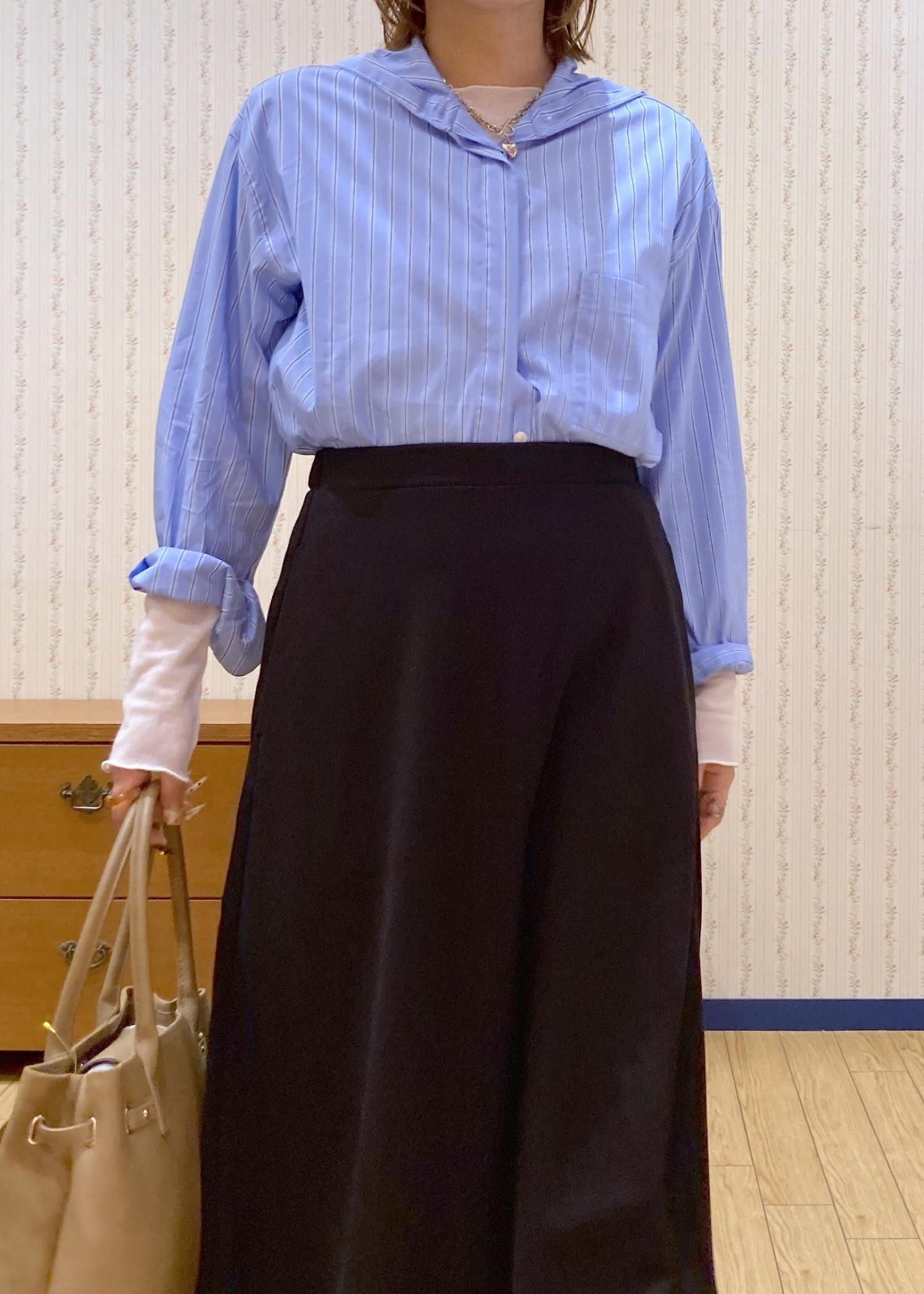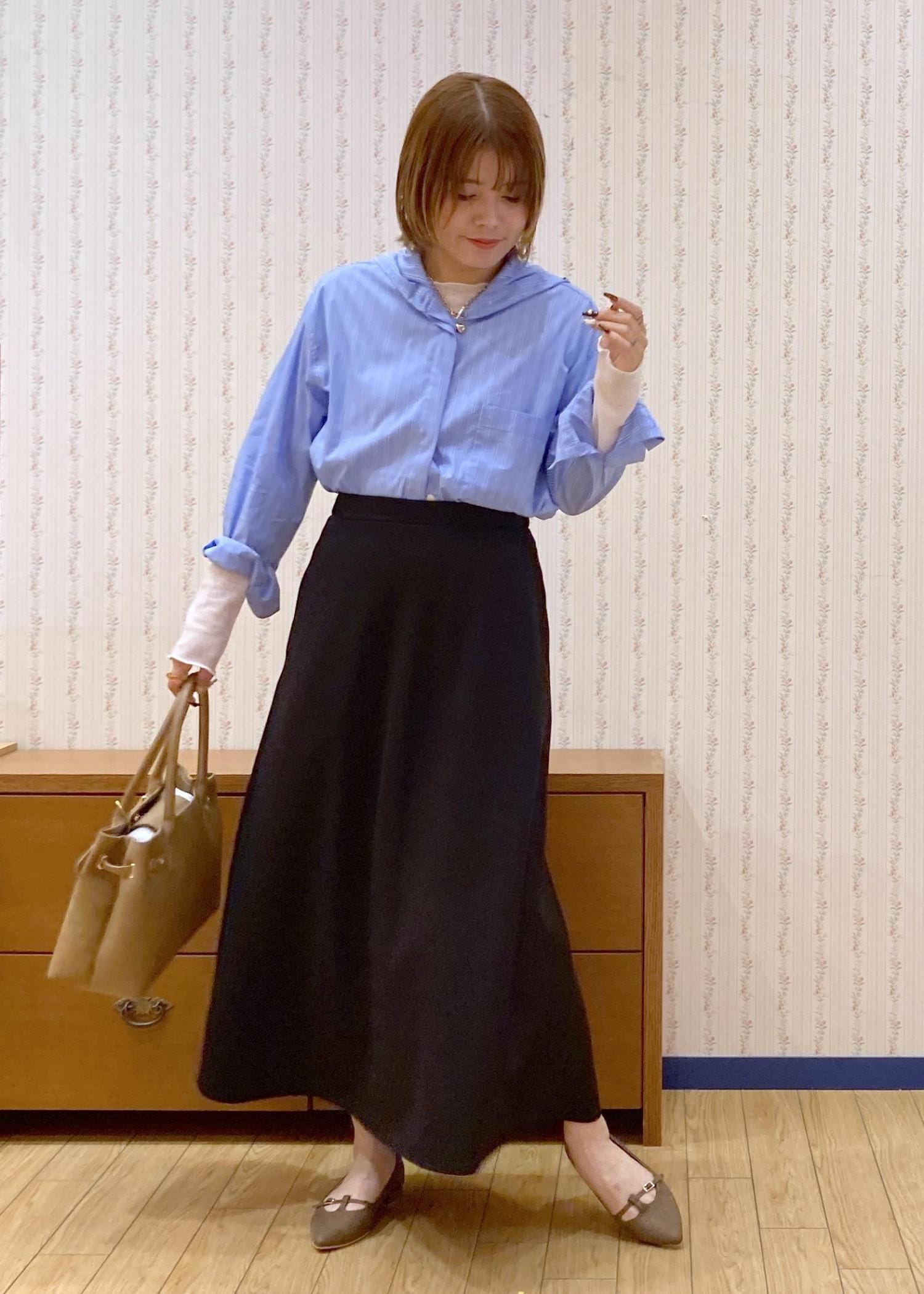 ブラックのスカートでコーディネートを締めて、小物はブラウン系で抜け感をプラスしました!