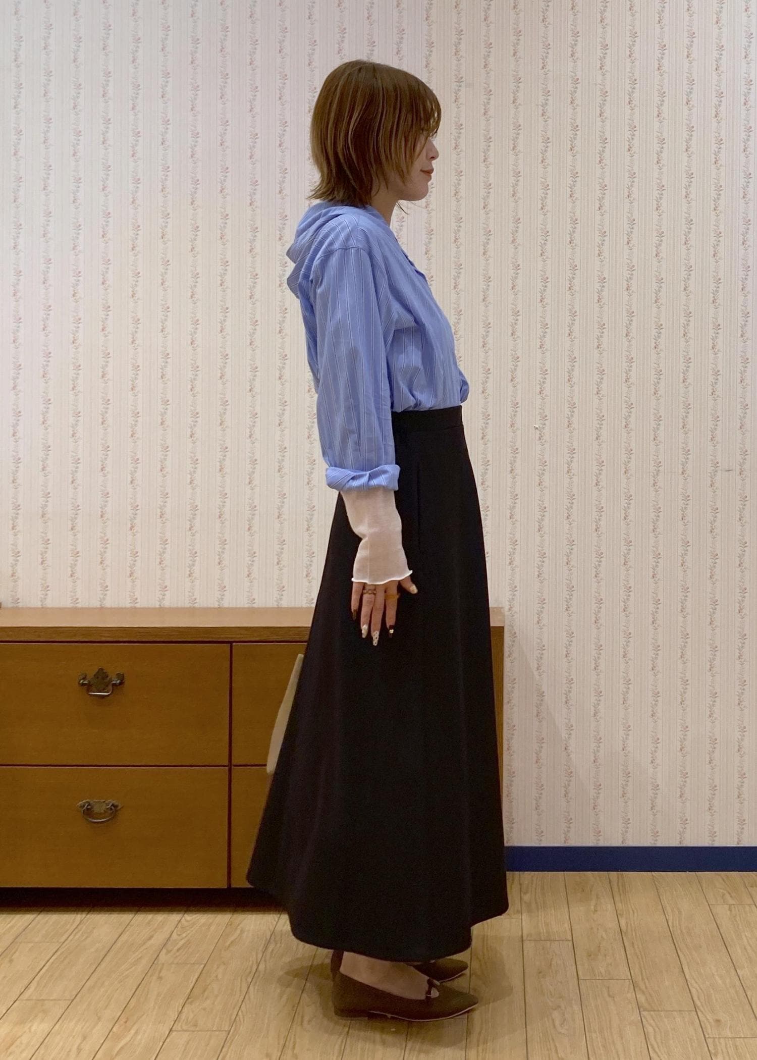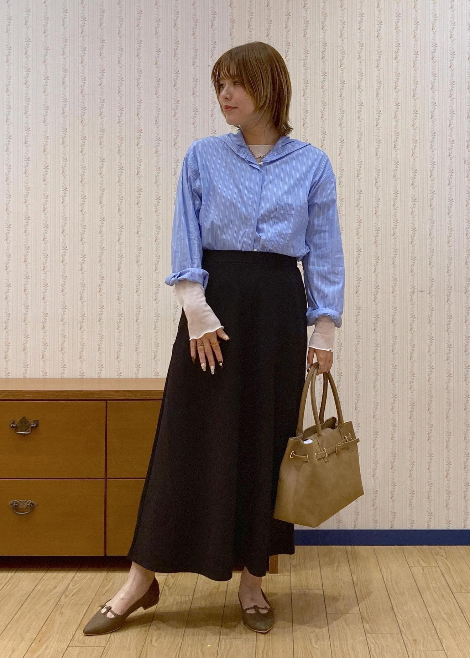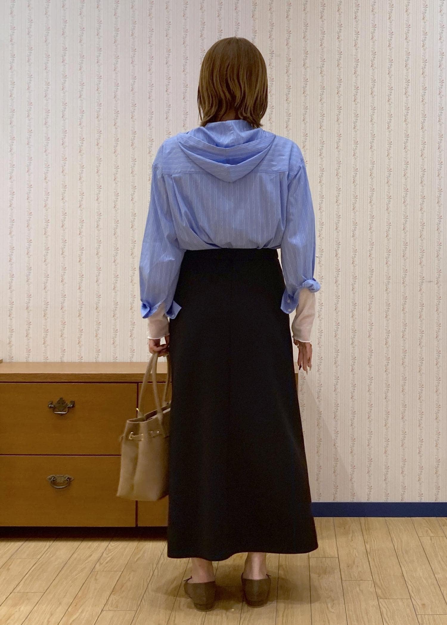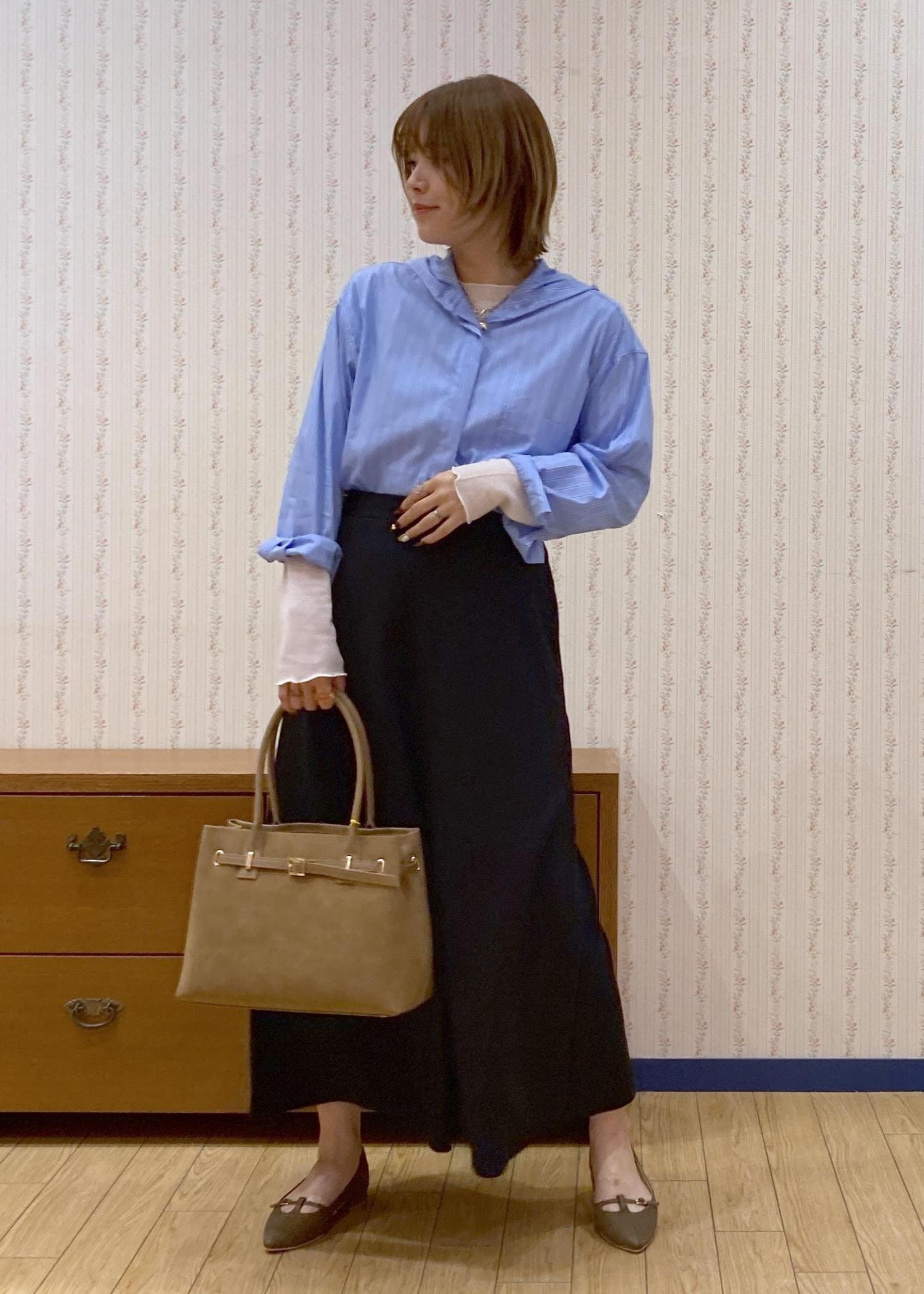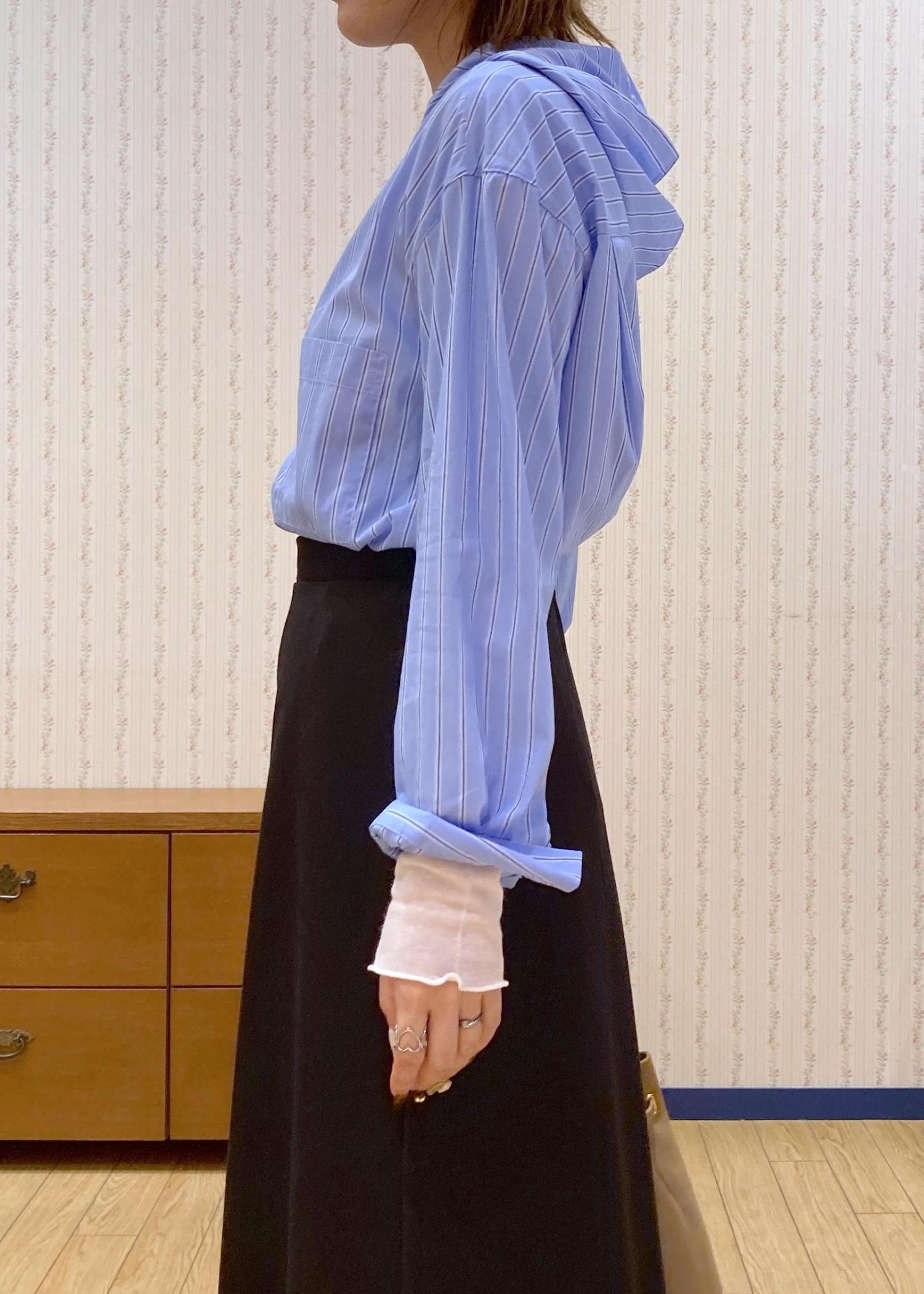 ブルーのシャツフーディのインナーにシアートップスをレイヤードした綺麗めフェミニンコーディネートです。
