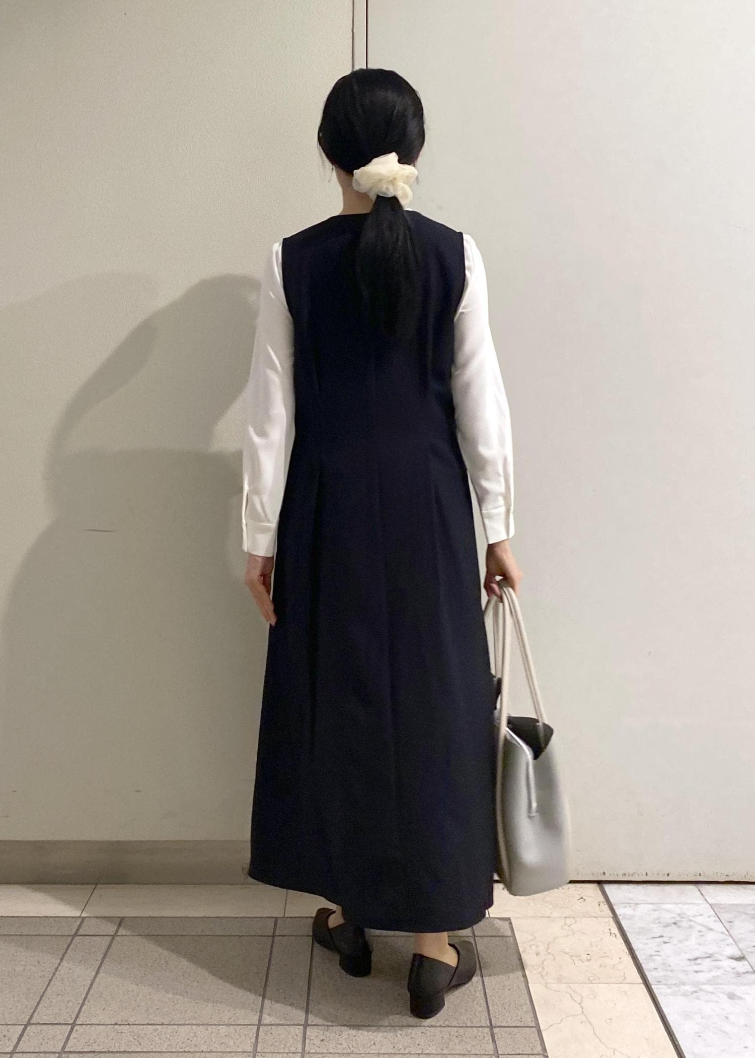 ヘアスタイルもひとつにまとめてスッキリとした印象に。