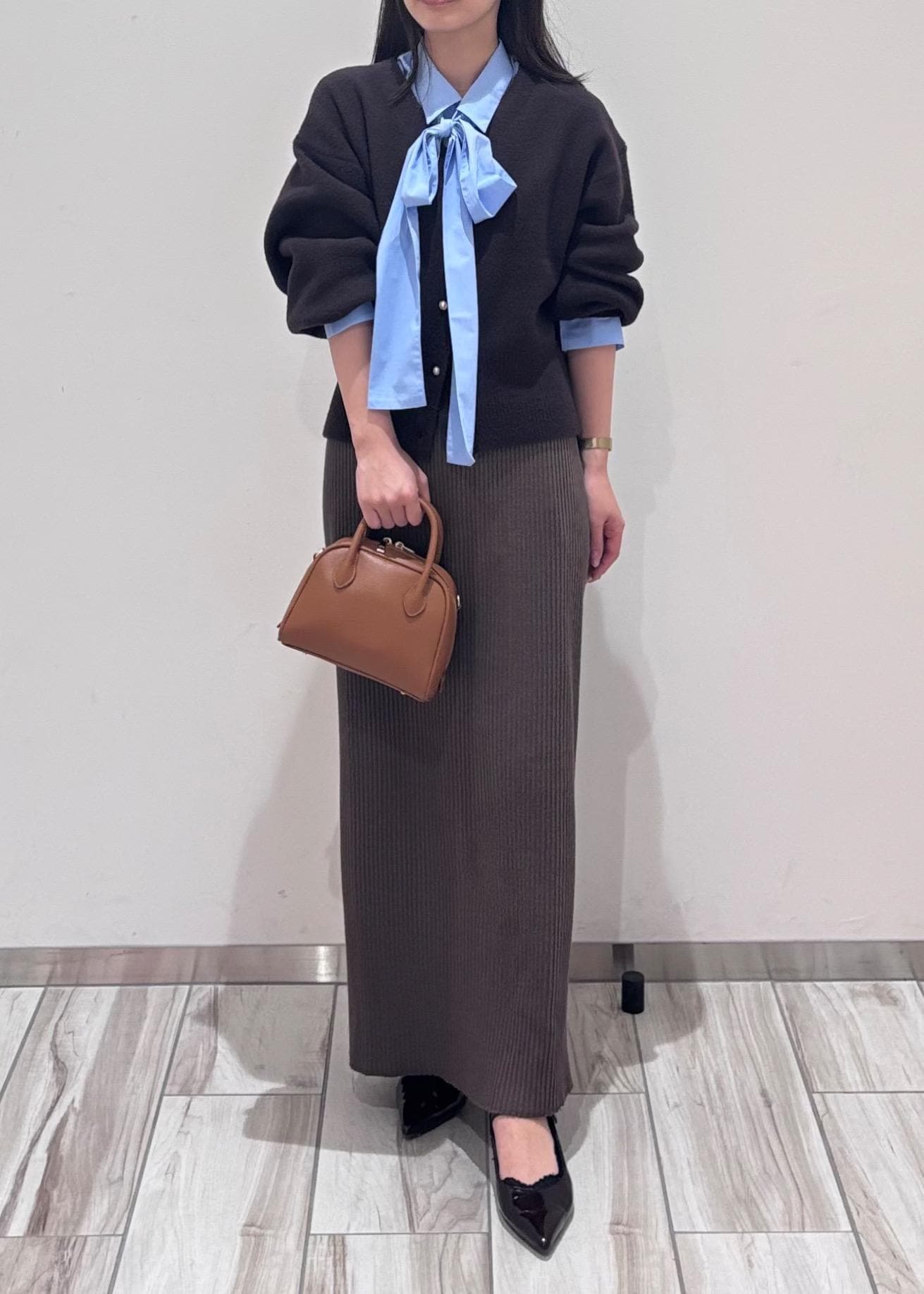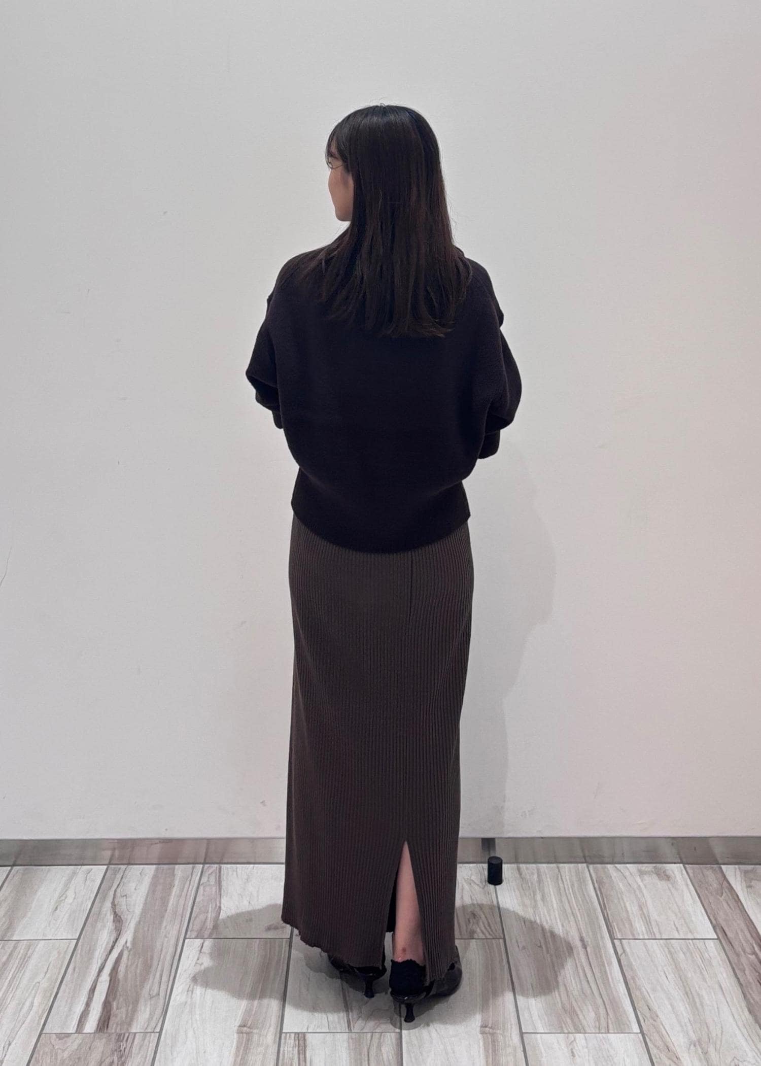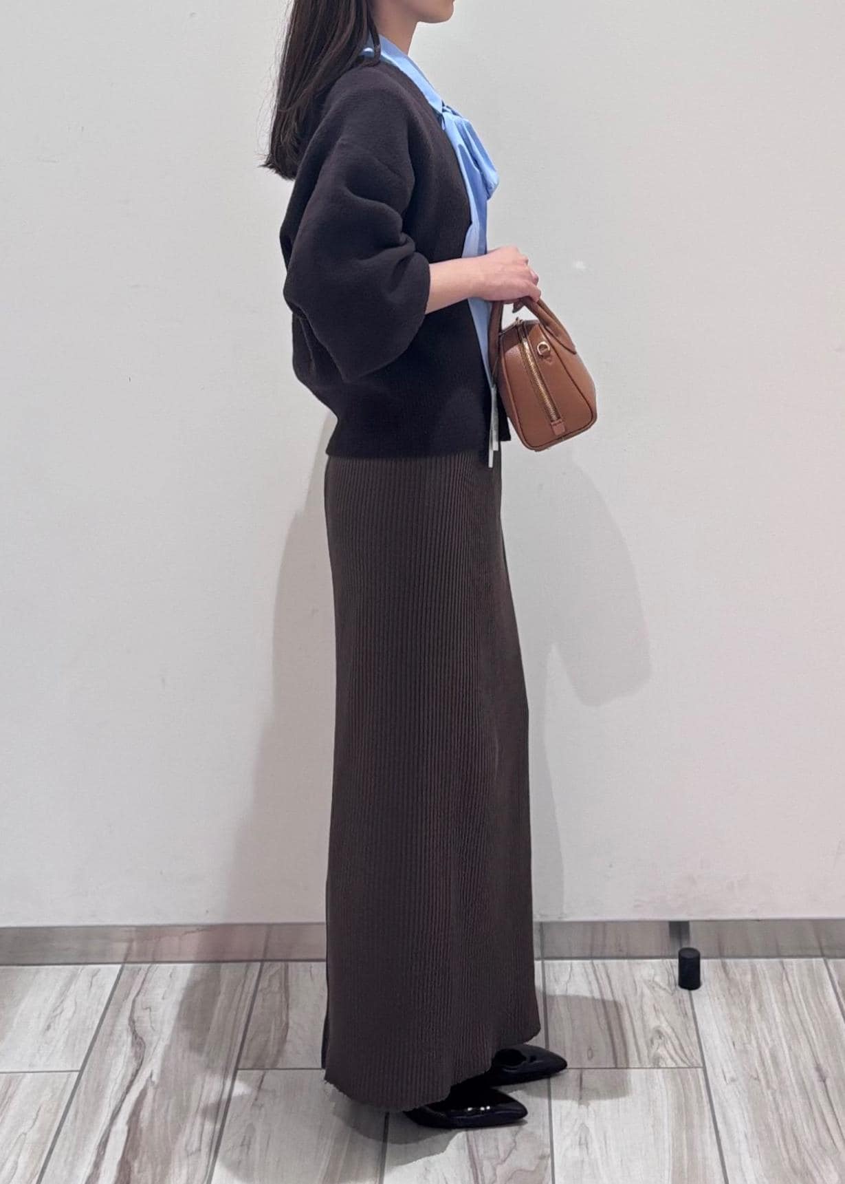 ROPÉ PICNICトタンテレコ Iラインリブニットスカートダークブラウン / 38¥4,499レビュー154センチで、普段ボトムスはssサイズを着用しますが、長めの丈感が好きなので38サイズを着用しました。くるぶしが隠れるほどの長さなので、ヒールや厚底のシューズで合わせるのがお勧めです。