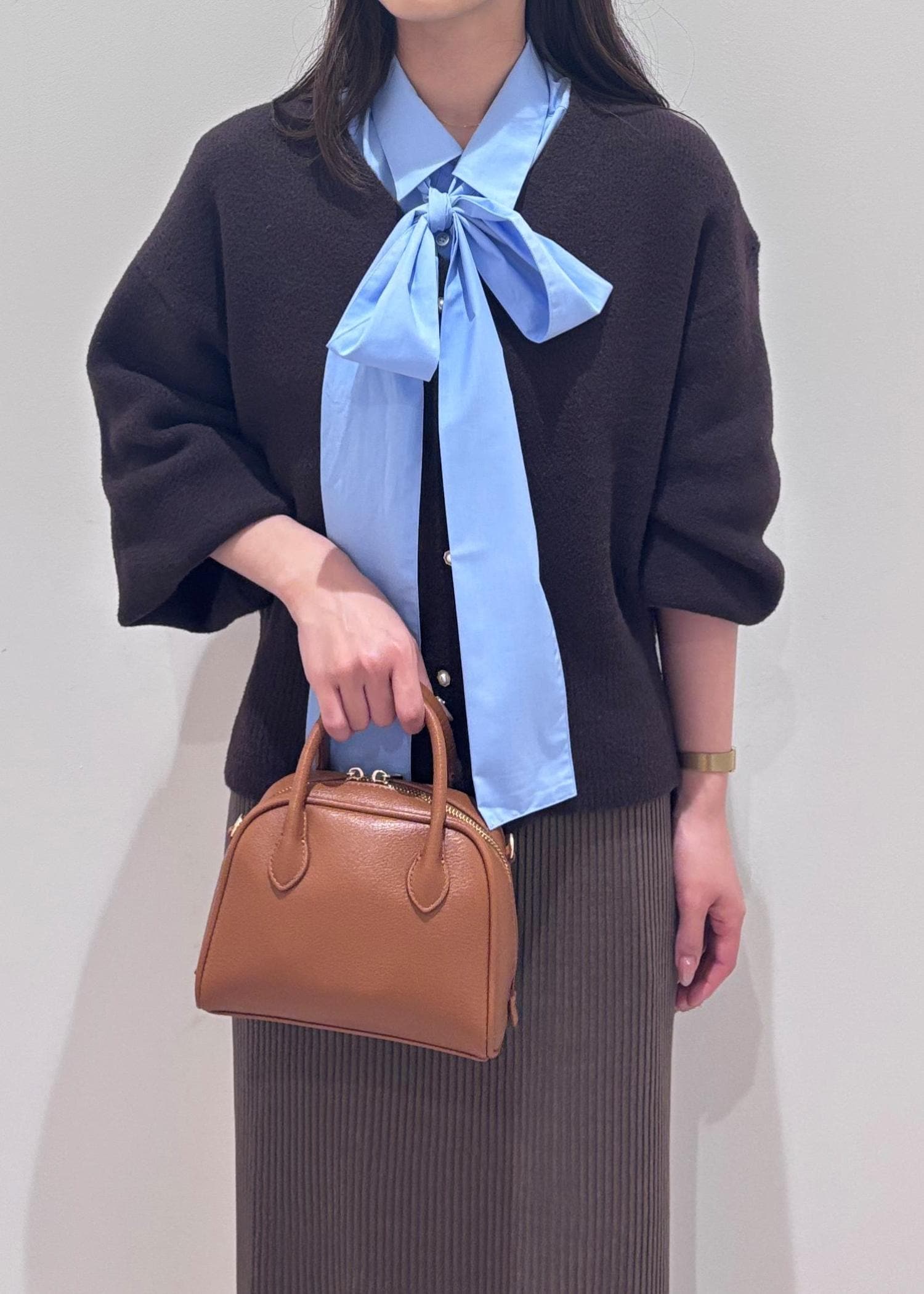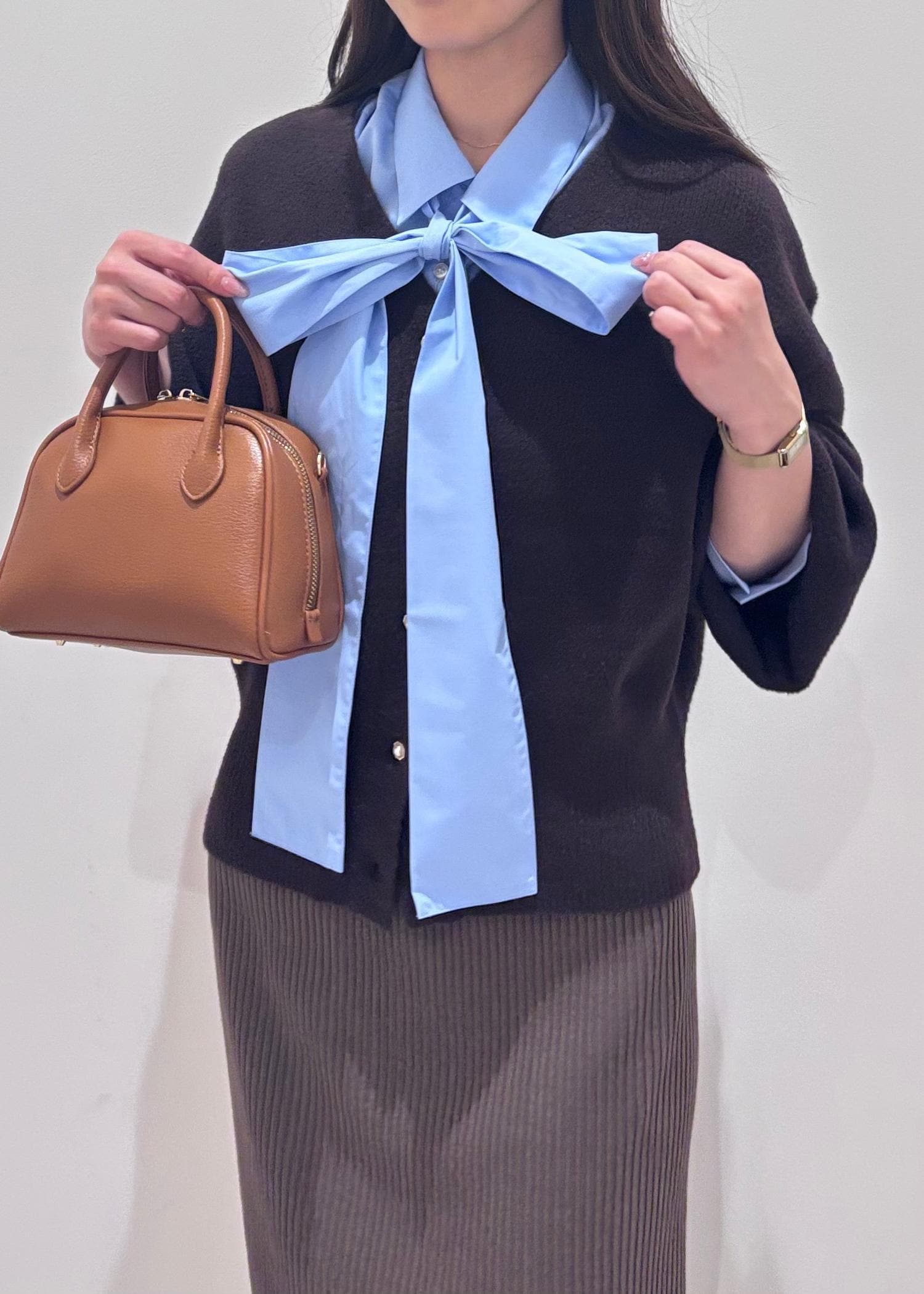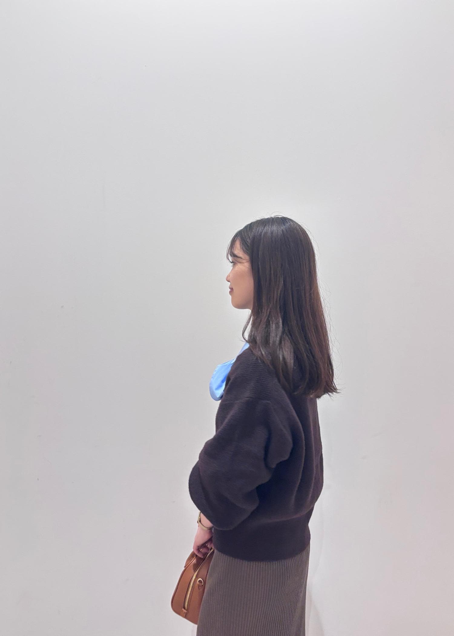 この秋流行りのブルーとブラウンで秋コーデを組んでみました。シャツは襟付きなので、カチッとした場面や、オフィスカジュアル、でもお使いいただけます。