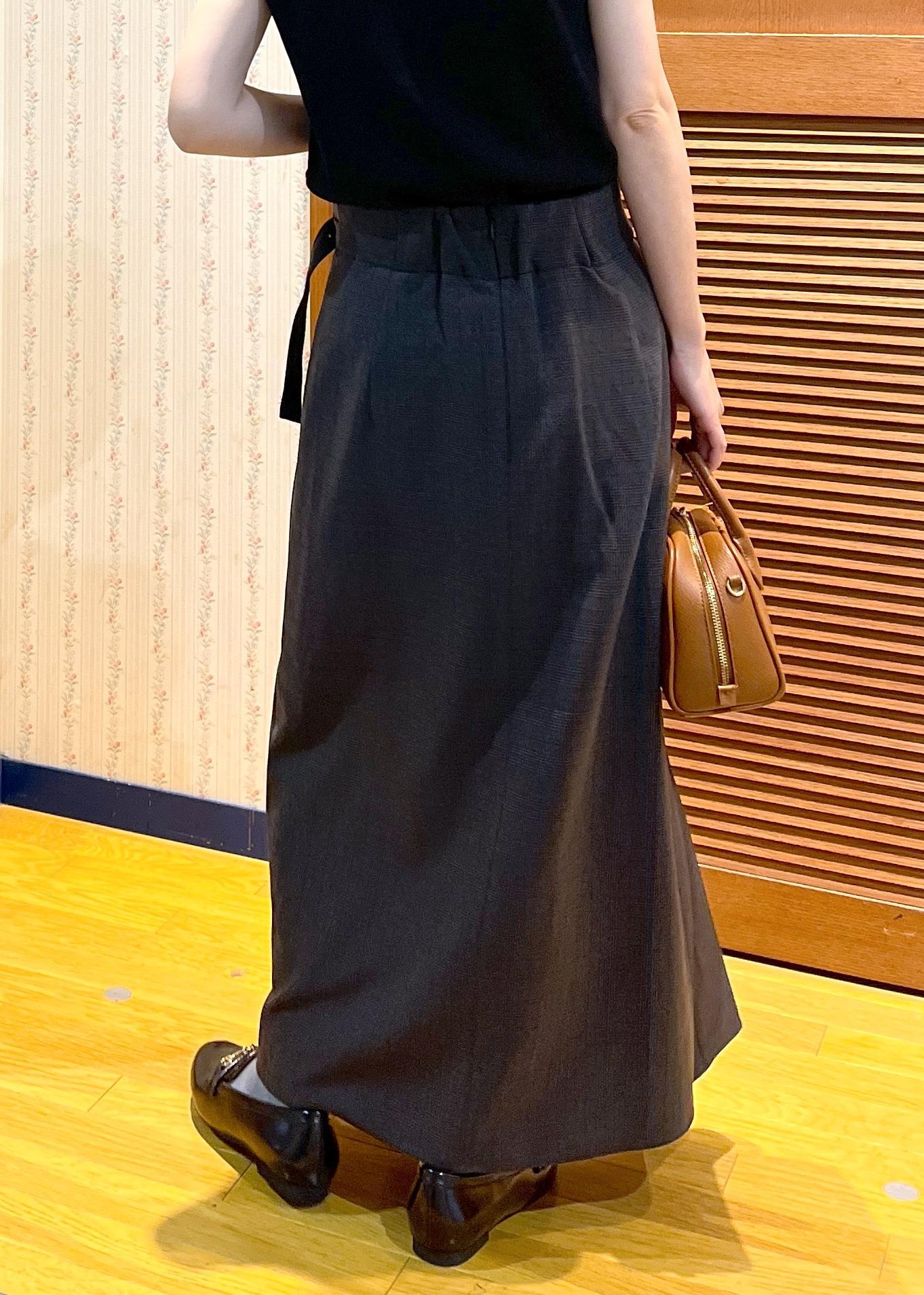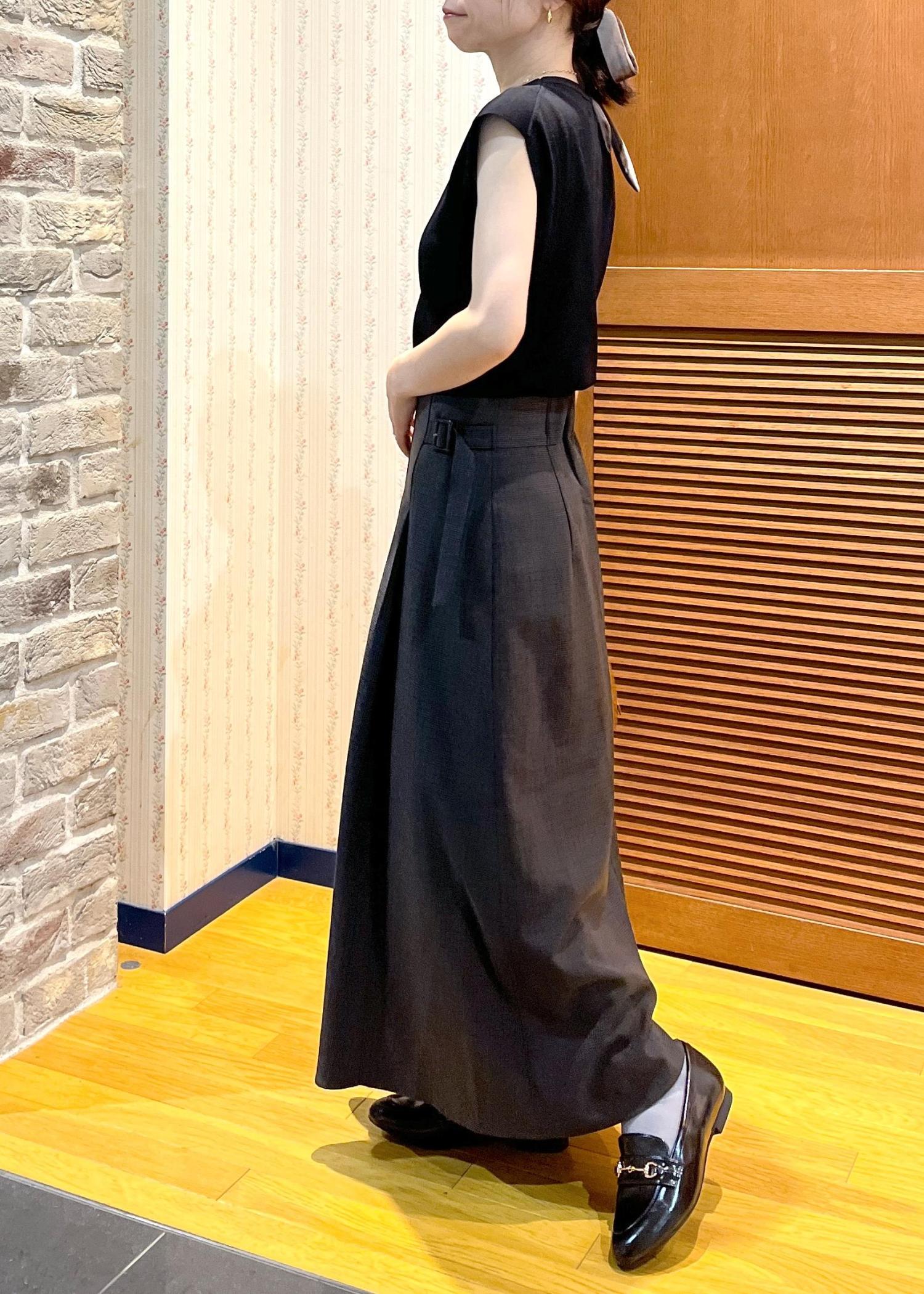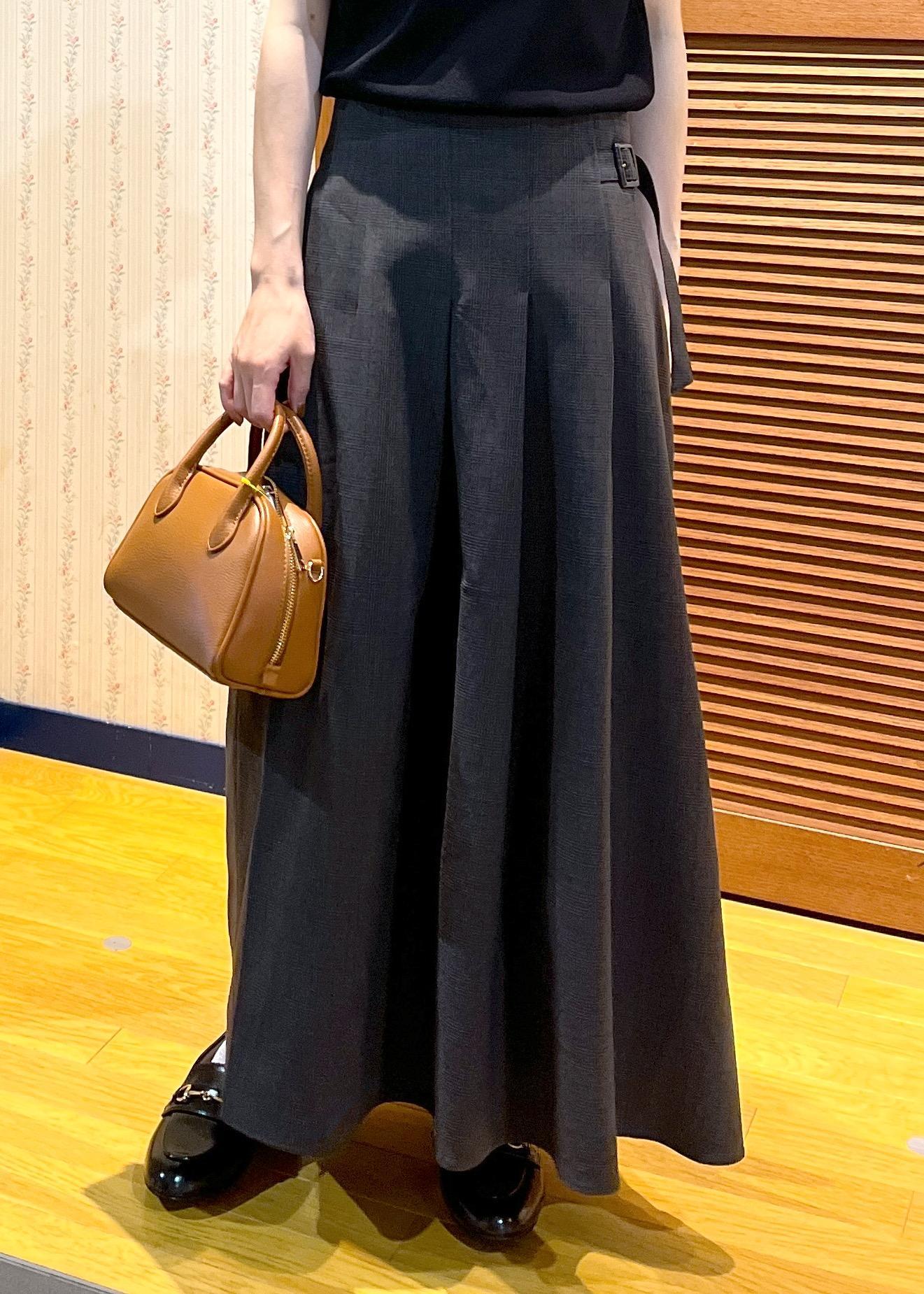 くるぶしが出るくらいの長めの丈感ですが、サイドにベルトもありメリハリがあってすっきりと見えます。 -