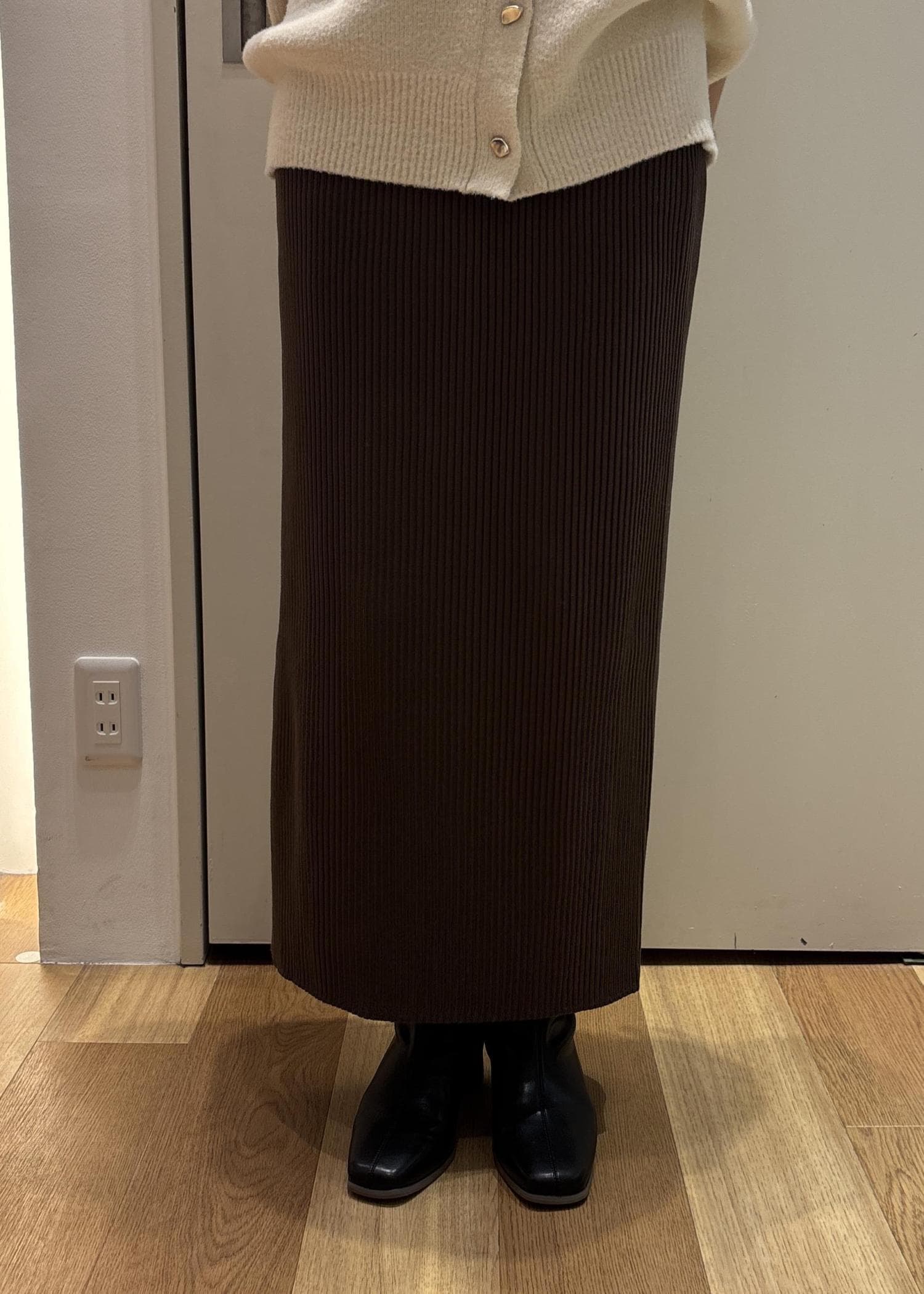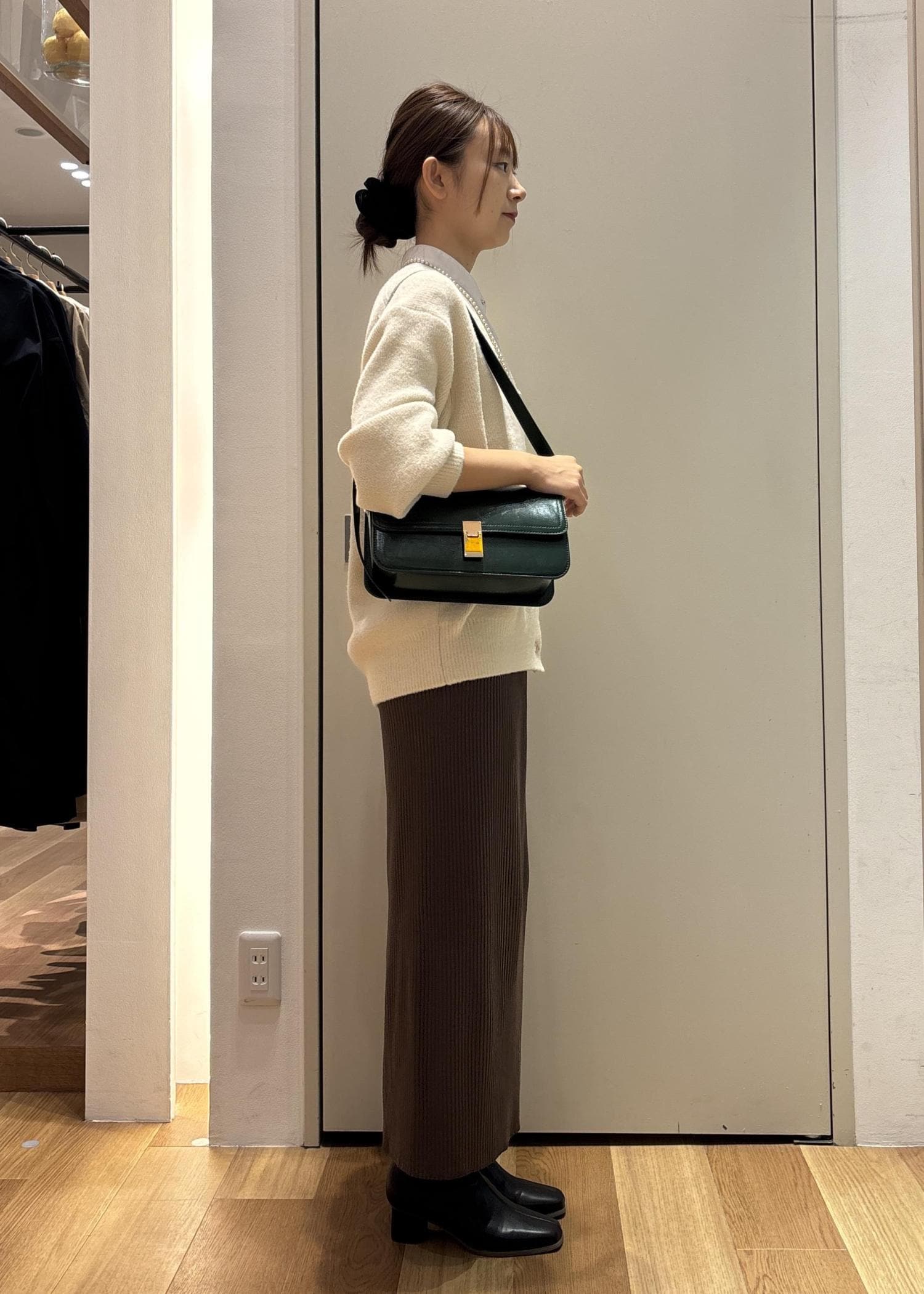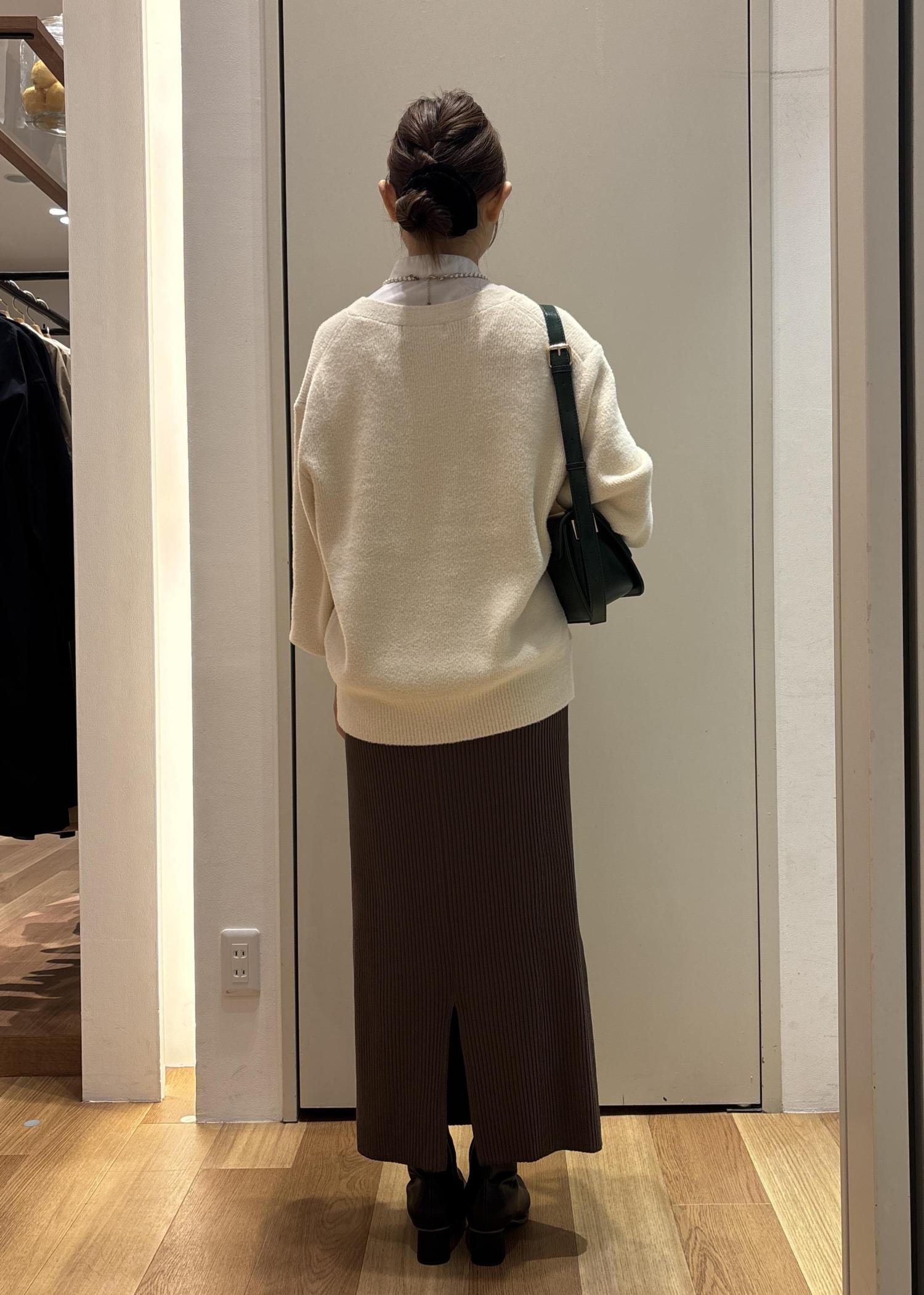 長めのカーディガンとスッキリとしたスカートがメリハリをつけてくれます。