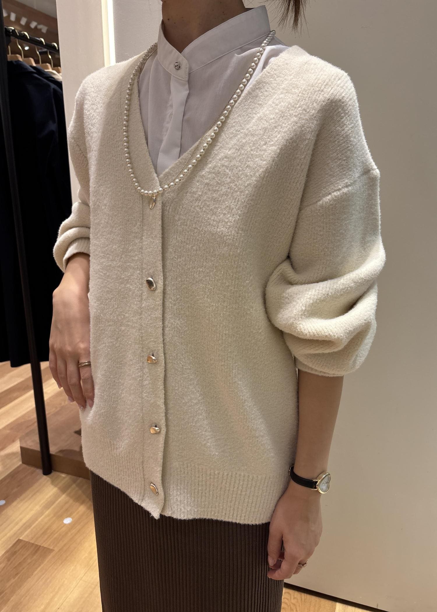 ホワイトのふわふわカーディガンにブラウンのスカートを合わせ柔らかい女性らしいコーデにしました。