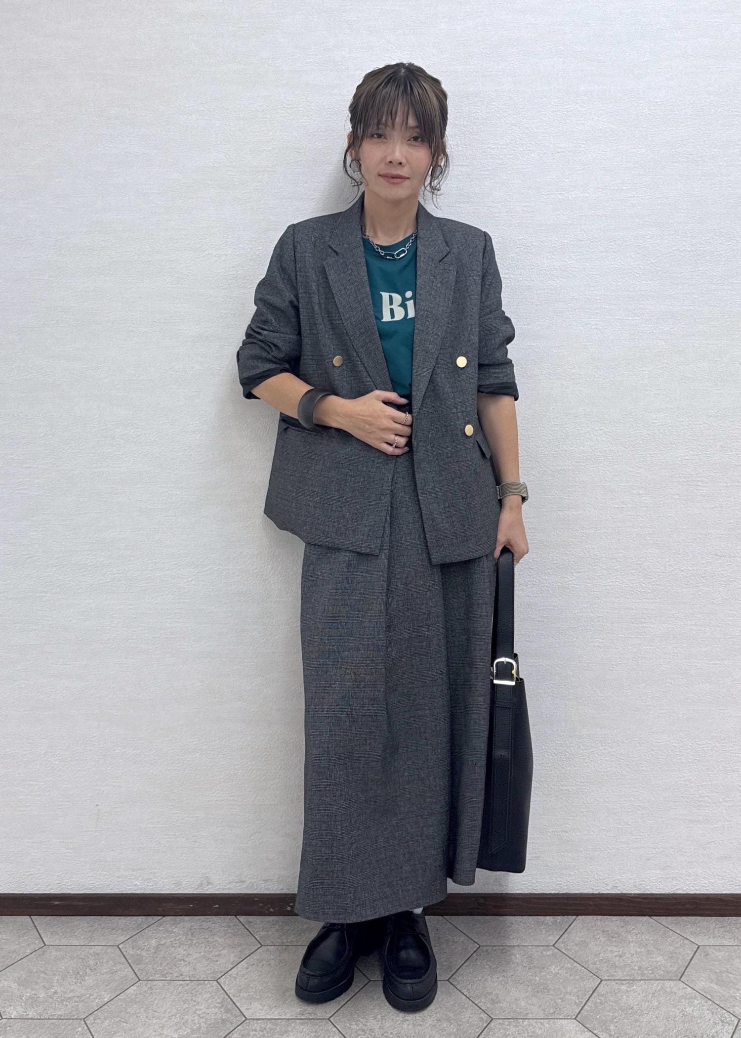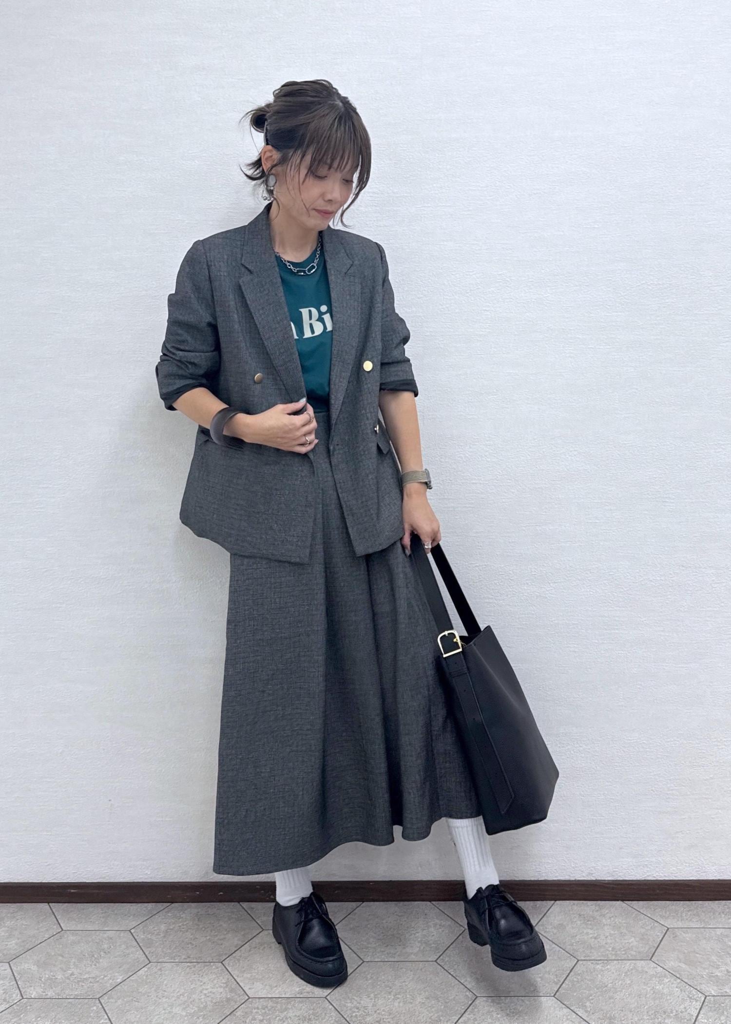 カッチリ感もありながら、フレアスカートが甘さもあり大人の女性を演出してくれるコーデにしました。