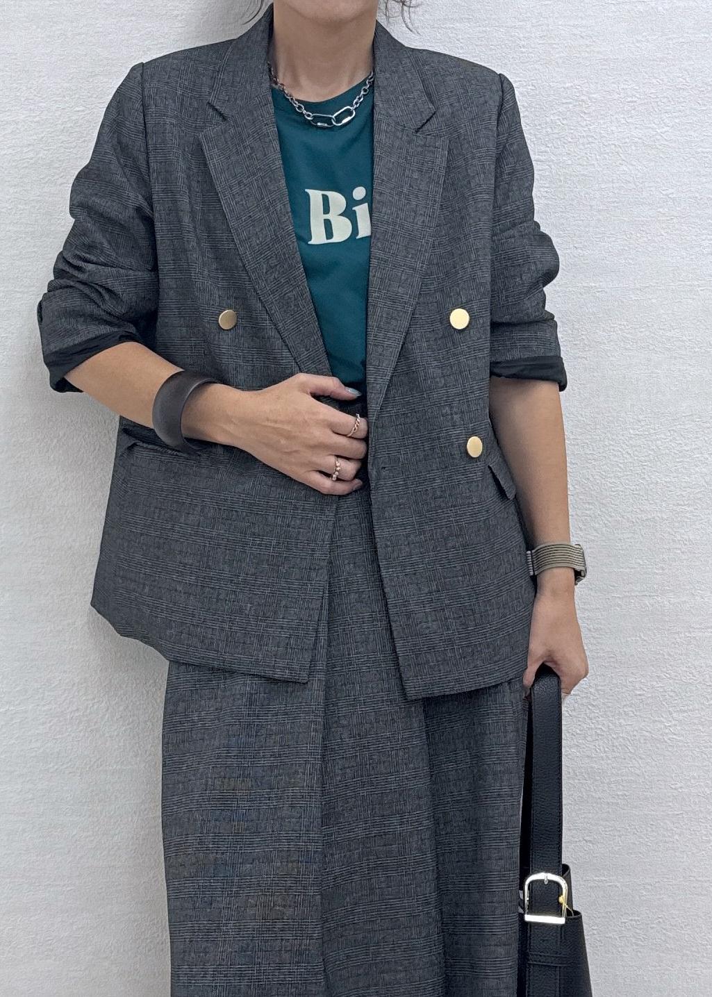 オンオフ問わずに使える金ボタンジャケット。ウールライクな素材なので、秋口の羽織りにピッタリ。