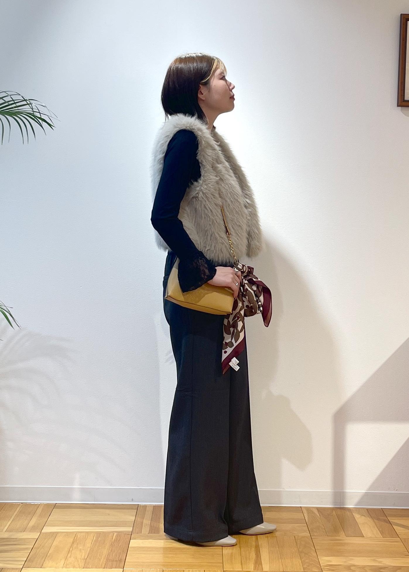 コーデの色味が落ち着いた印象になるので、バッグ×スカーフでアクセントをつけました¨̮⃝