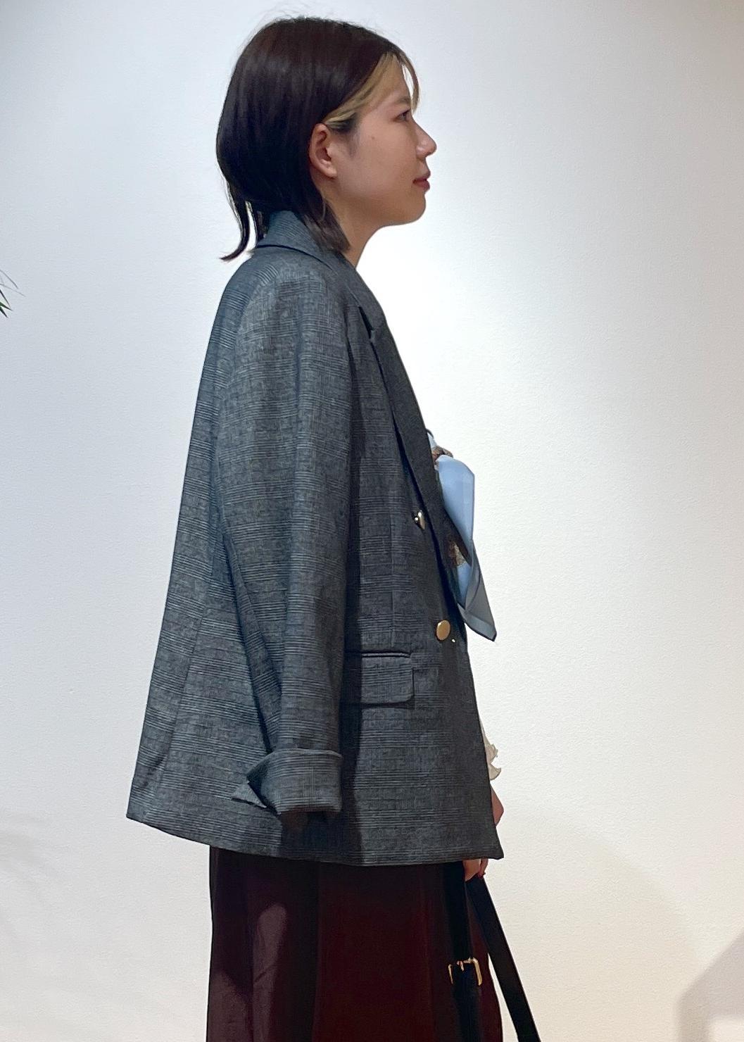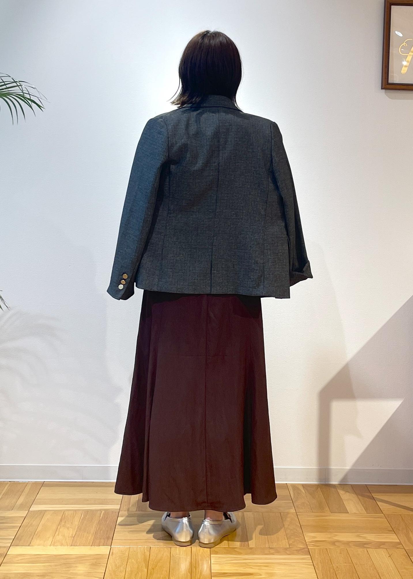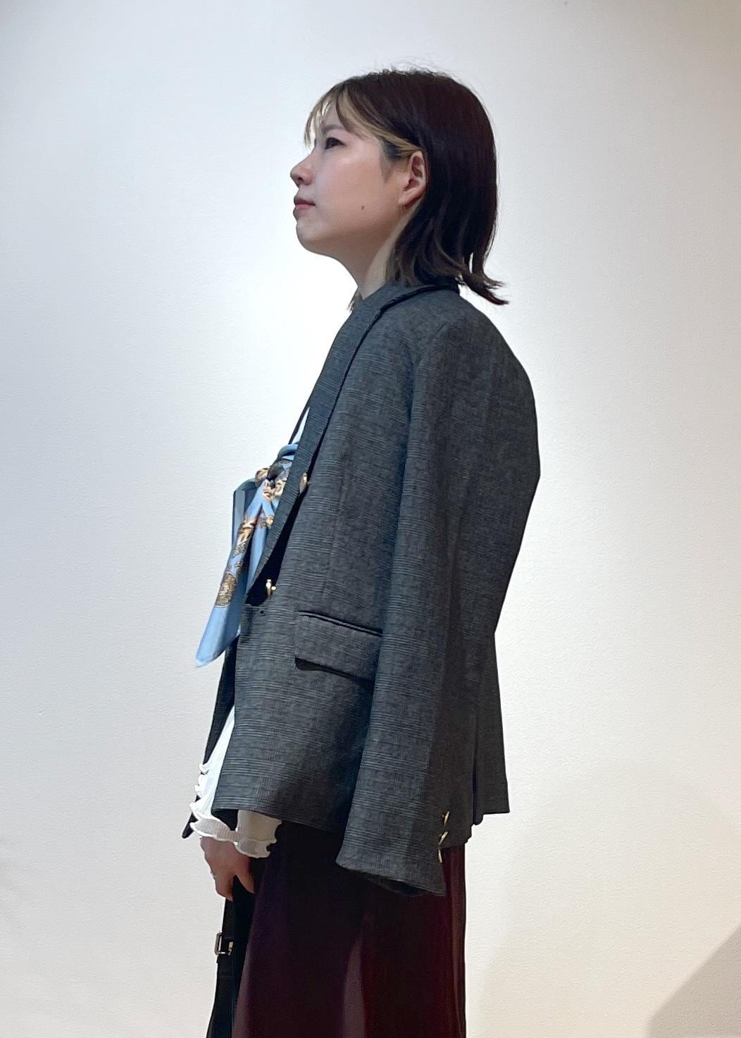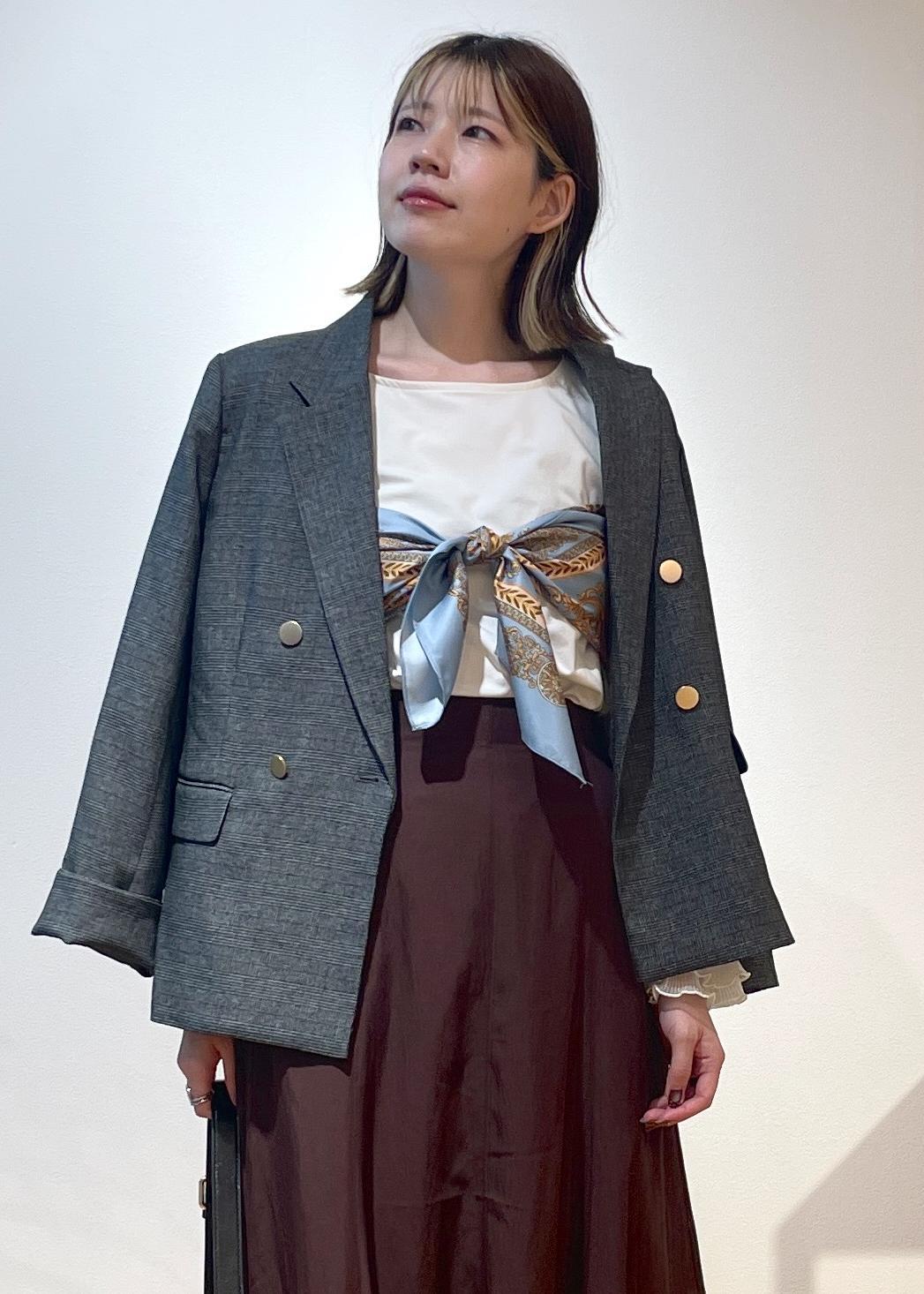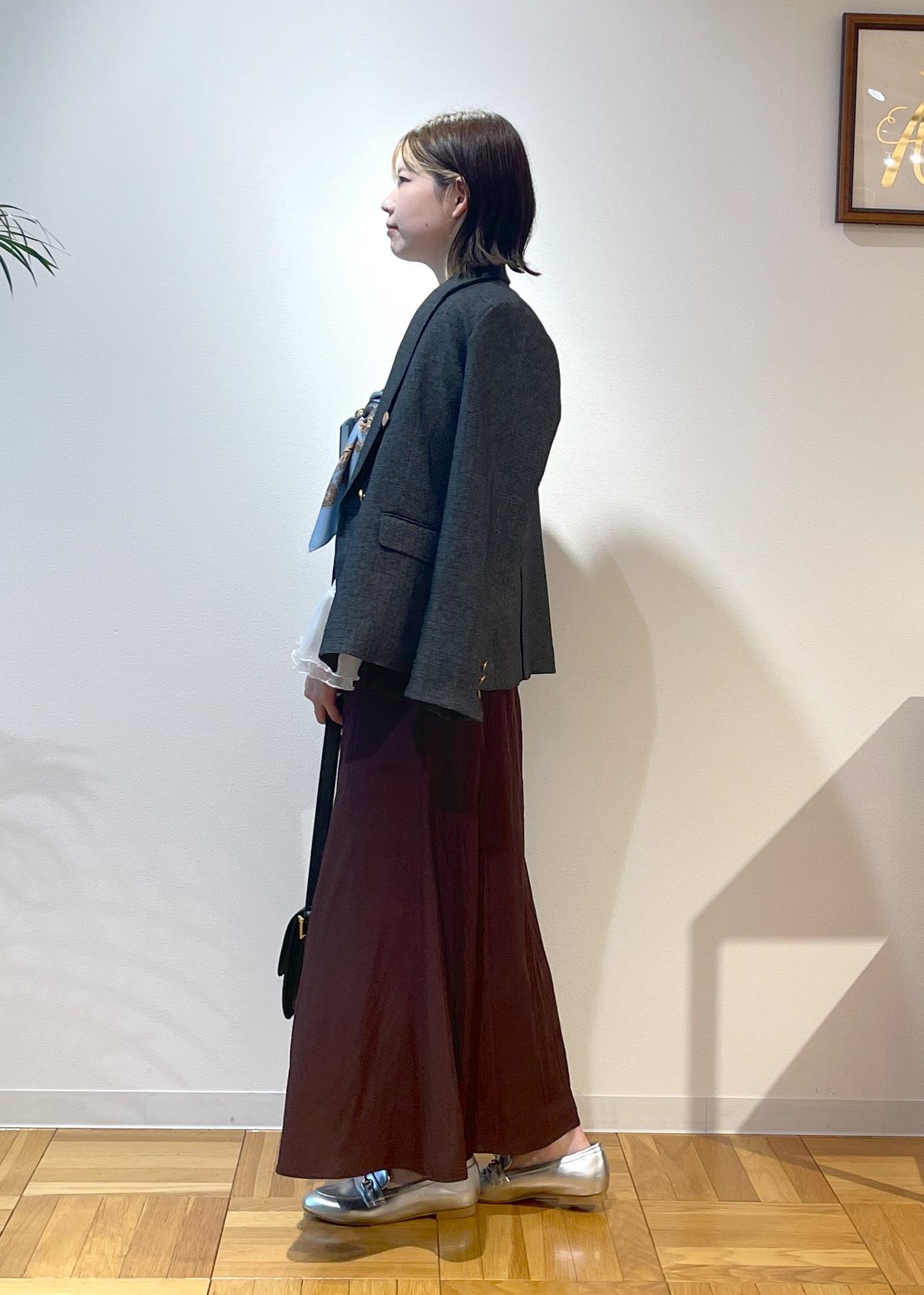 ジャケットとスカートが落ち着いたトーンなので、トップス