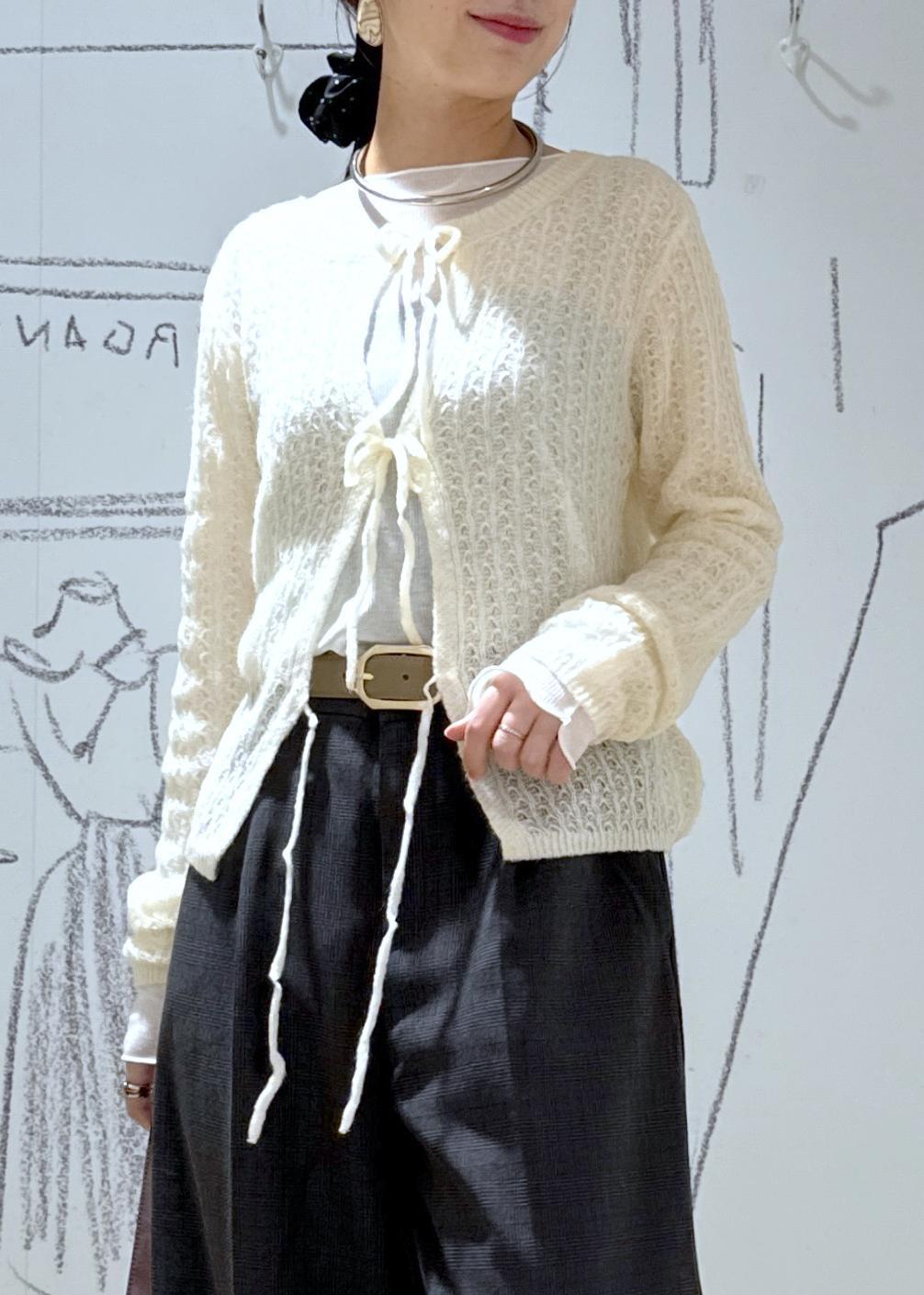 身幅はゆとりがありますが袖幅は細く手元に溜まるルーズな長さ。フロントはリボン結びにしたりそのまま垂らしたりしても雰囲気があります。女っぽさを出したい時は是非着てほしいアイテムです。