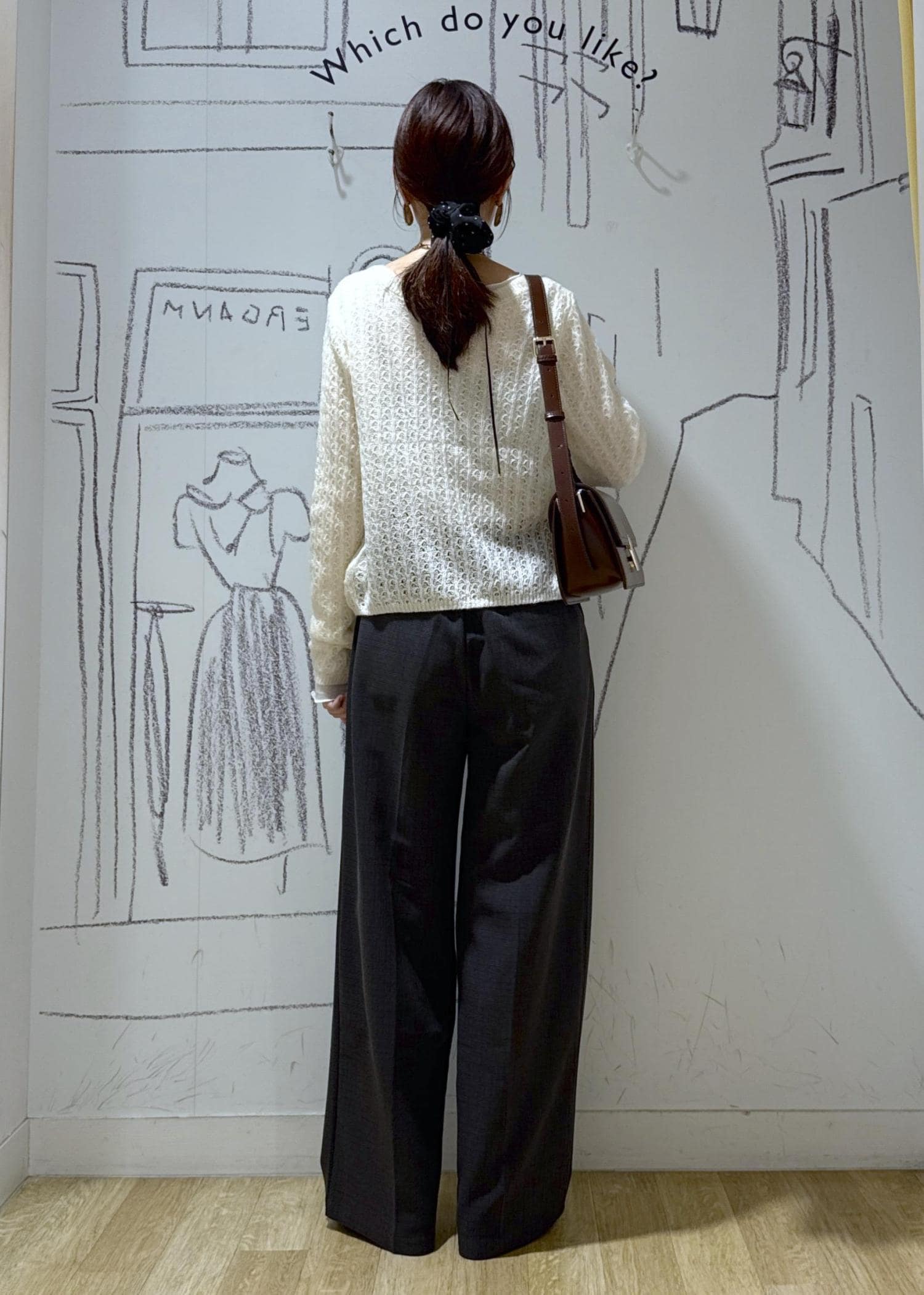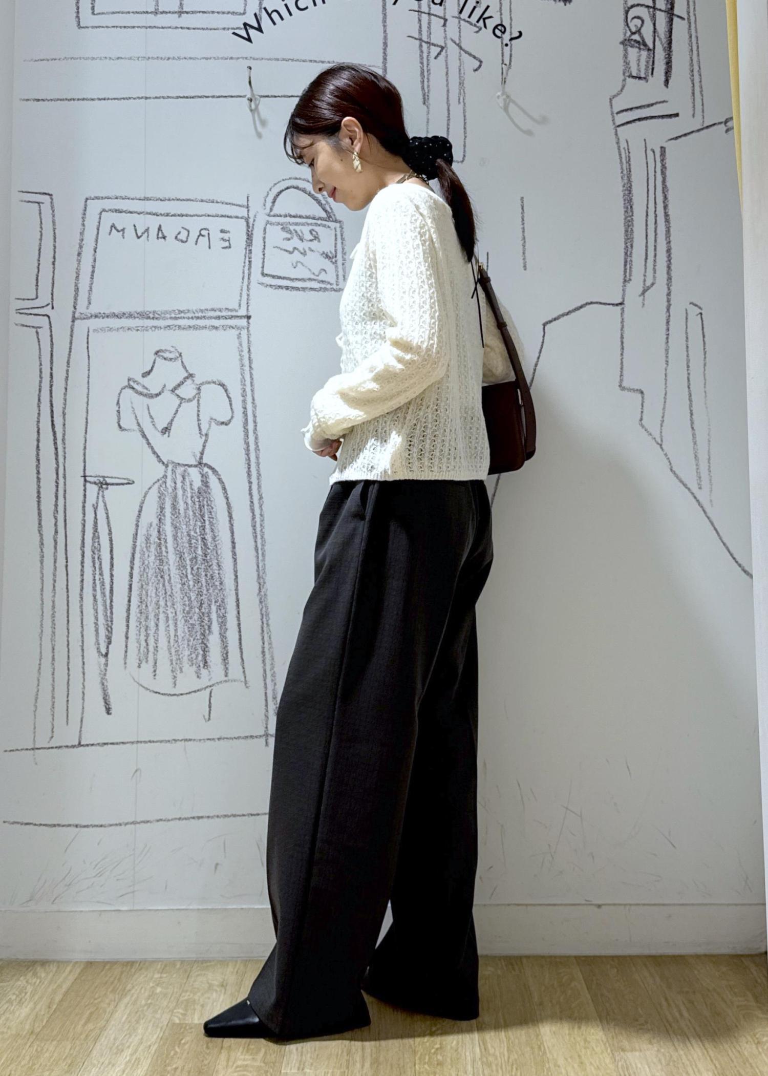 袖丈は指に掛かるロング丈なのでくしゅっと着るのがお勧め。薄手で透け感があるのでスタイリングに軽さを出してくれます。女性らしさのあるボートネックはちょうど鎖骨が隠れるくらいの開きです。