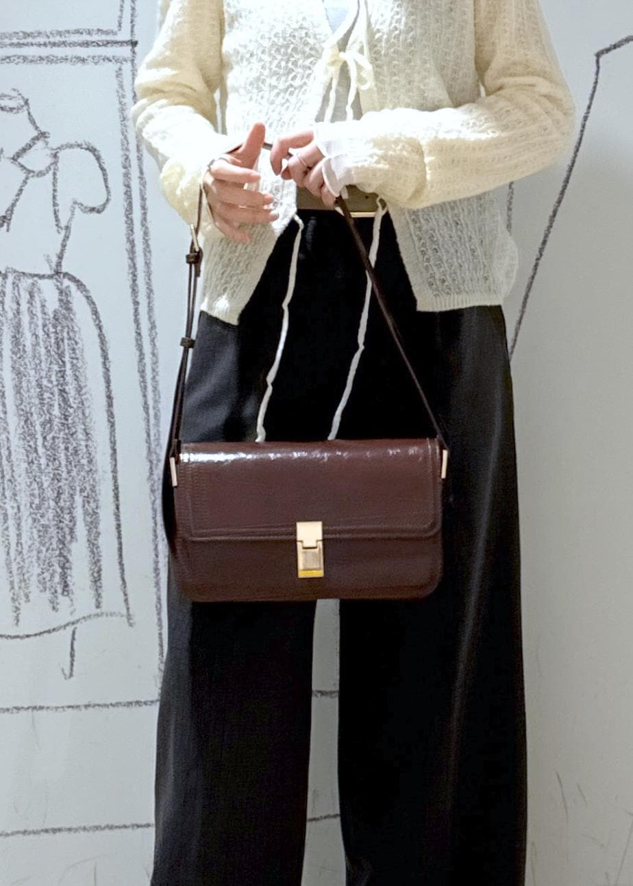 光によって艶も感じられるセミマットな質感。横長バッグは持つだけでトレンドスタイルに早変わり。軽さがあるので斜め掛けで使っても肩が疲れにくいです。荷物は財布、スマホ、ハンカチ、ミニポーチなど必要最低限が入るサイズ感。