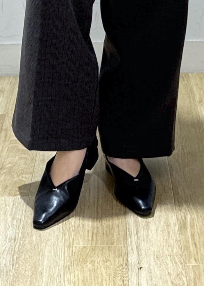 ポインテッドトゥやVカットデザインなど足元をシャープに見せてくれます。比較的柔らかさのある素材。買うならジャストサイズを選びます。