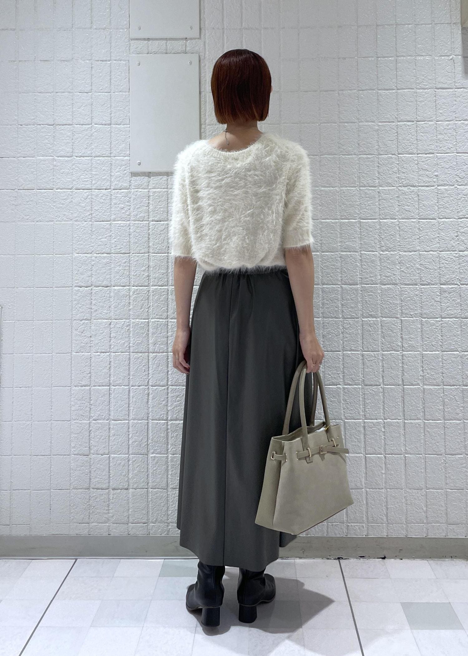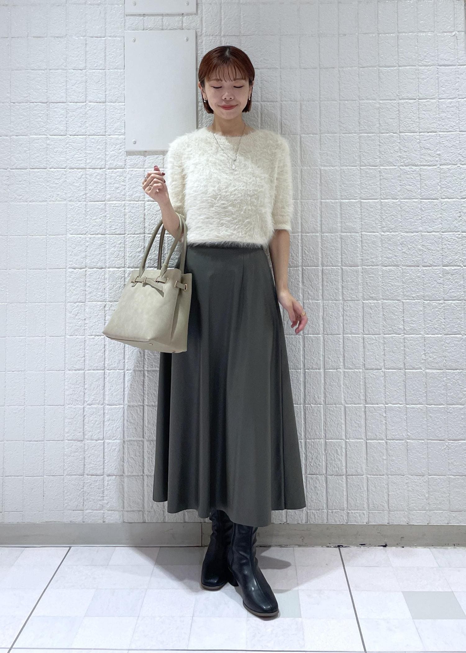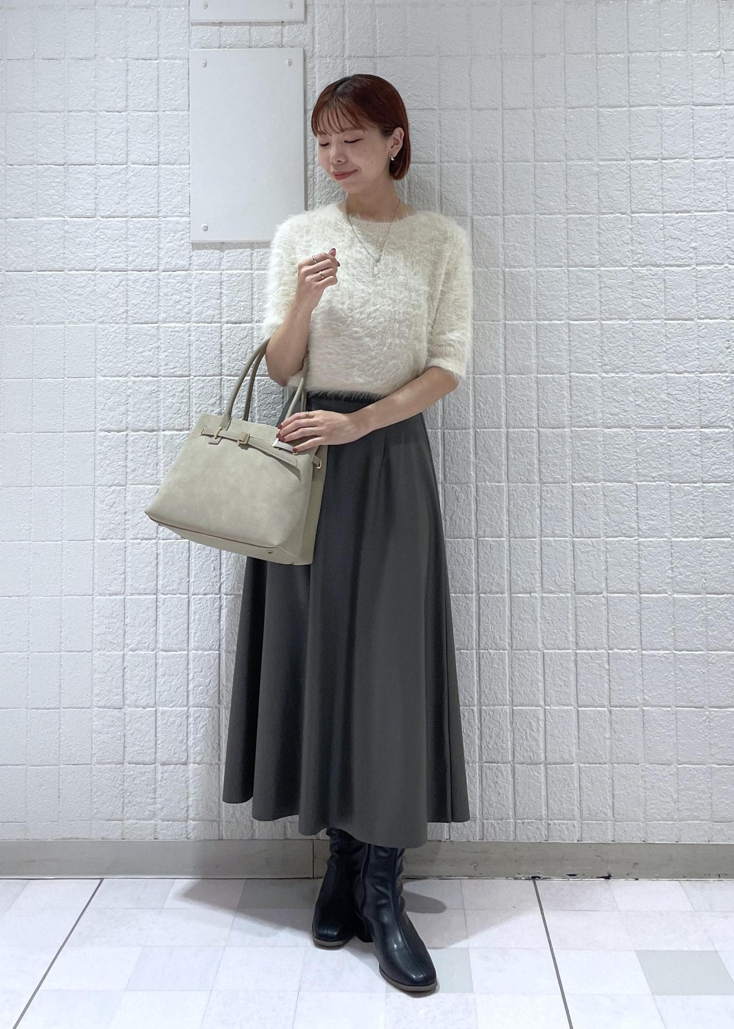 柔らかなシャギーニットに、レザースカートを合わせた秋の大人カジュアルコーデ。
