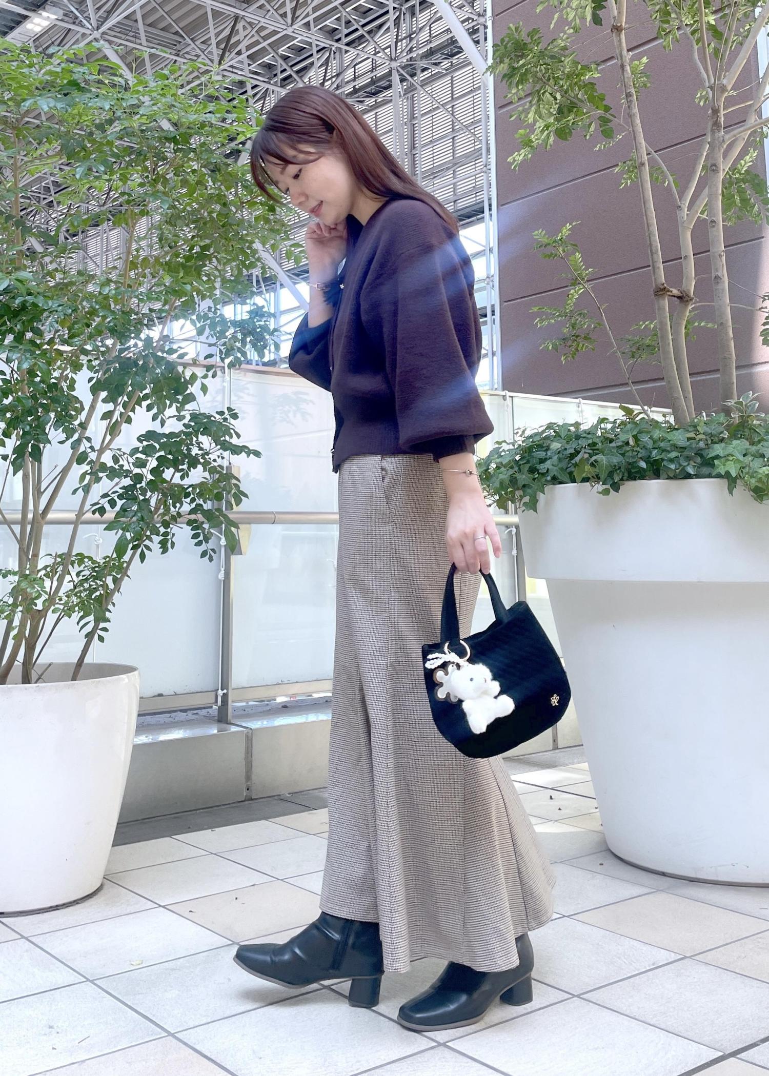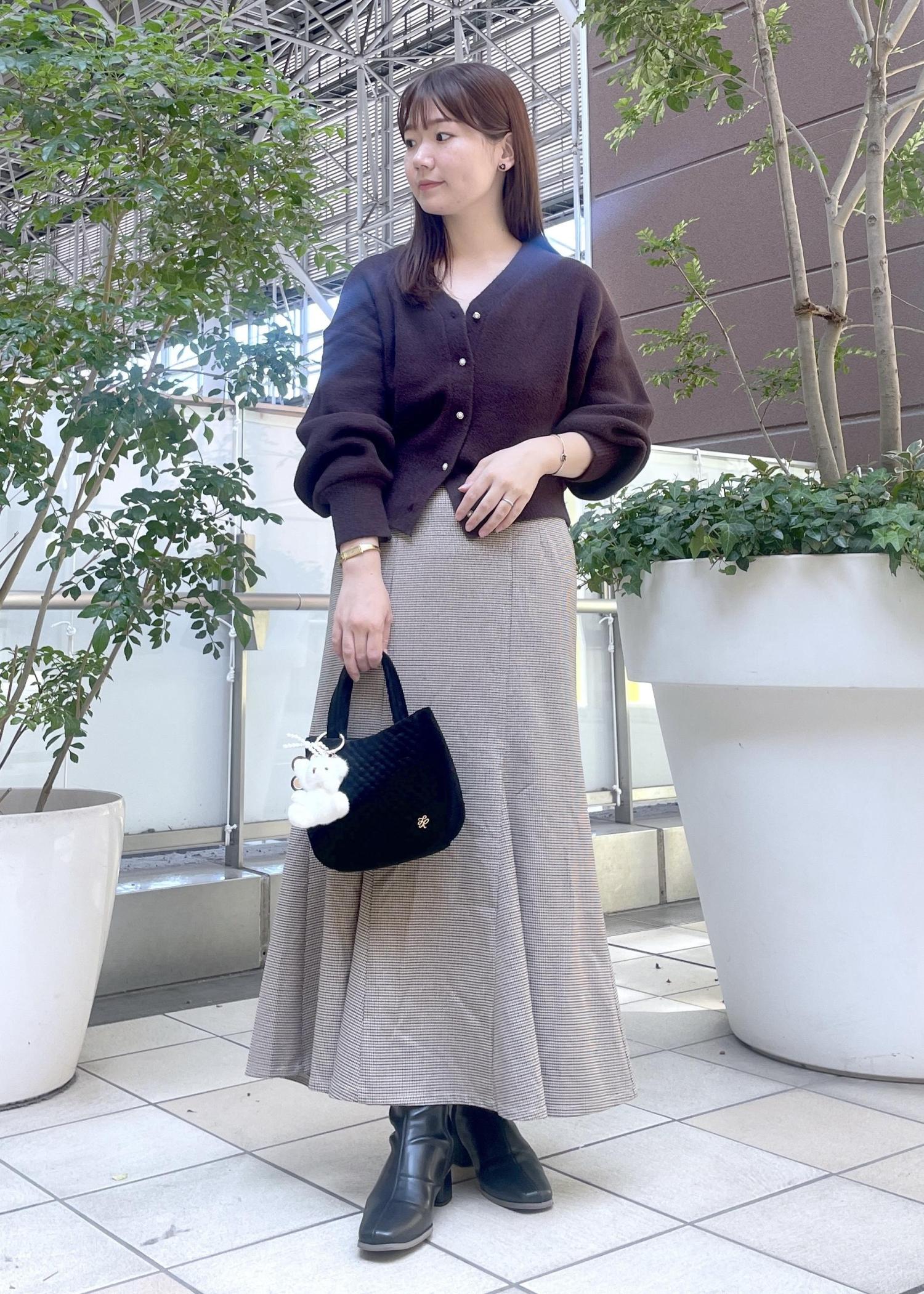 パールボタンのカーディガンにマーメイドラインのスカートを合わせた大人でも着やすいフェミニンスタイルです。
