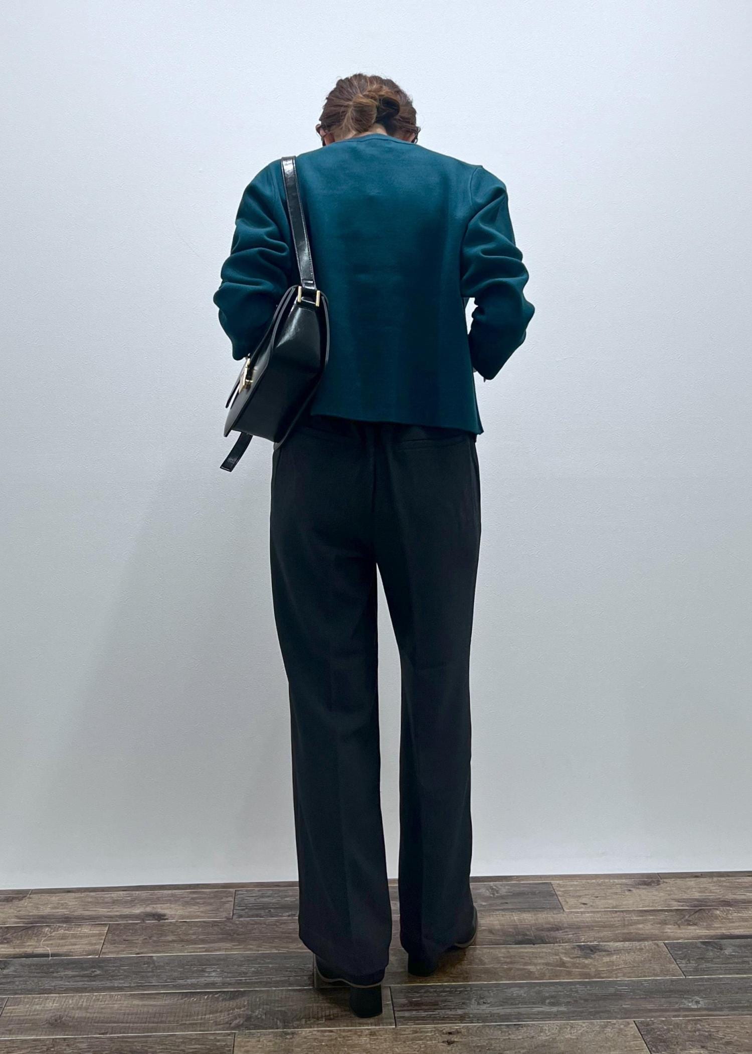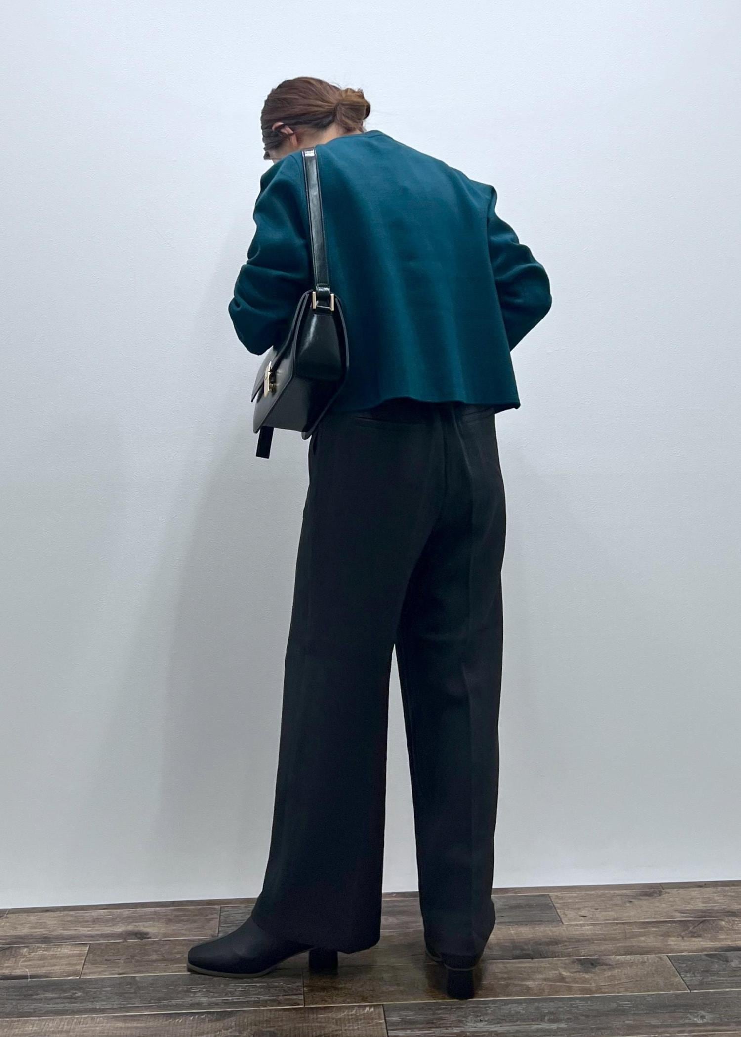 深みのあるグリーンにグレーを合わせたオフィスカジュアルコーデです。