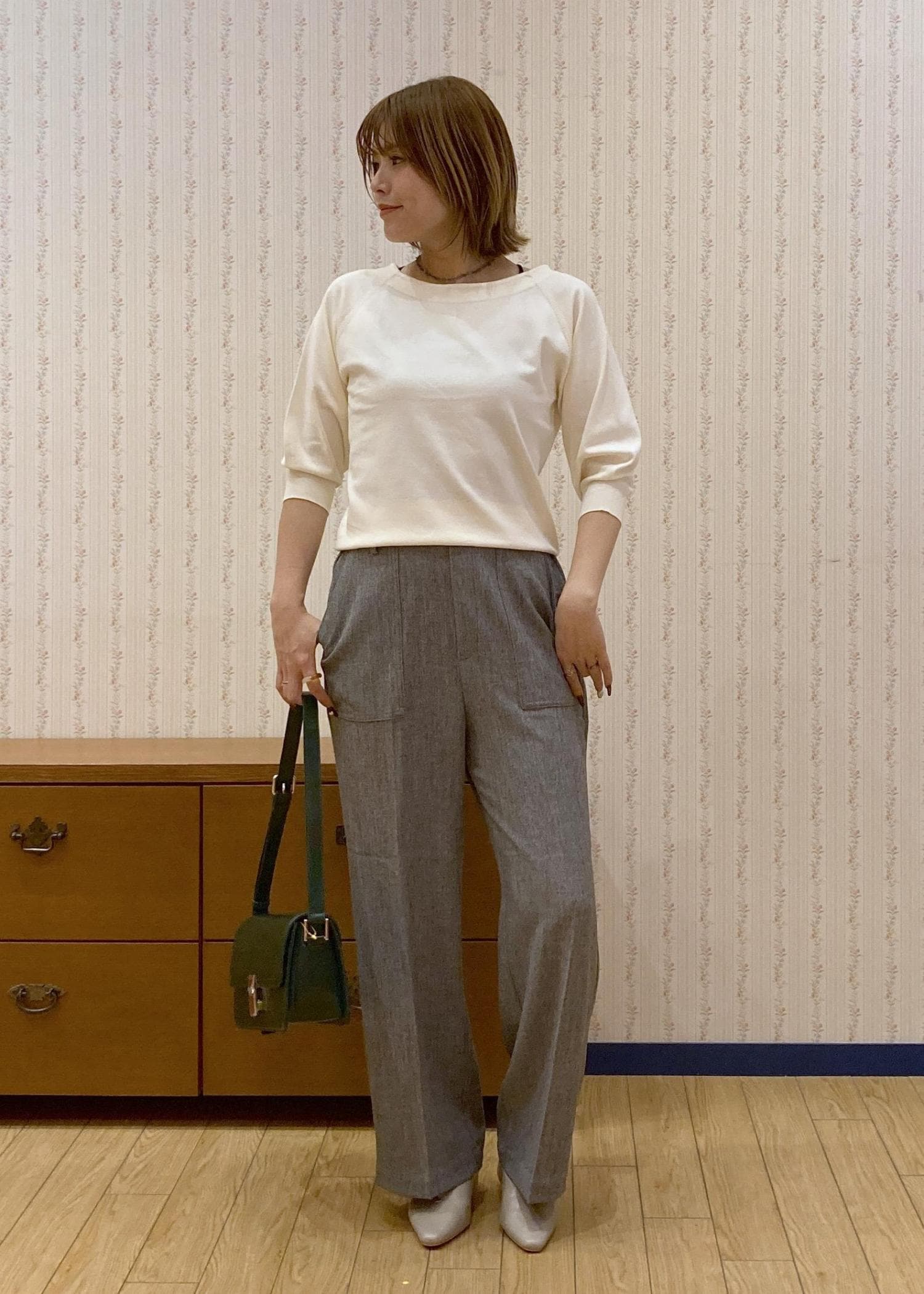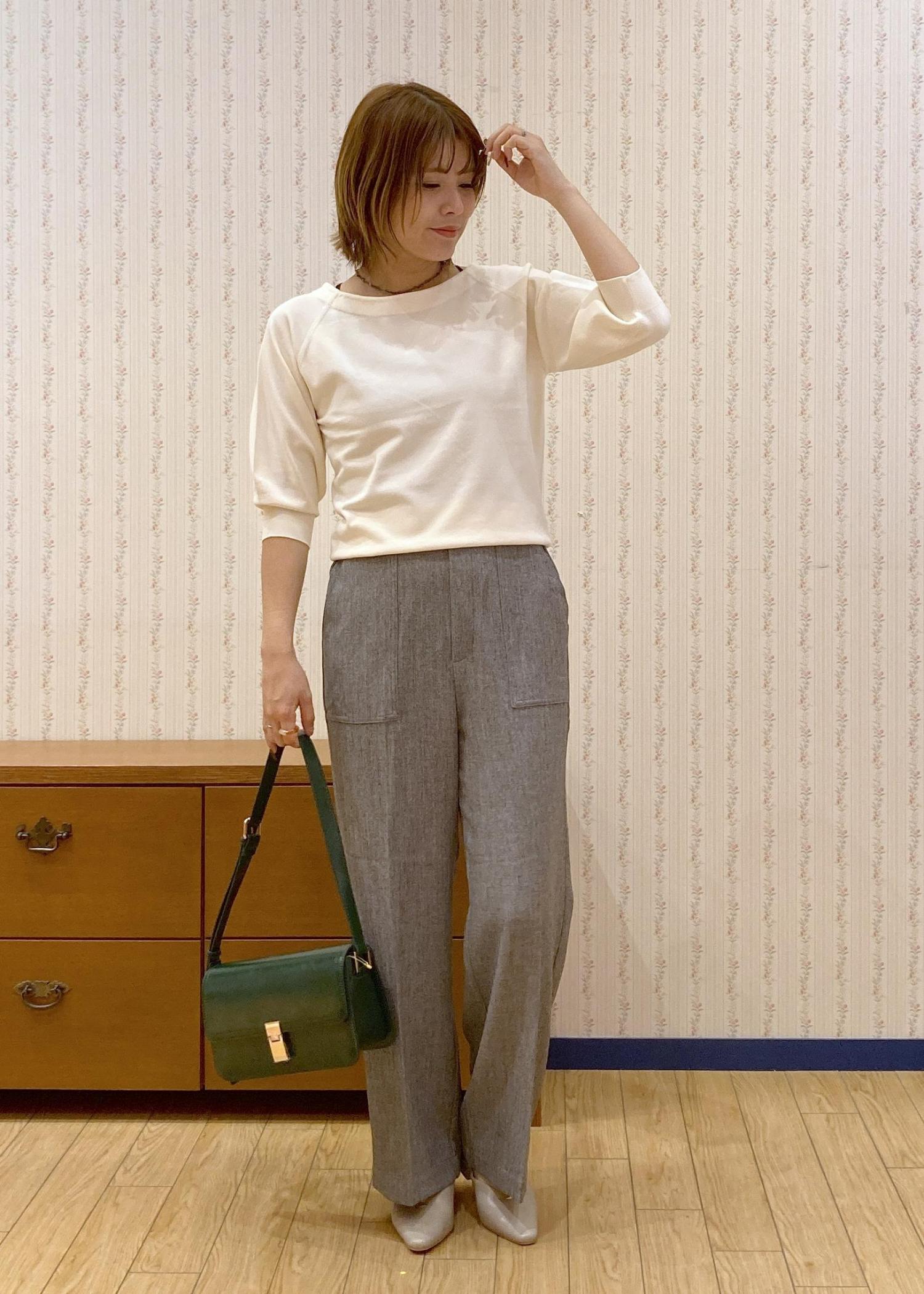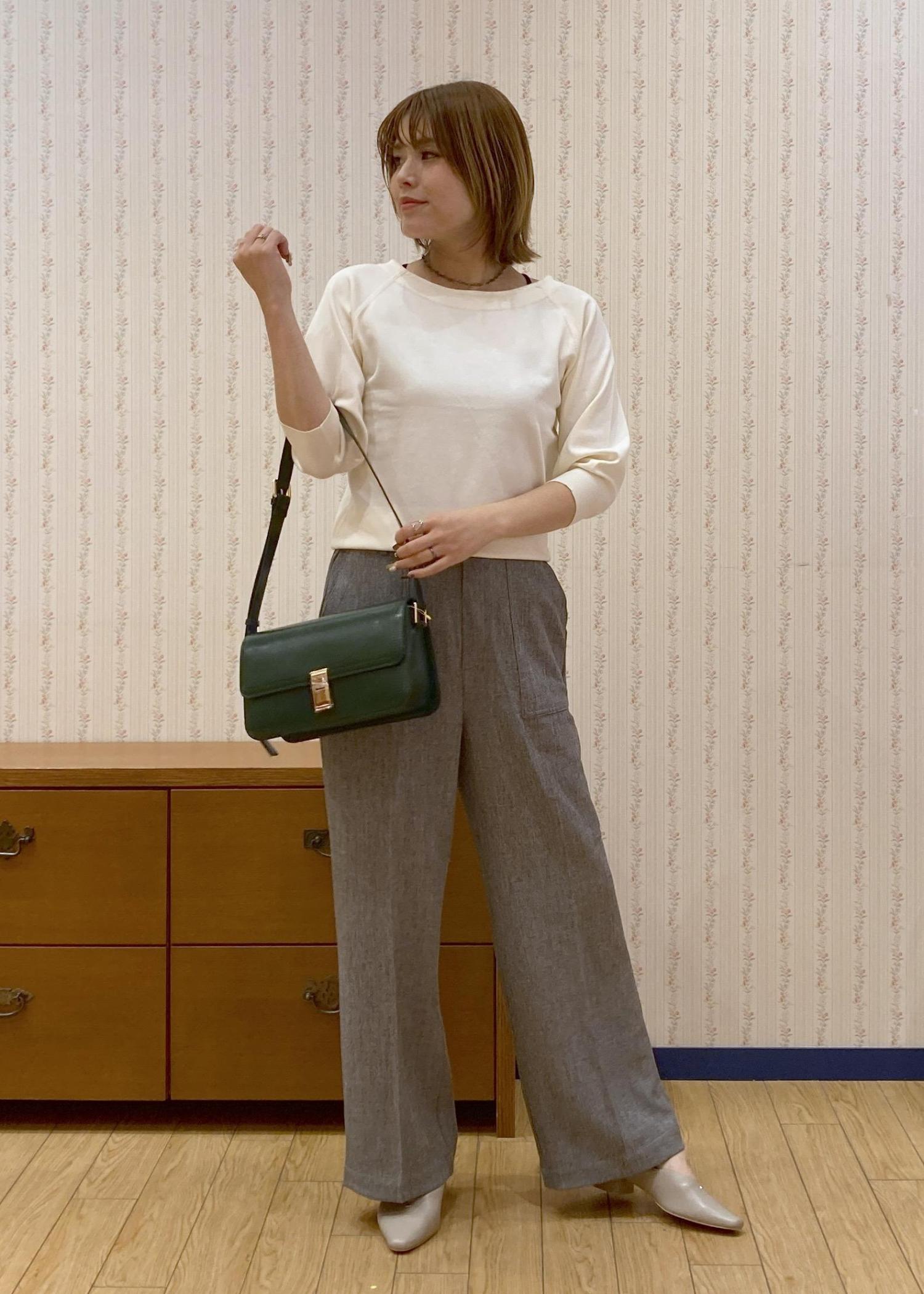 ホワイト×ライトグレーの淡色コーディネートにグリーンのバッグを差し色に使ったのがポイントです!