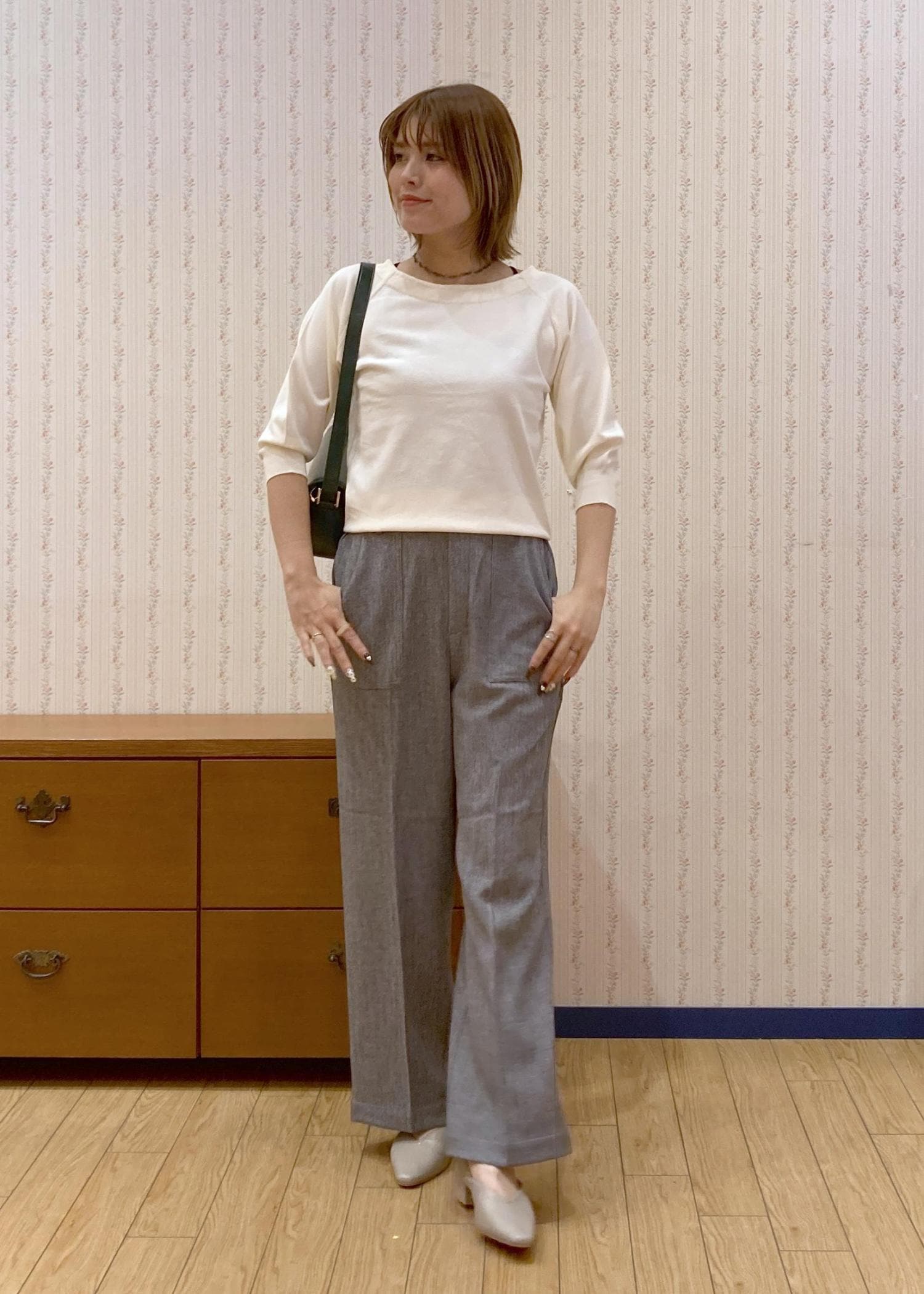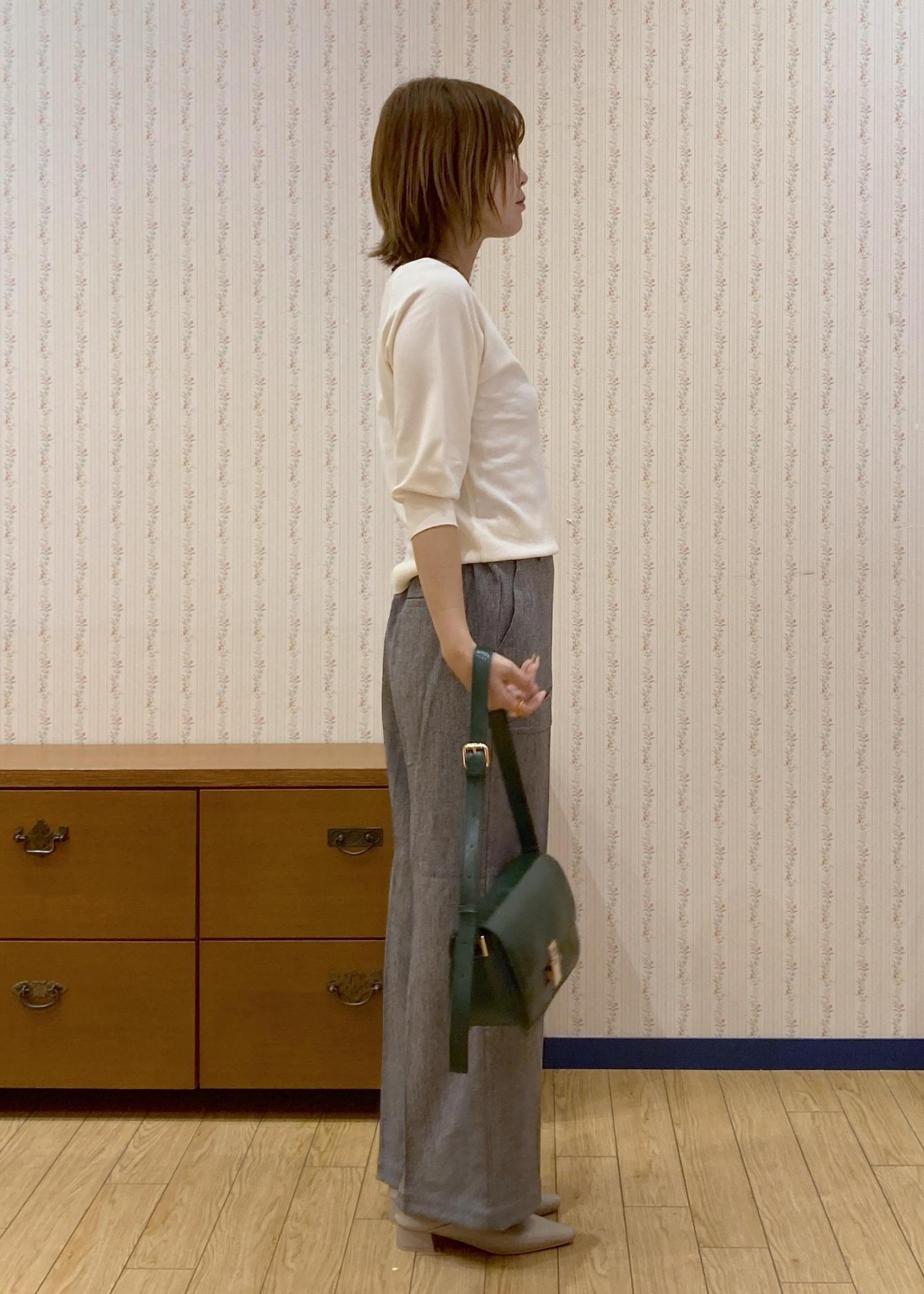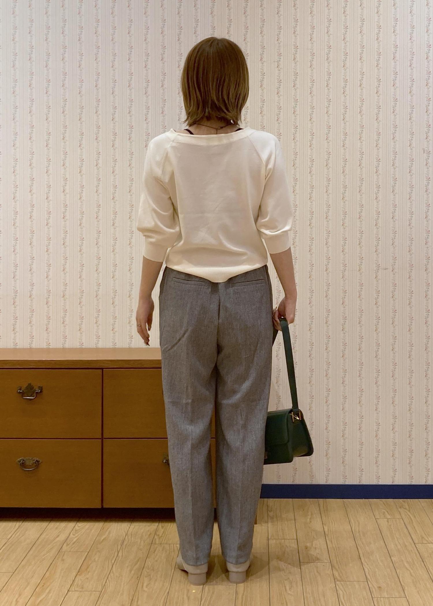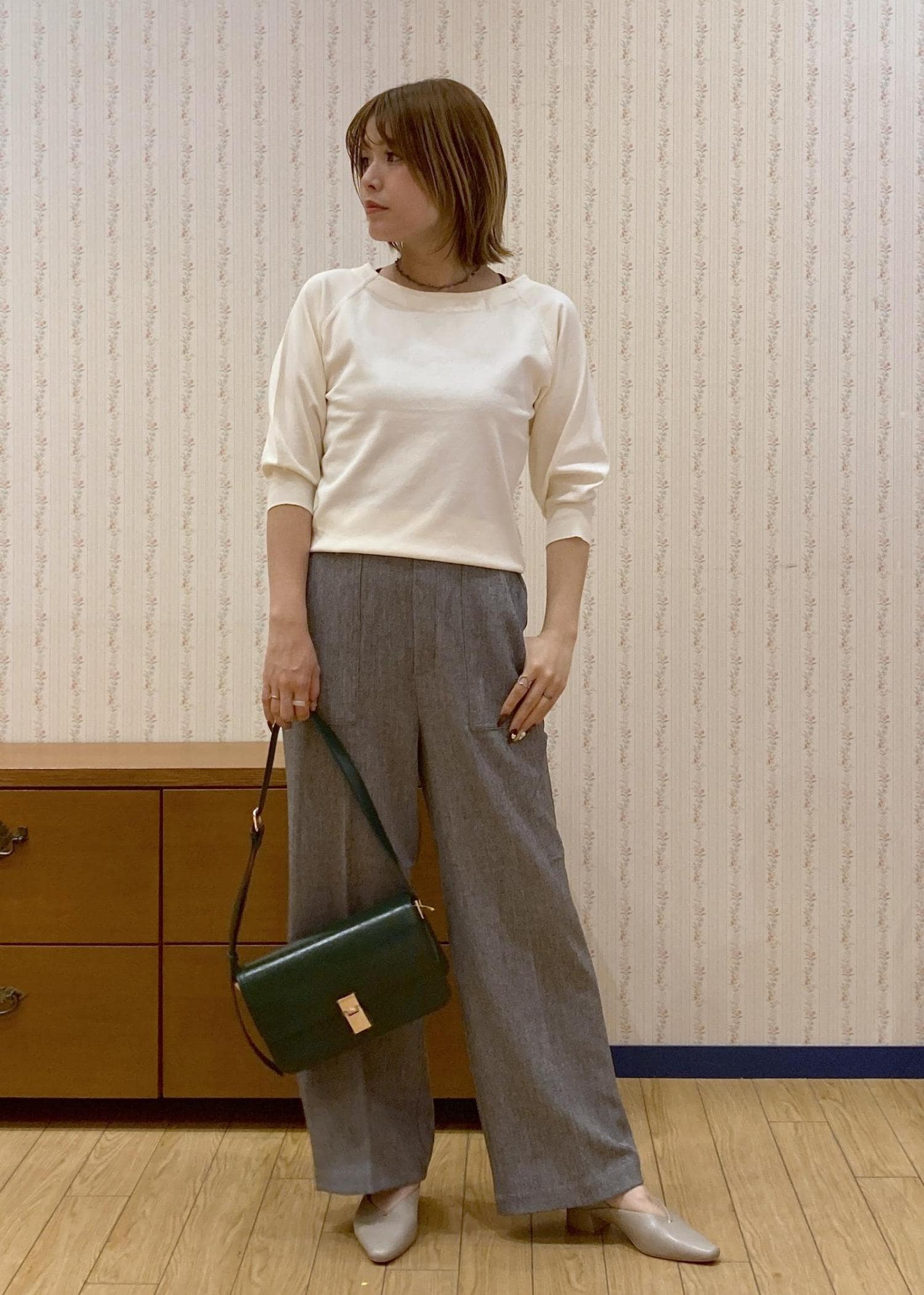 ホワイト×ライトグレーの淡色コーディネートにグリーンのバッグを差し色に使ったのがポイントです!