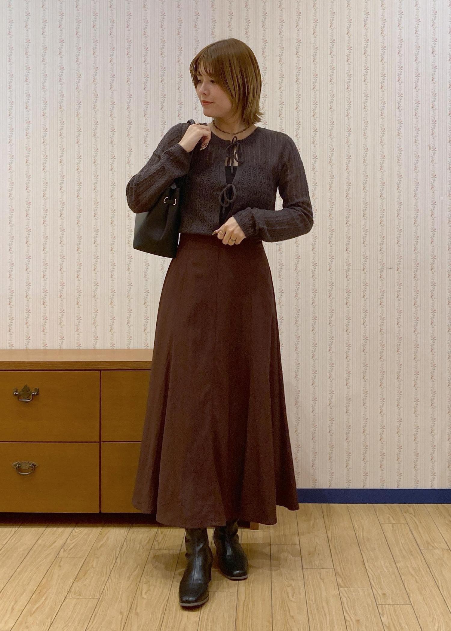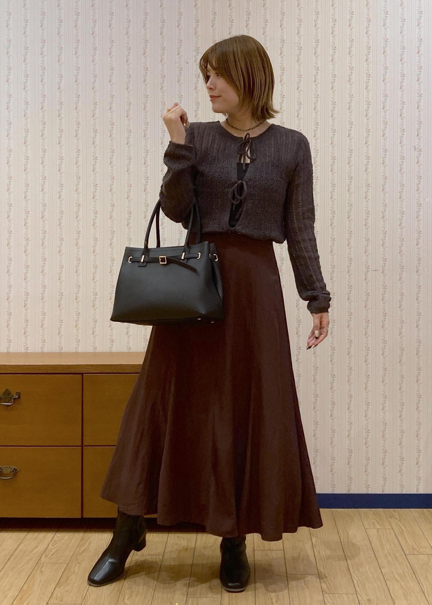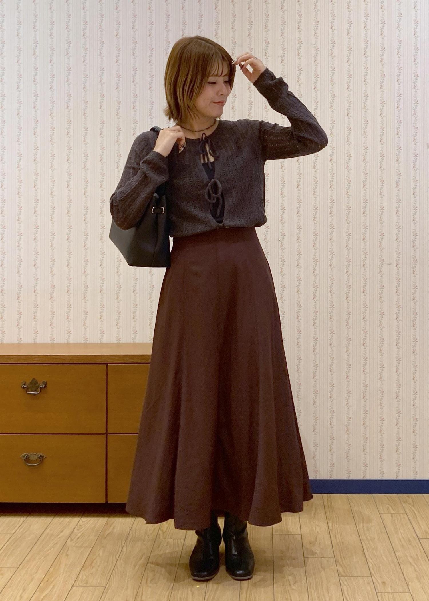 ブラウン×バーガンディの秋っぽい配色でまとめたフェミニンなデートコーディネートです。