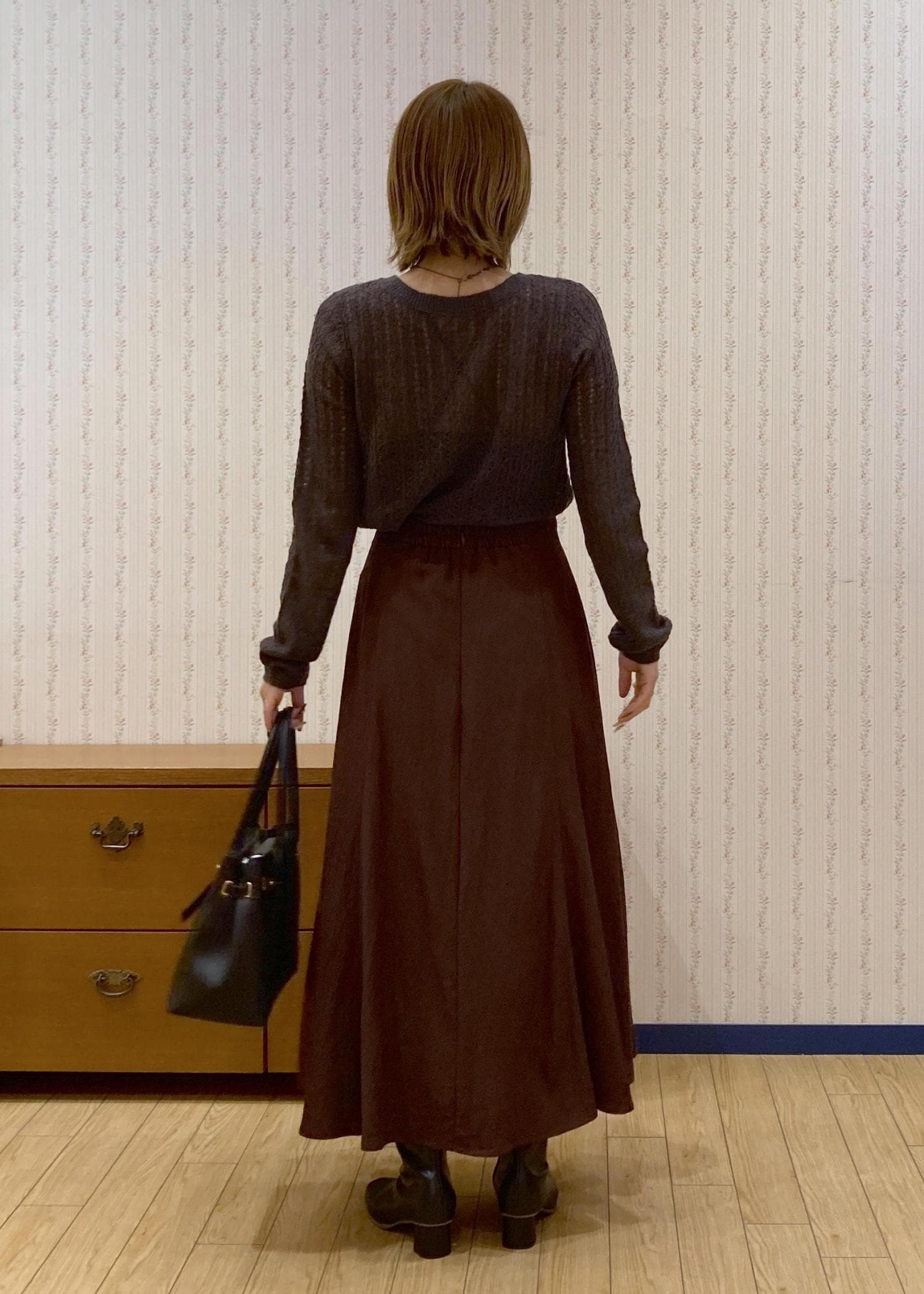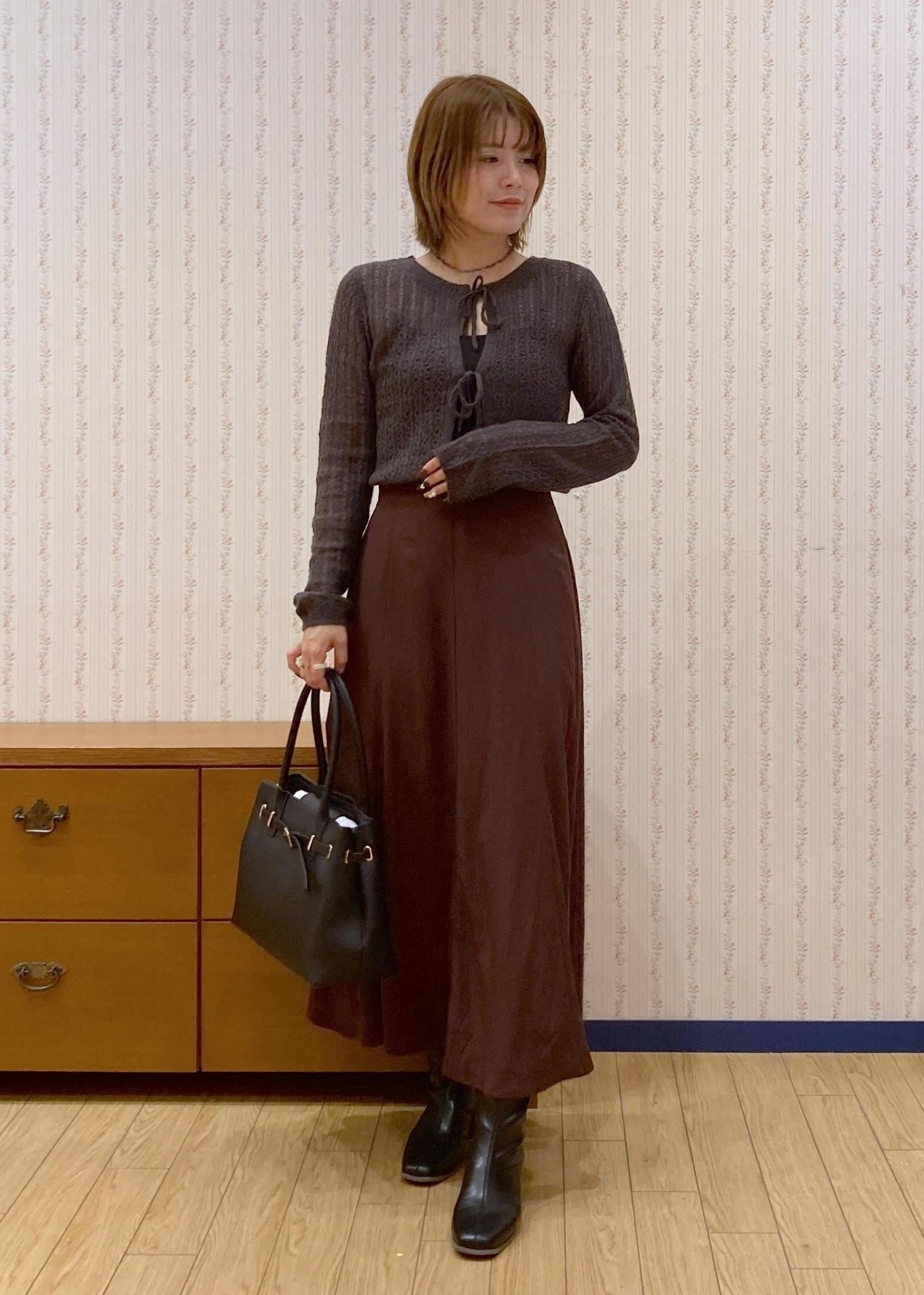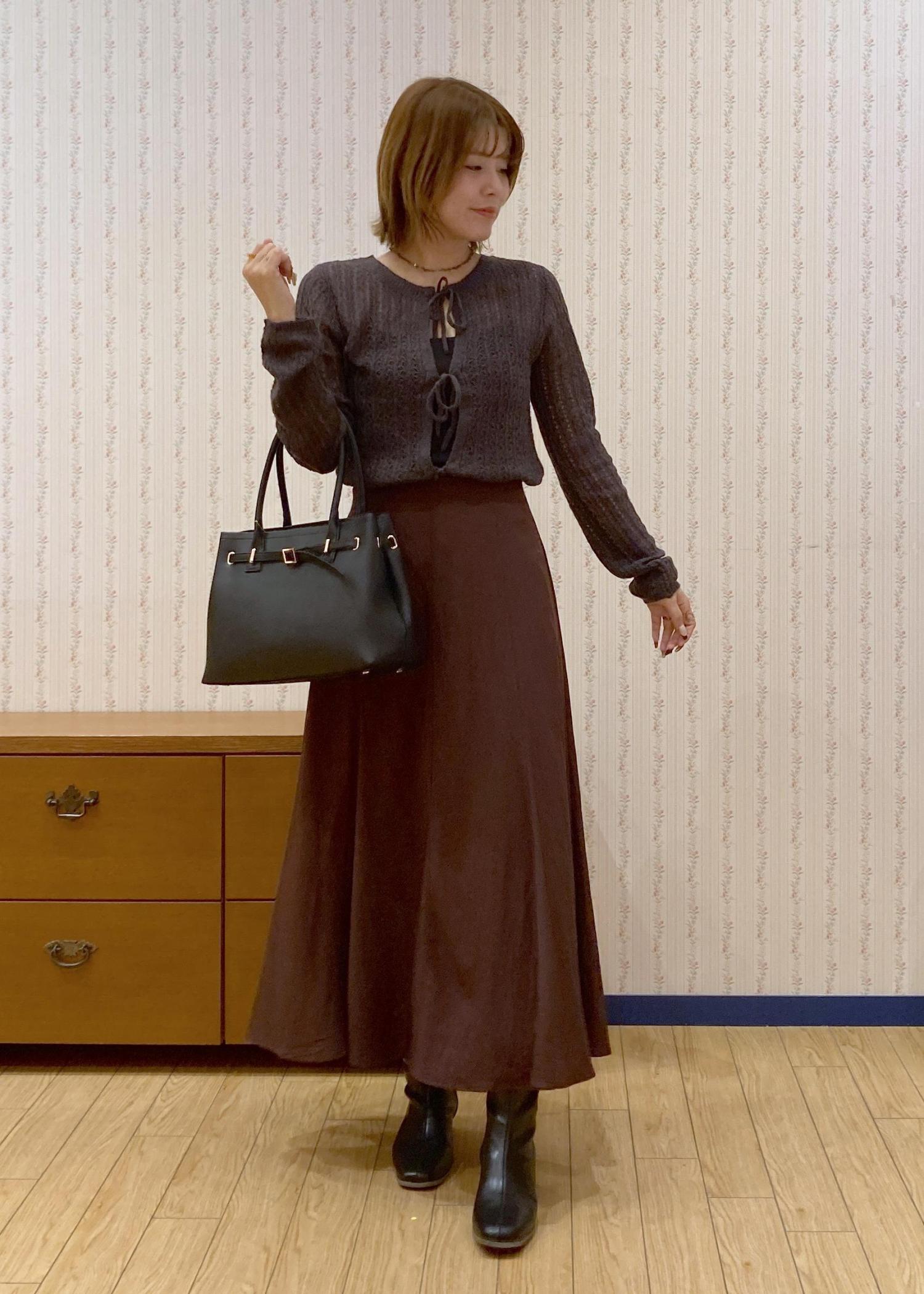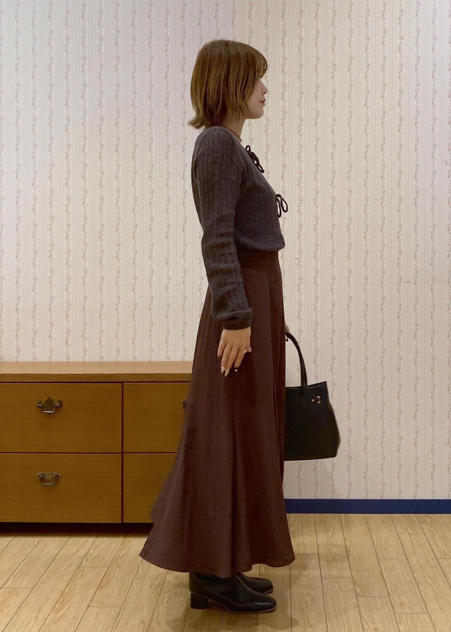 ブラウン×バーガンディの秋っぽい配色でまとめたフェミニンなデートコーディネートです。