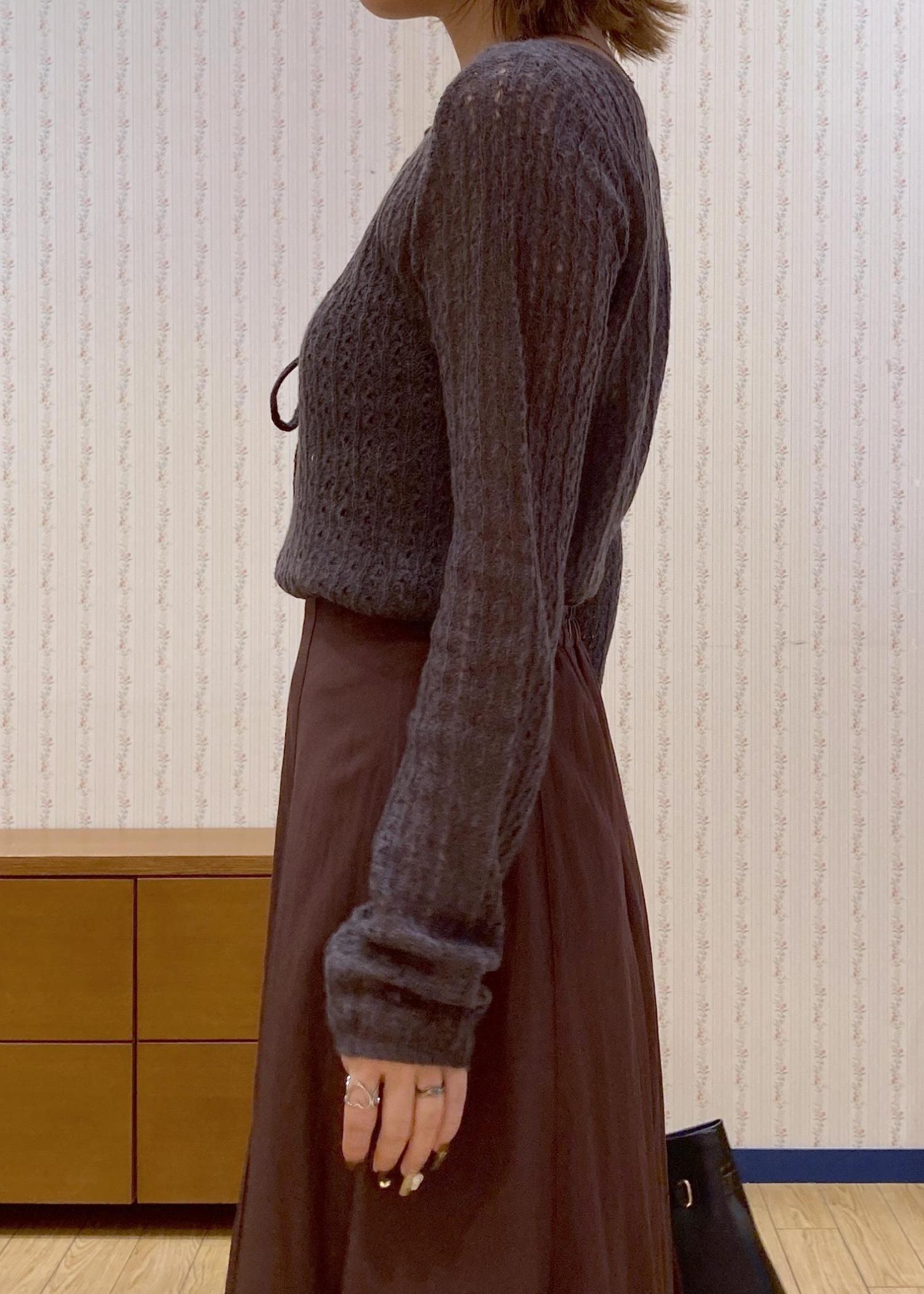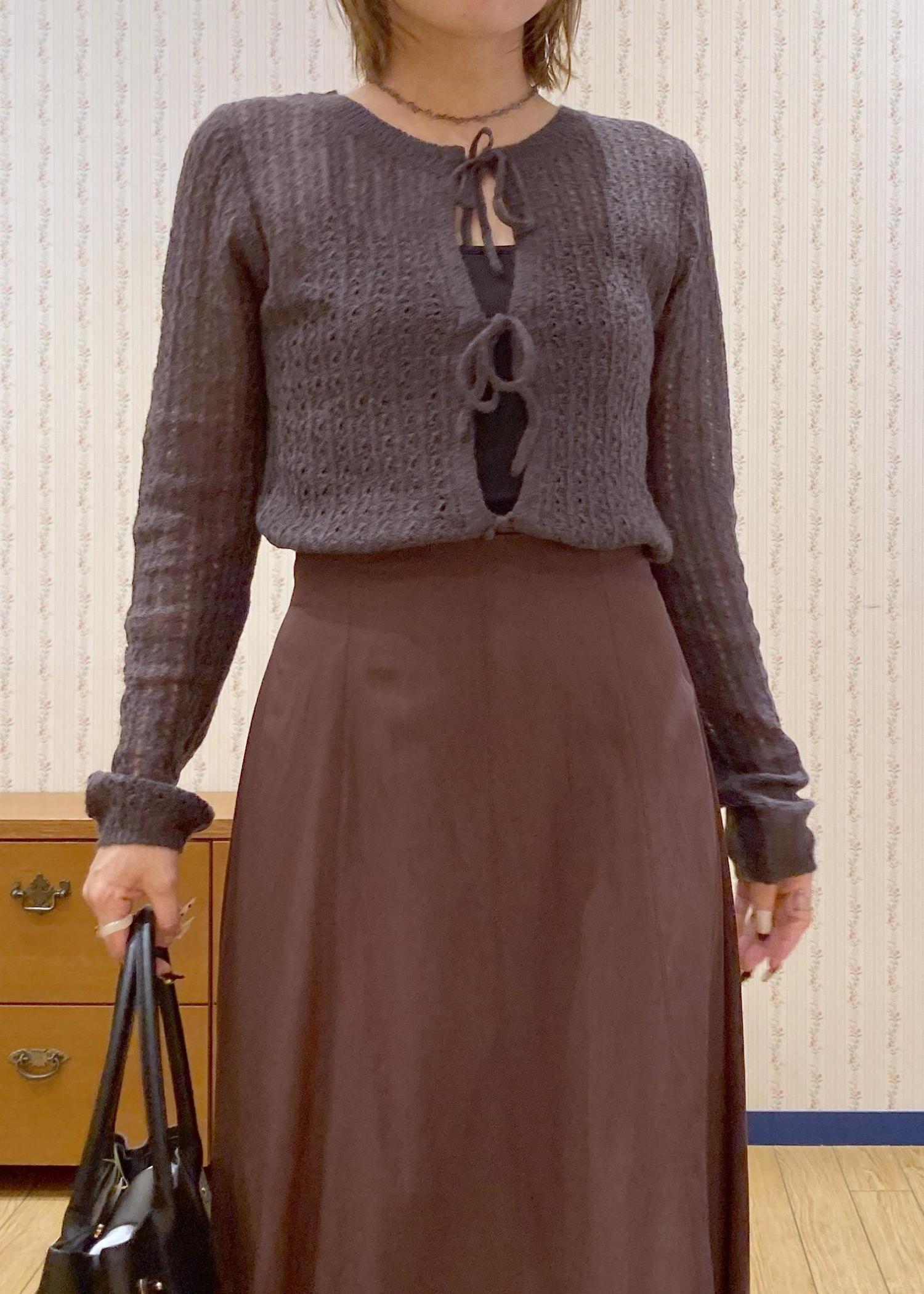透かし編みのカーディガンはトップスのように着てウエストインしてスッキリ見せました!