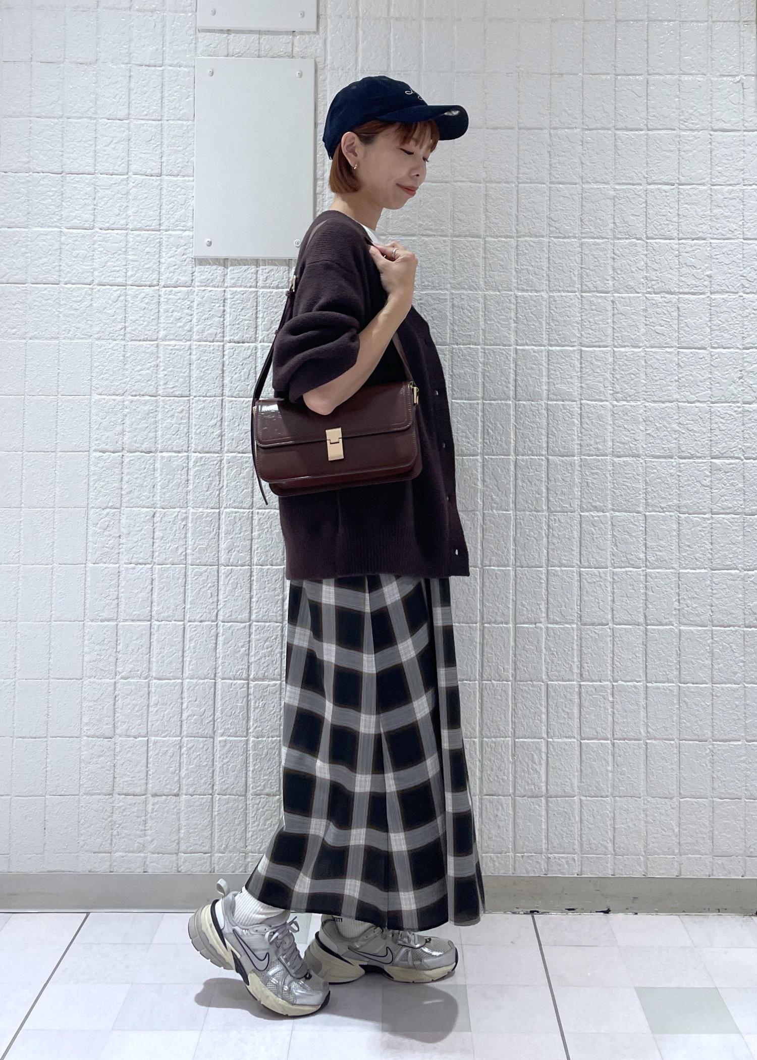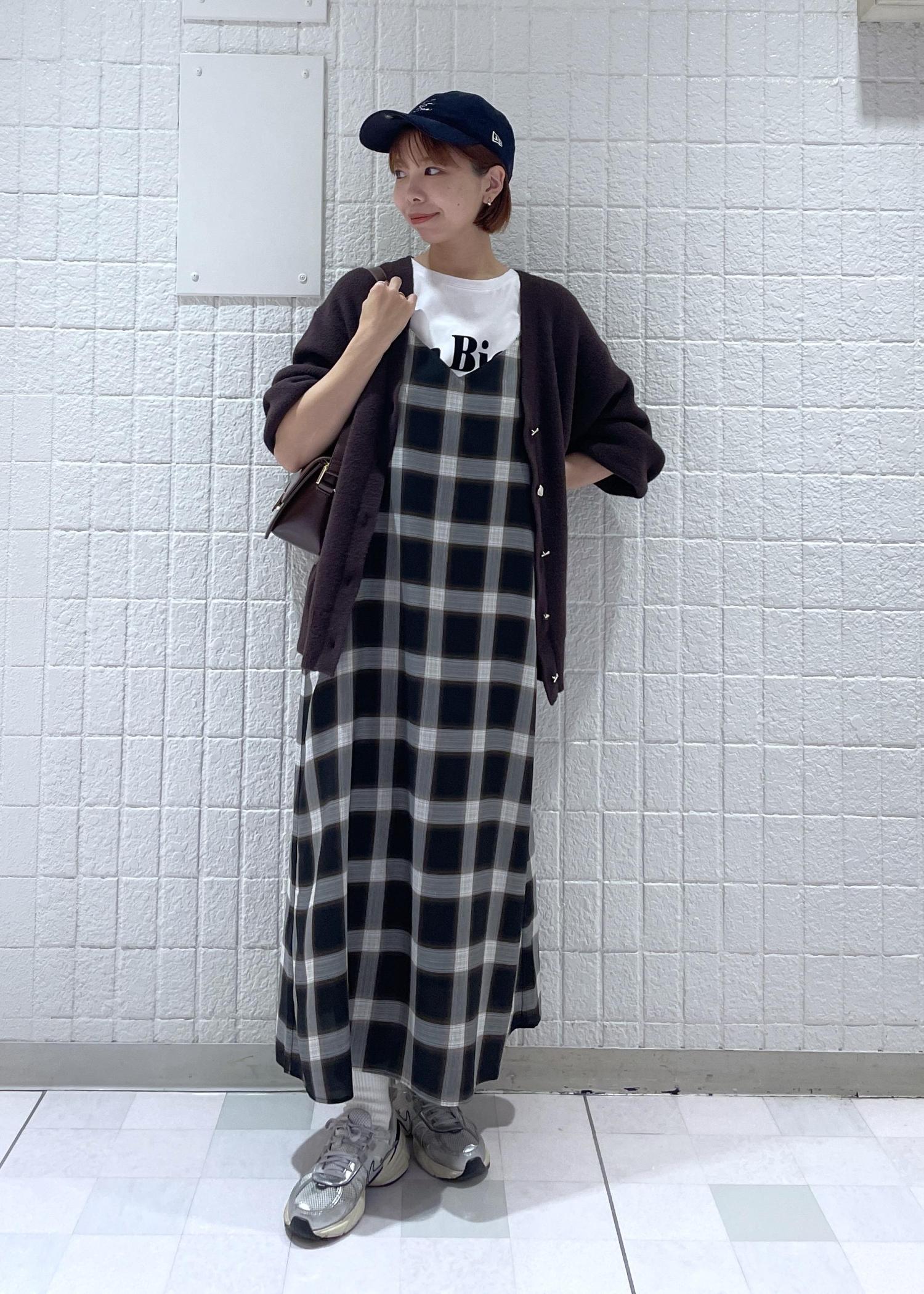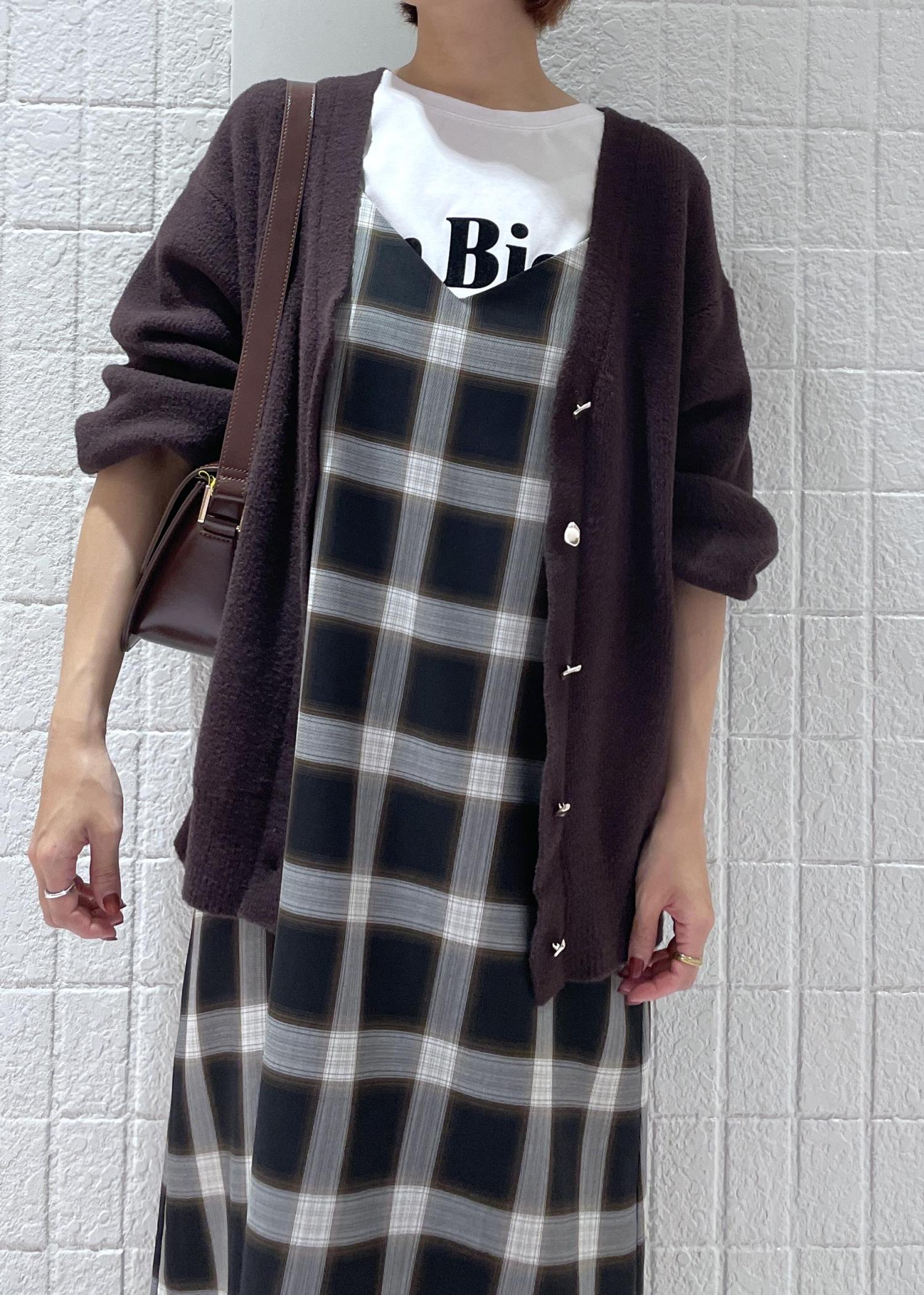 チェック柄のキャミワンピースに、ざっくりとしたミドル丈カーディガンを合わせた秋のリラックスコーデ。