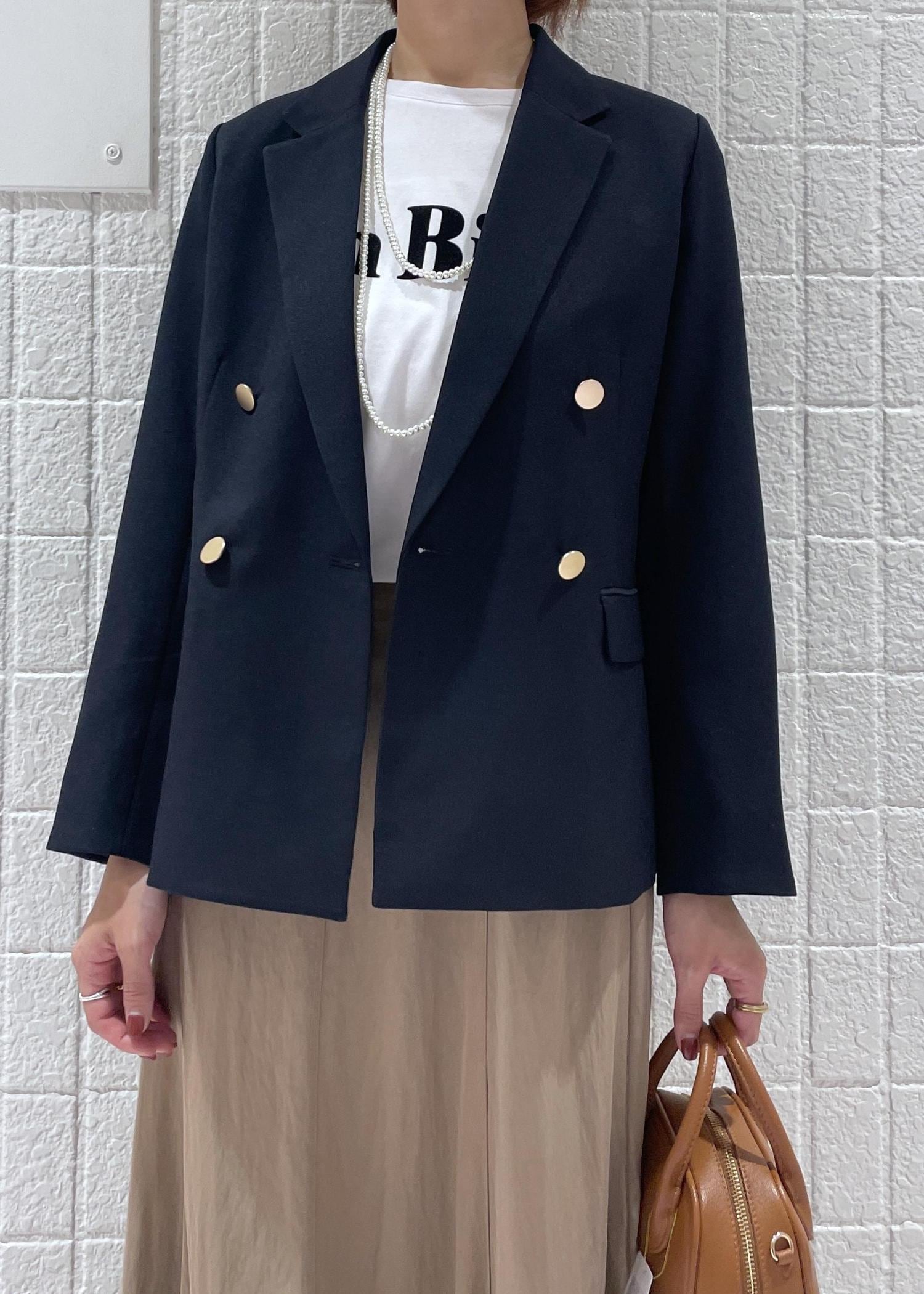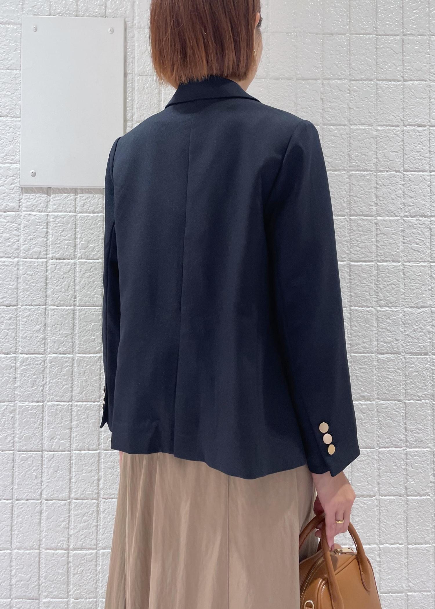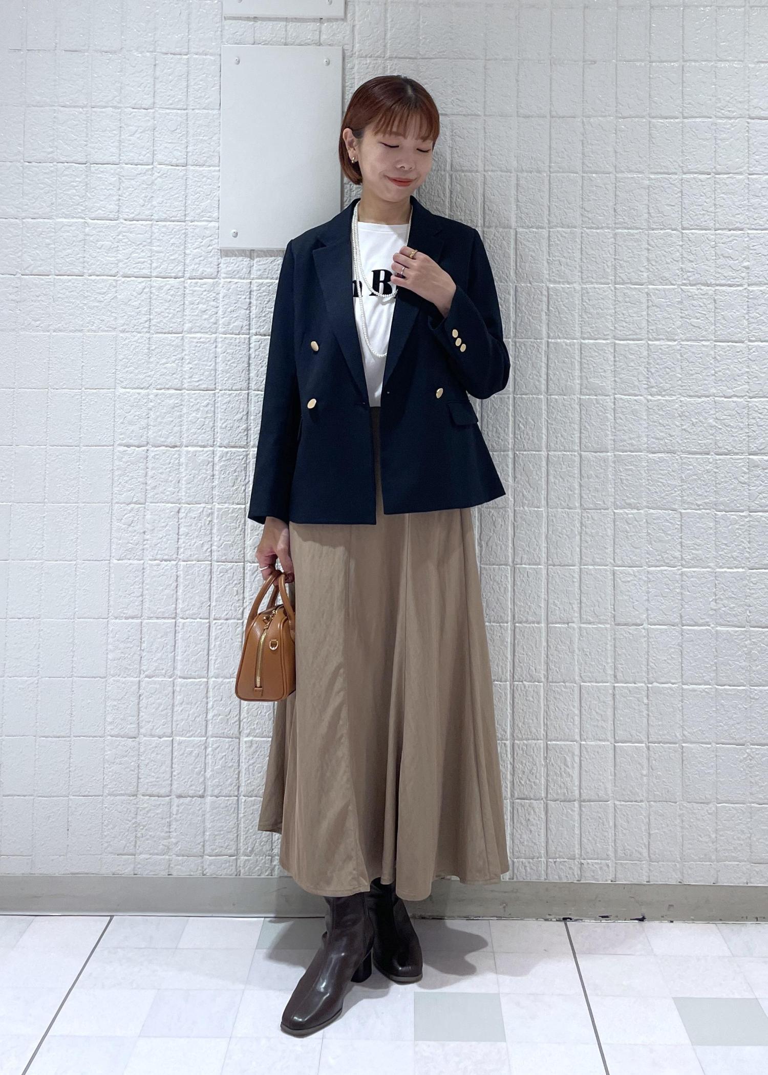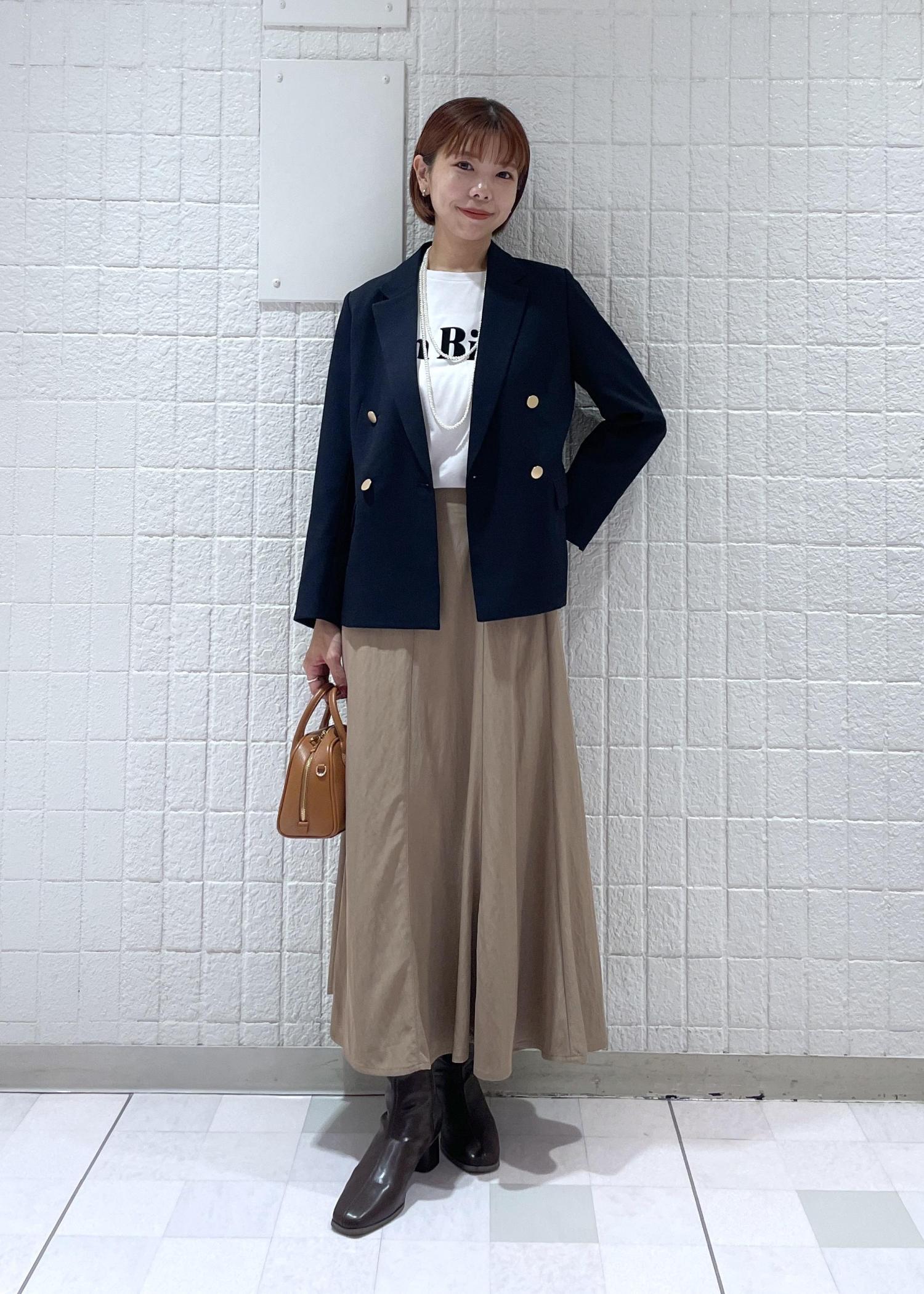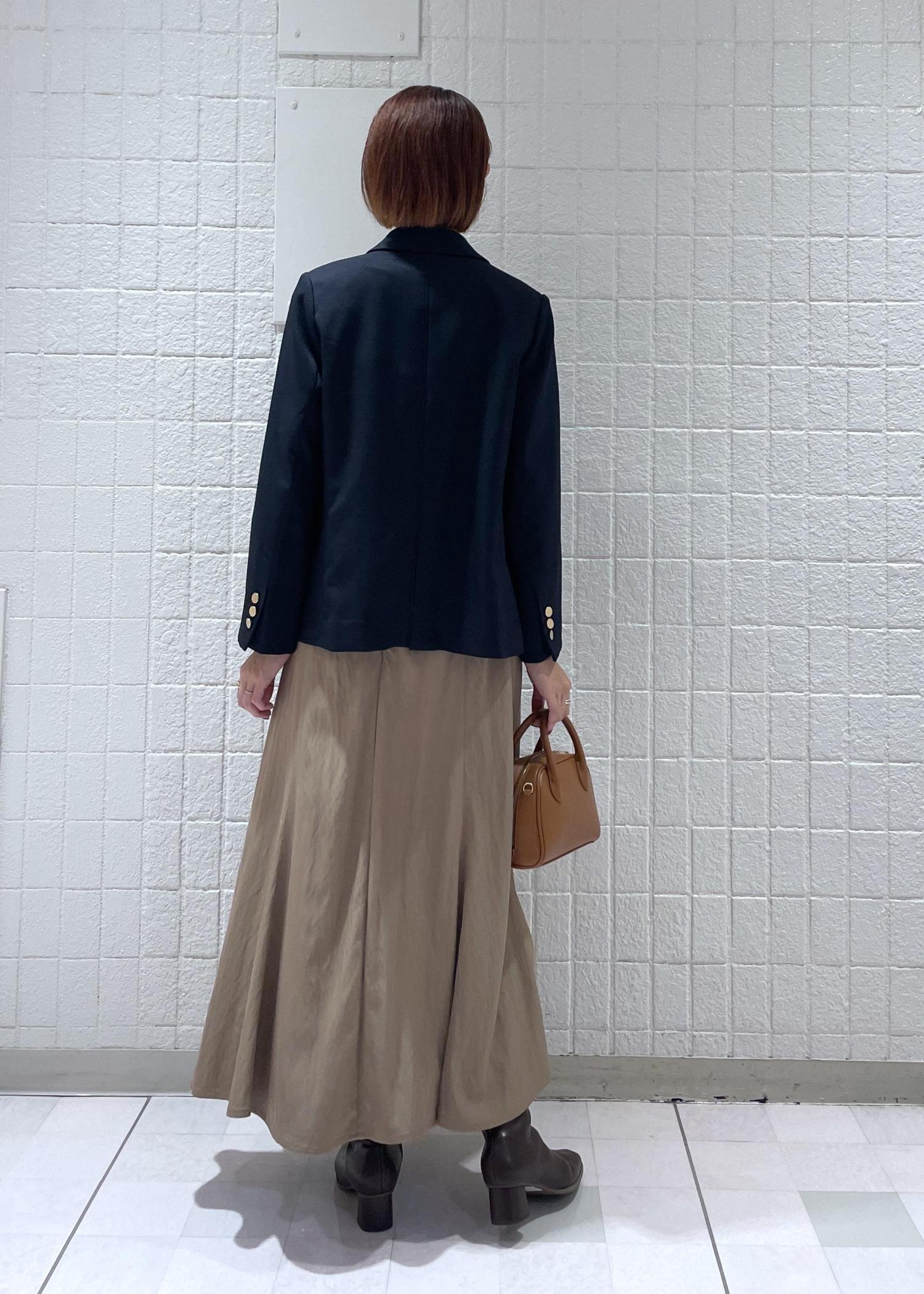 裾にかけて広がるシルエットなので、ジャケットは小柄さん向けのすっきりとした丈を選んでみました。