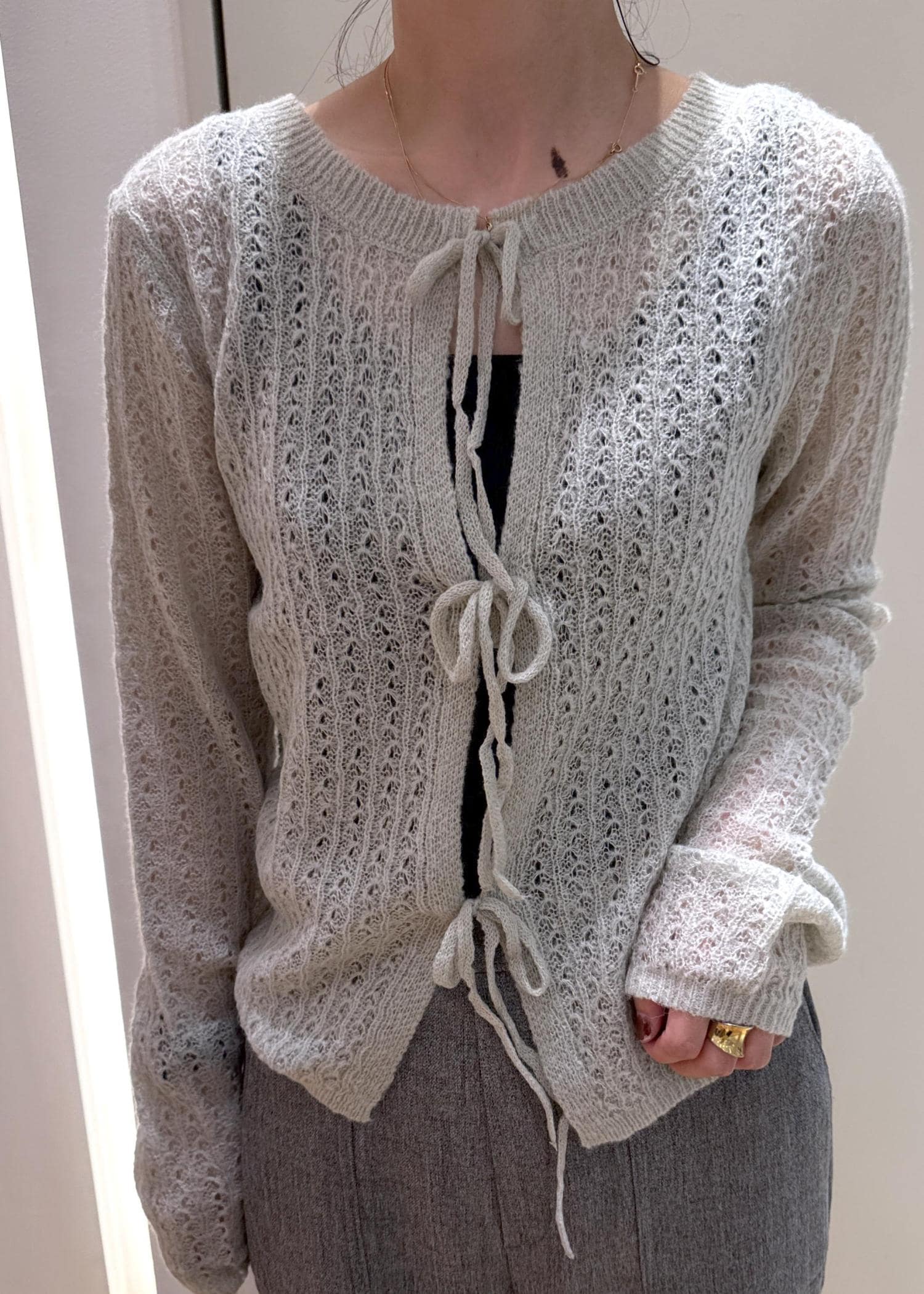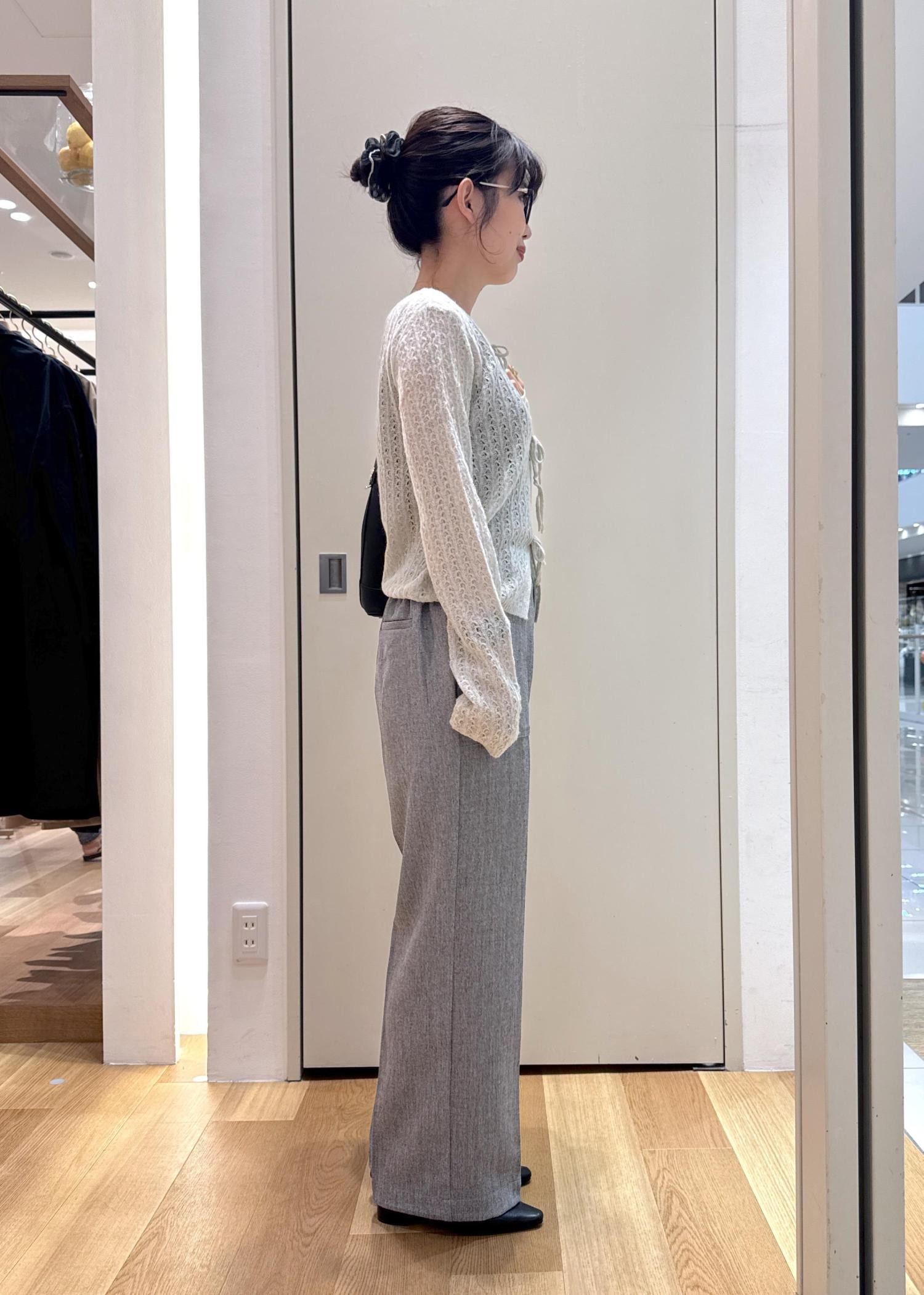 リボンデザインがポイントのカーディガンとベイカーパンツを合わせたヘルシーコーデです。