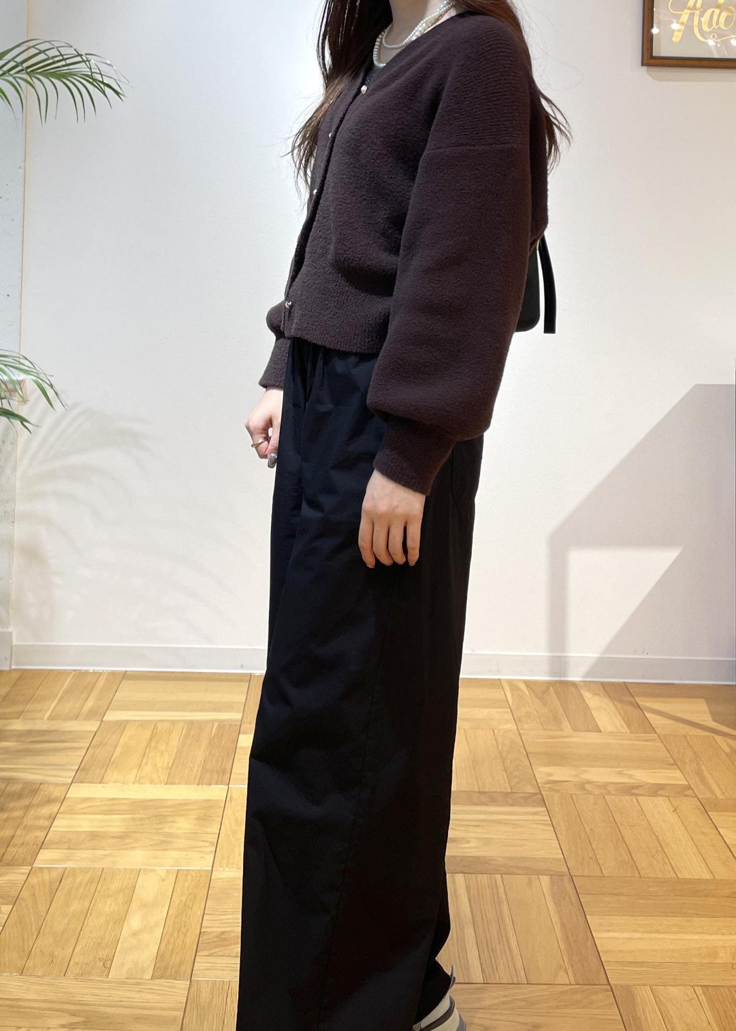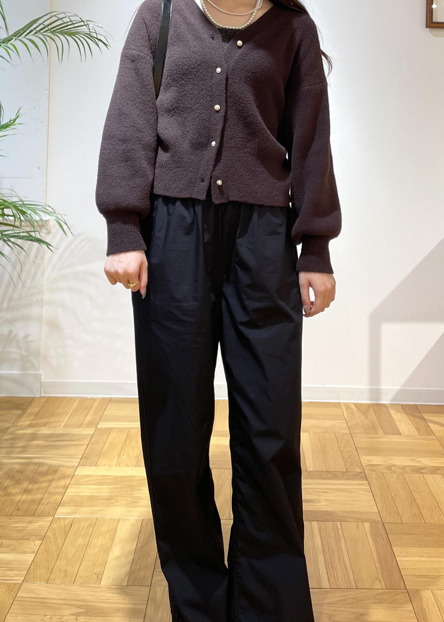 ふわふわカーディガンのショート丈着用。