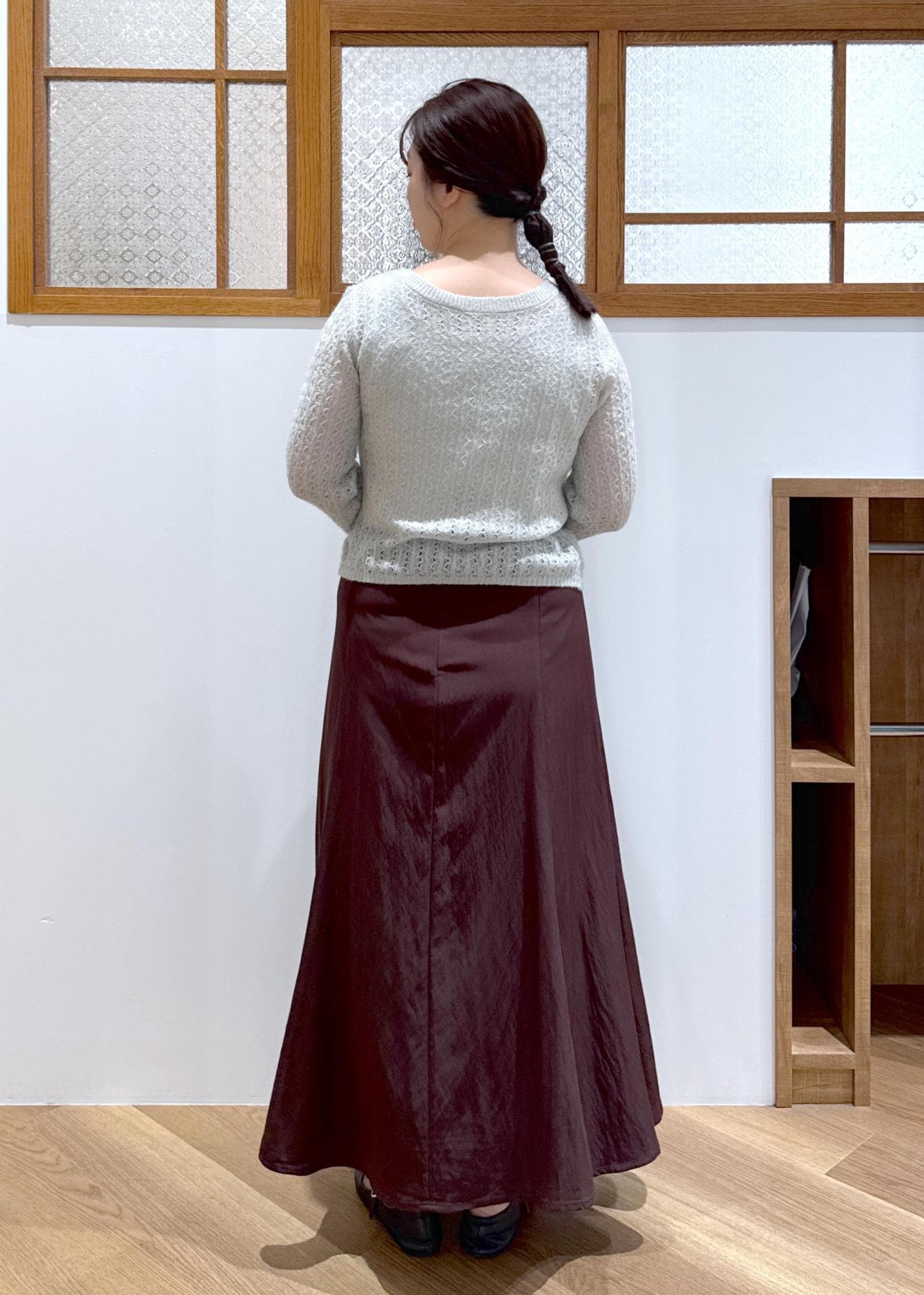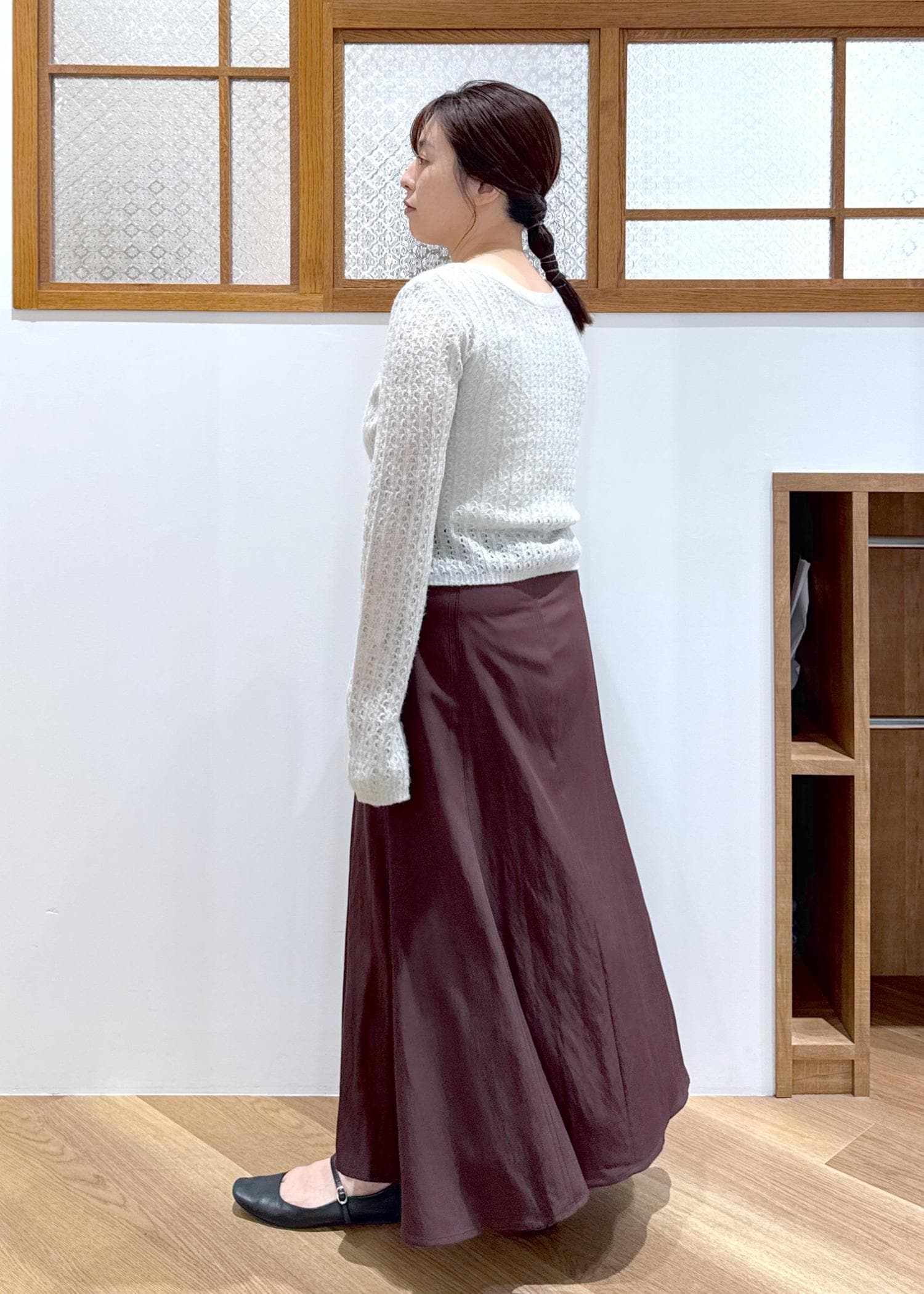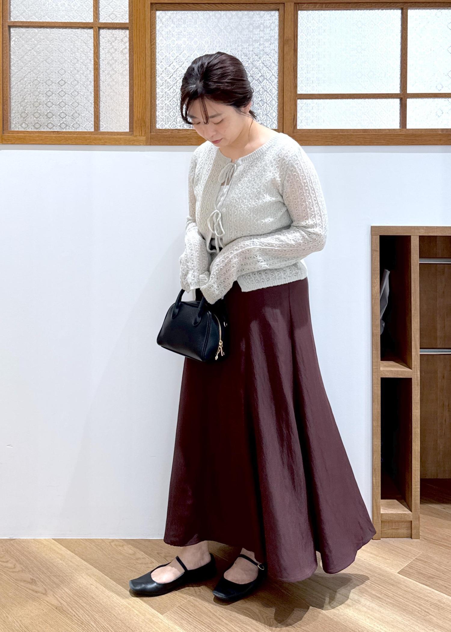 ROPÉ PICNICフィブリルマーメイドフレアスカートワイン / M¥6,490レビュー後ろゴムハイウエストのデザイン。長め、お尻周りカバー目的でMサイズ着用。フレアとマーメイドのmixシルエットなので、154cmでもバランスがとりやすく、それでいてドレッサーすぎないおしゃれさが作れます。