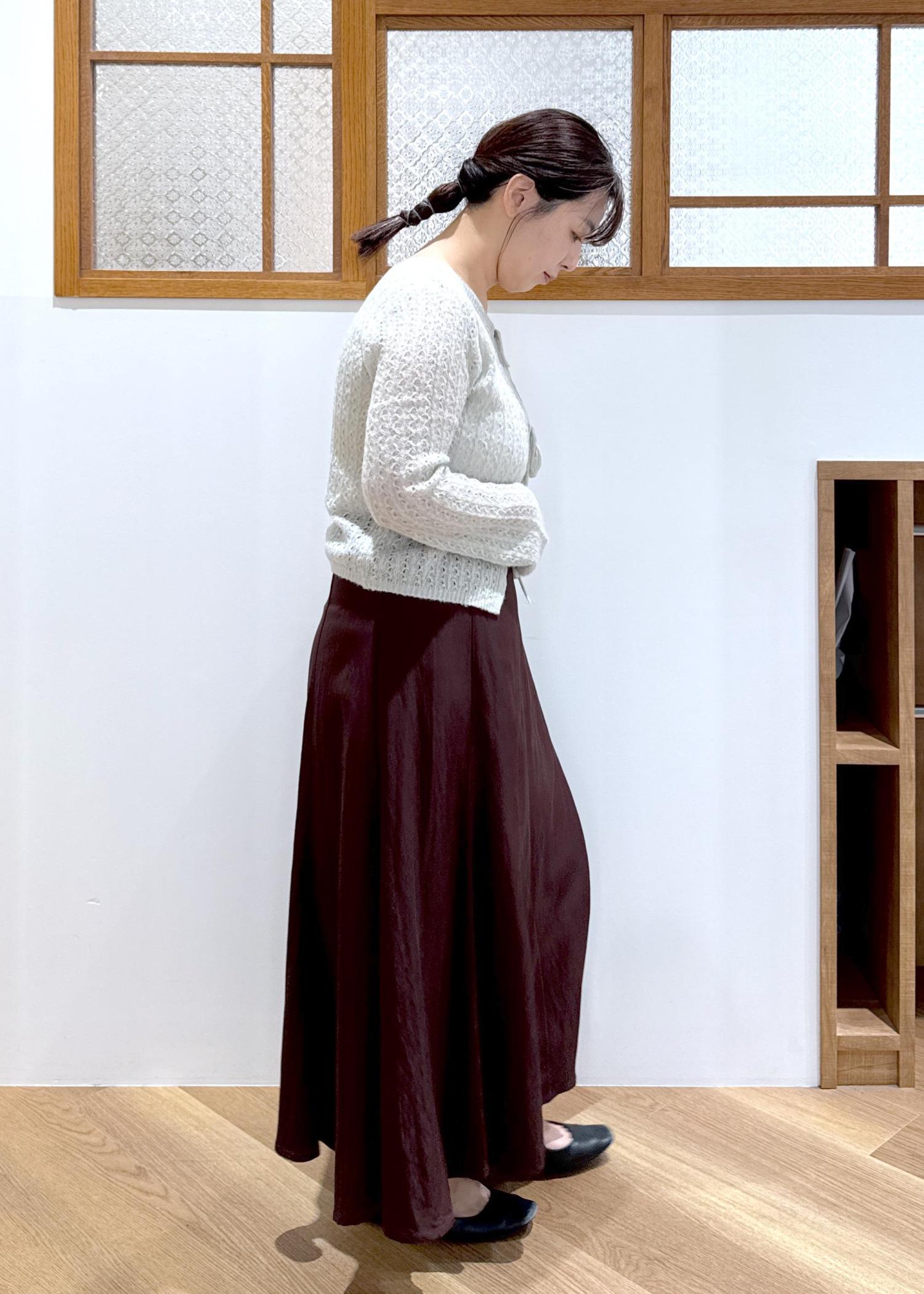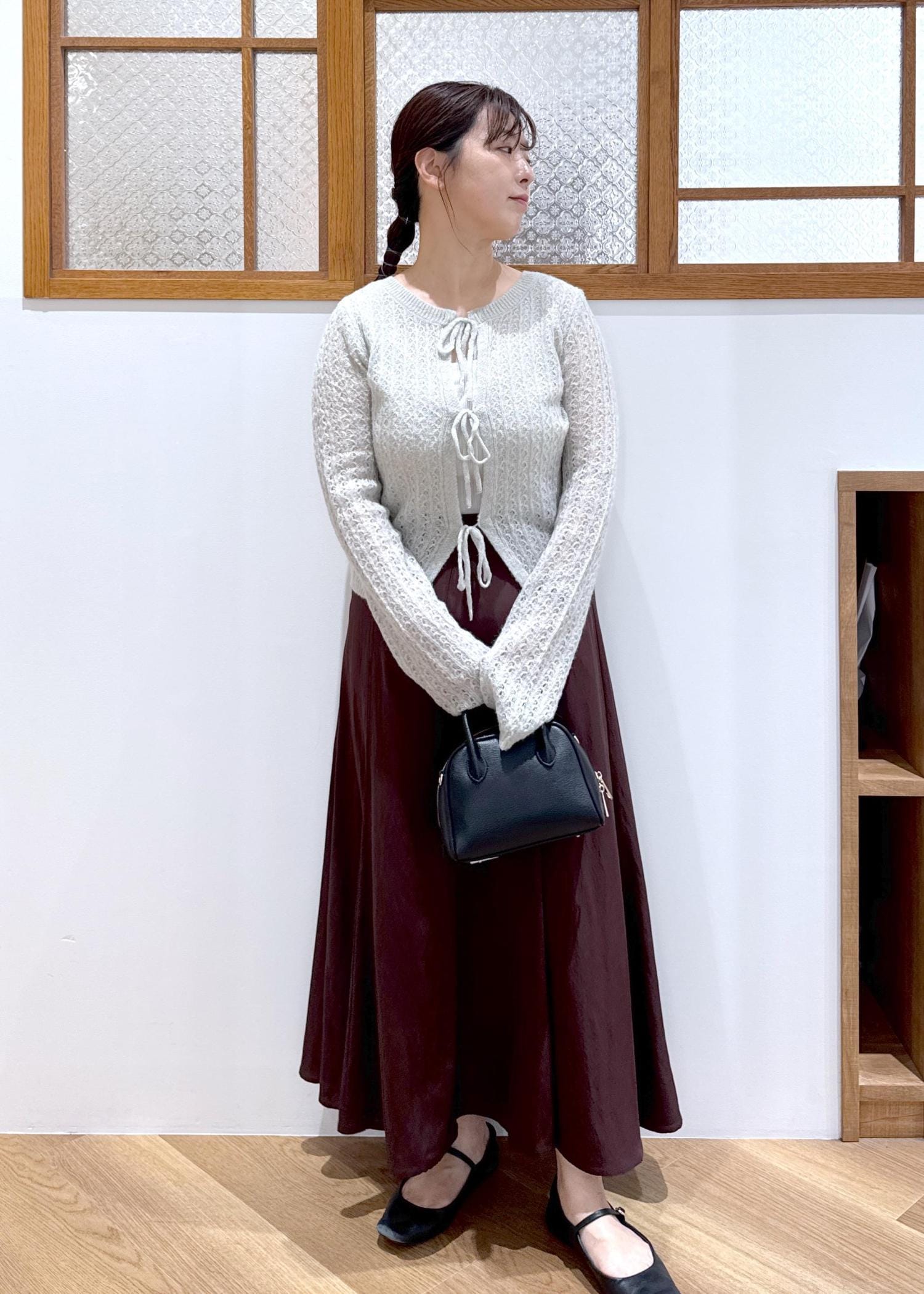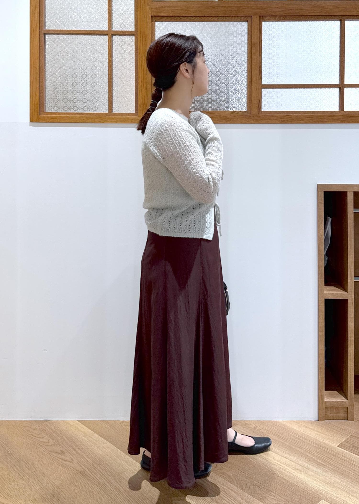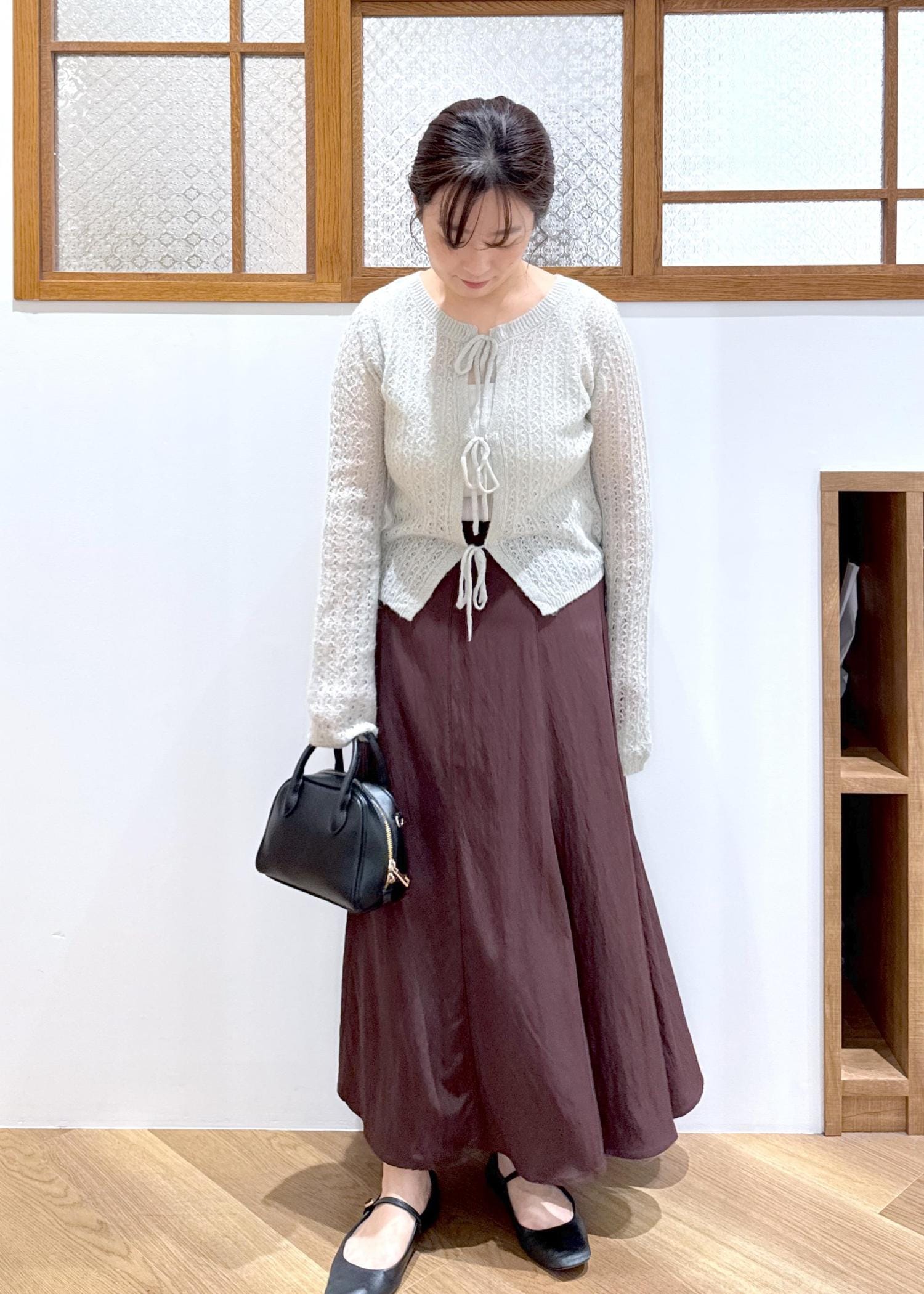 ROPÉ PICNICフィブリルマーメイドフレアスカートワイン / M¥6,490レビュー後ろゴムハイウエストのデザイン。長め、お尻周りカバー目的でMサイズ着用。フレアとマーメイドのmixシルエットなので、154cmでもバランスがとりやすく、それでいてドレッサーすぎないおしゃれさが作れます。