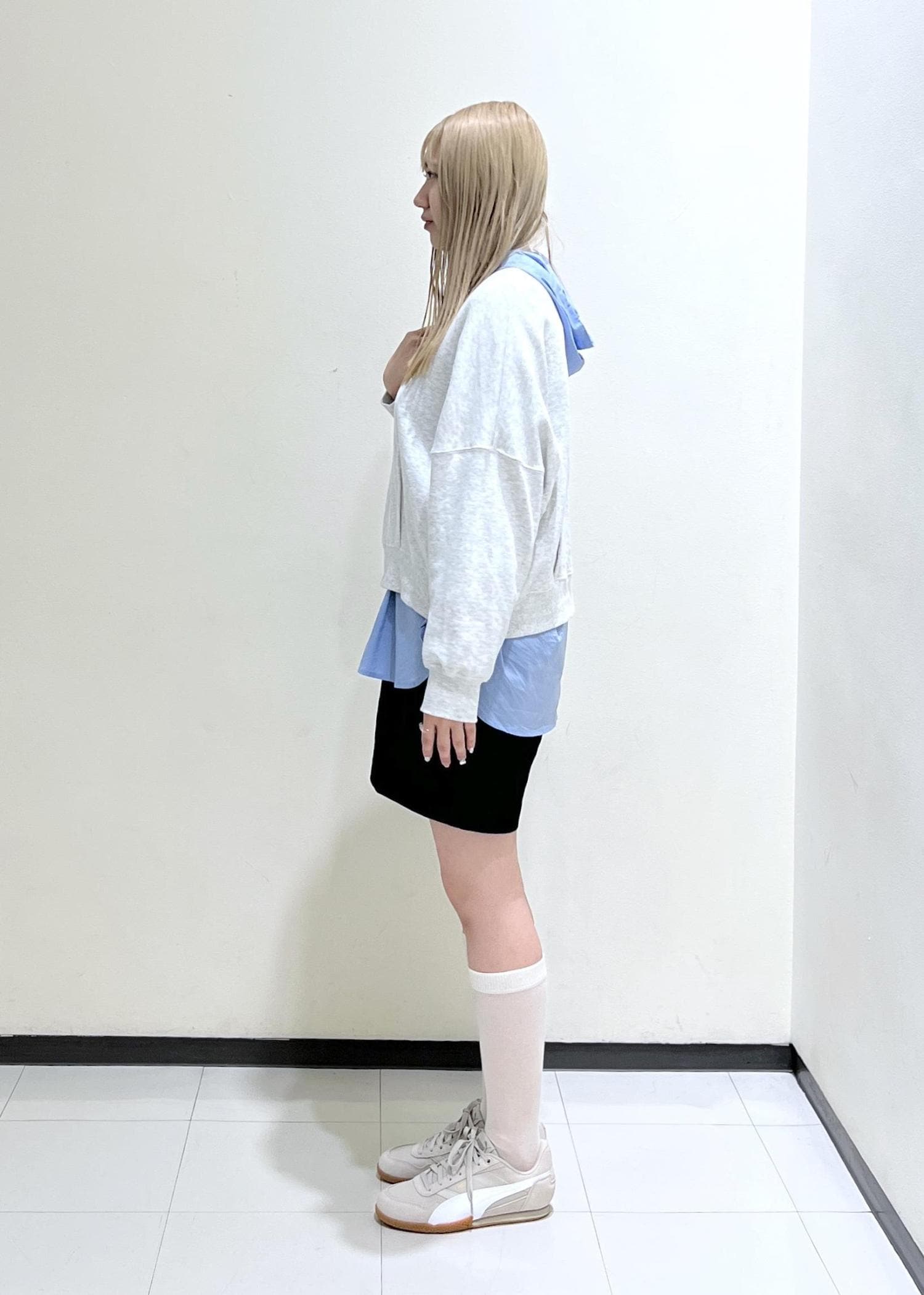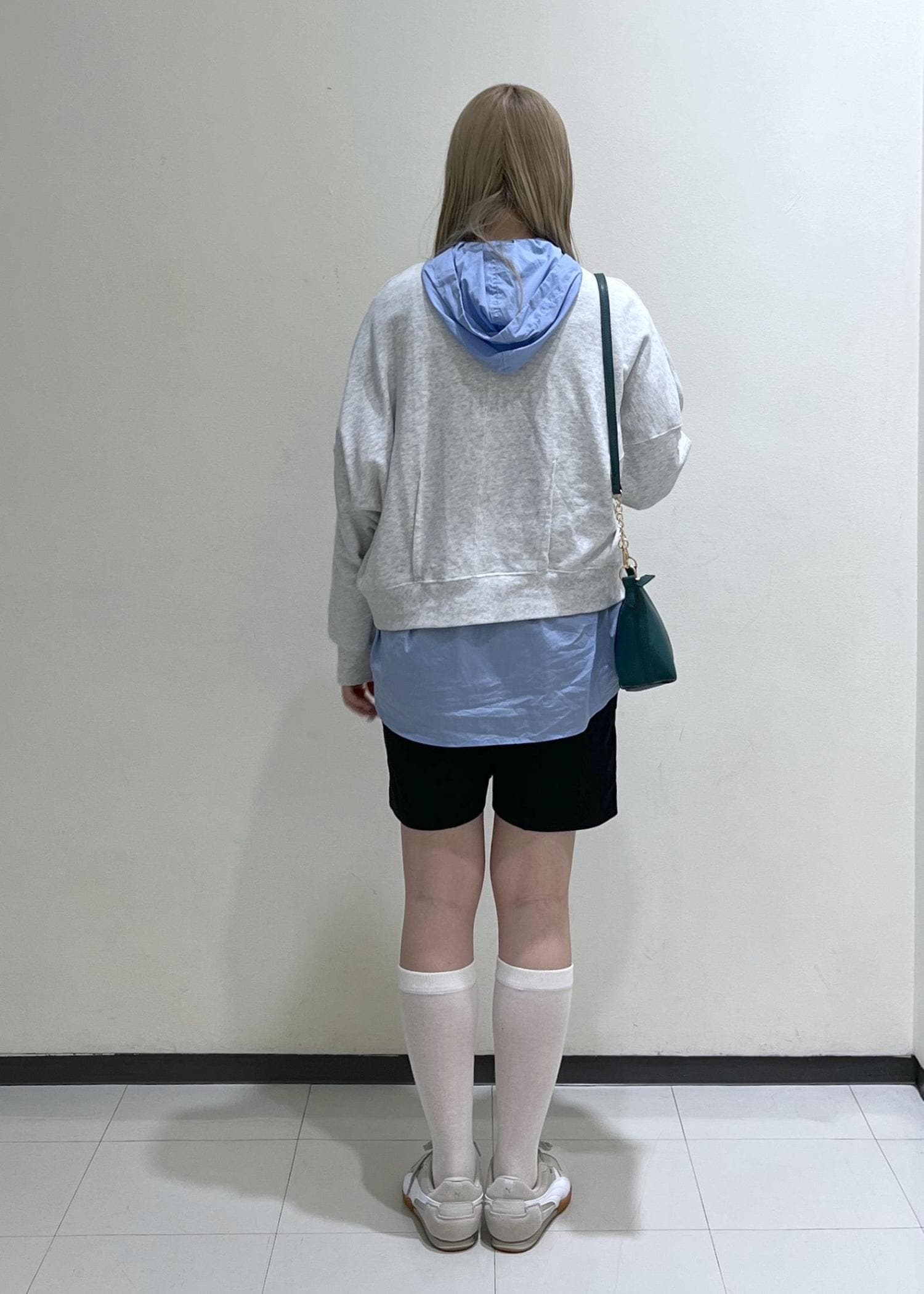 フード付きのシャツとスウェットをレイヤードすることでトレンド感のあるスタイリングにしてみました!