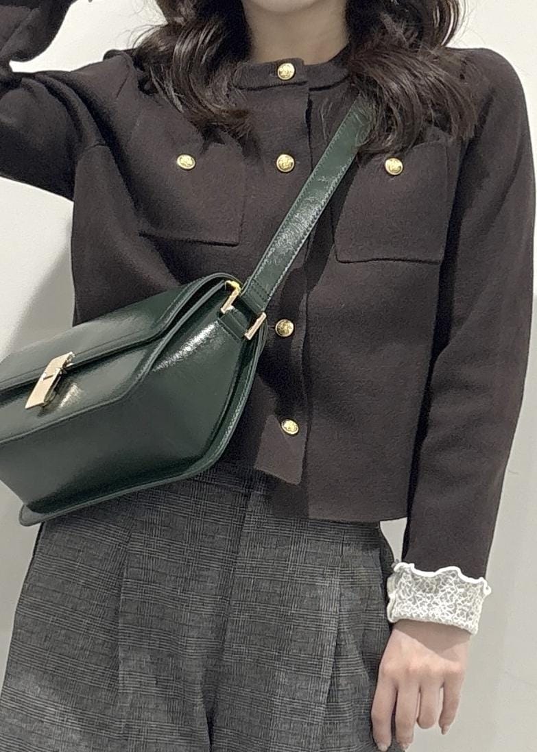 ポイントは高見えする金ボタンで、胸ポケットにも付いているので上品に着れます!レースのカットソーを袖にはみ出して着ると海外風ガーリーな印象にもなります!グレーのチェック柄のパンツでカジュアル感も出して、グリーンのバッグとワインレッドのブーツで深みのある秋らしいコーデにしてみました!