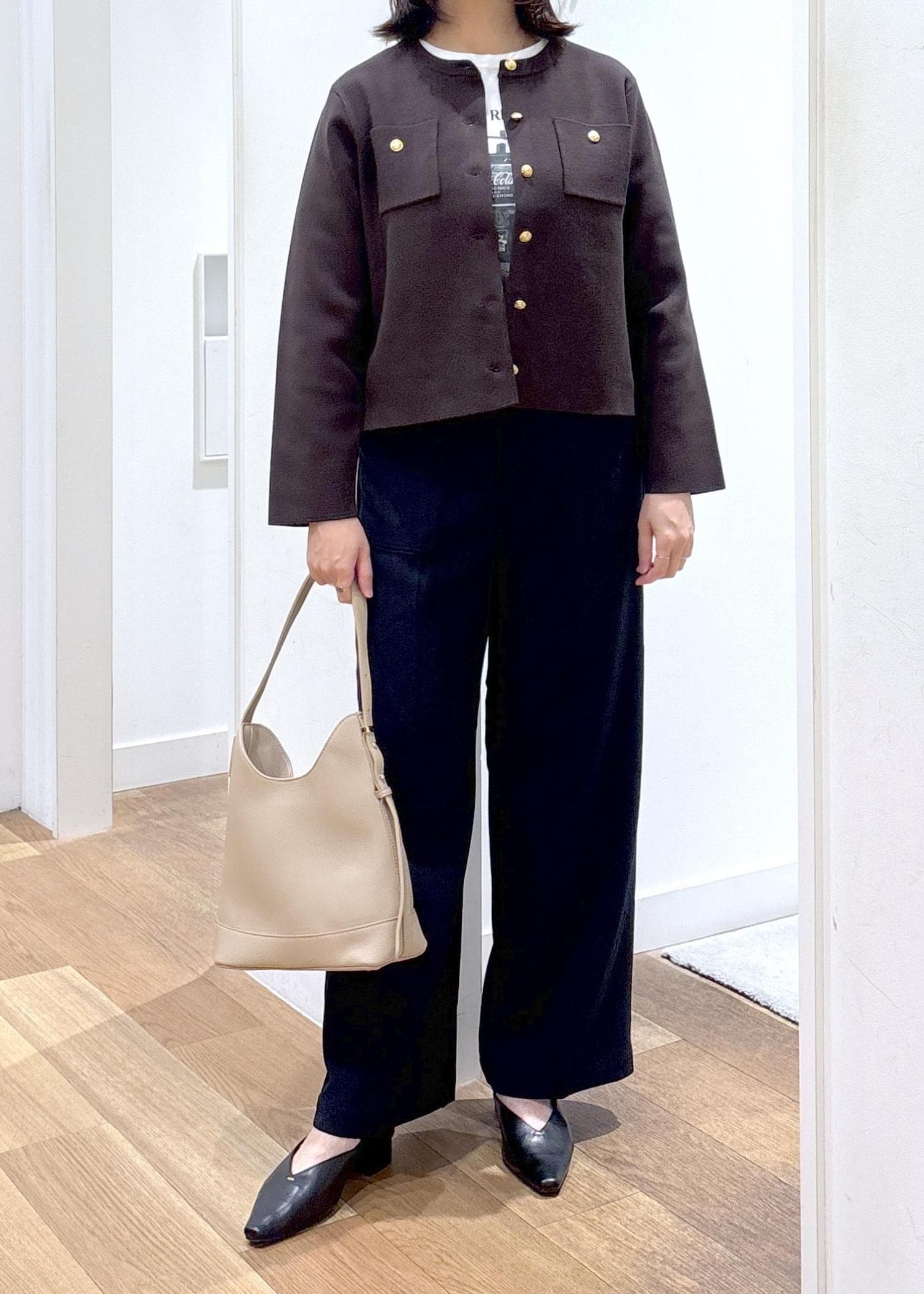 ベーシックにカーディガン+パンツのスタイリングですが、