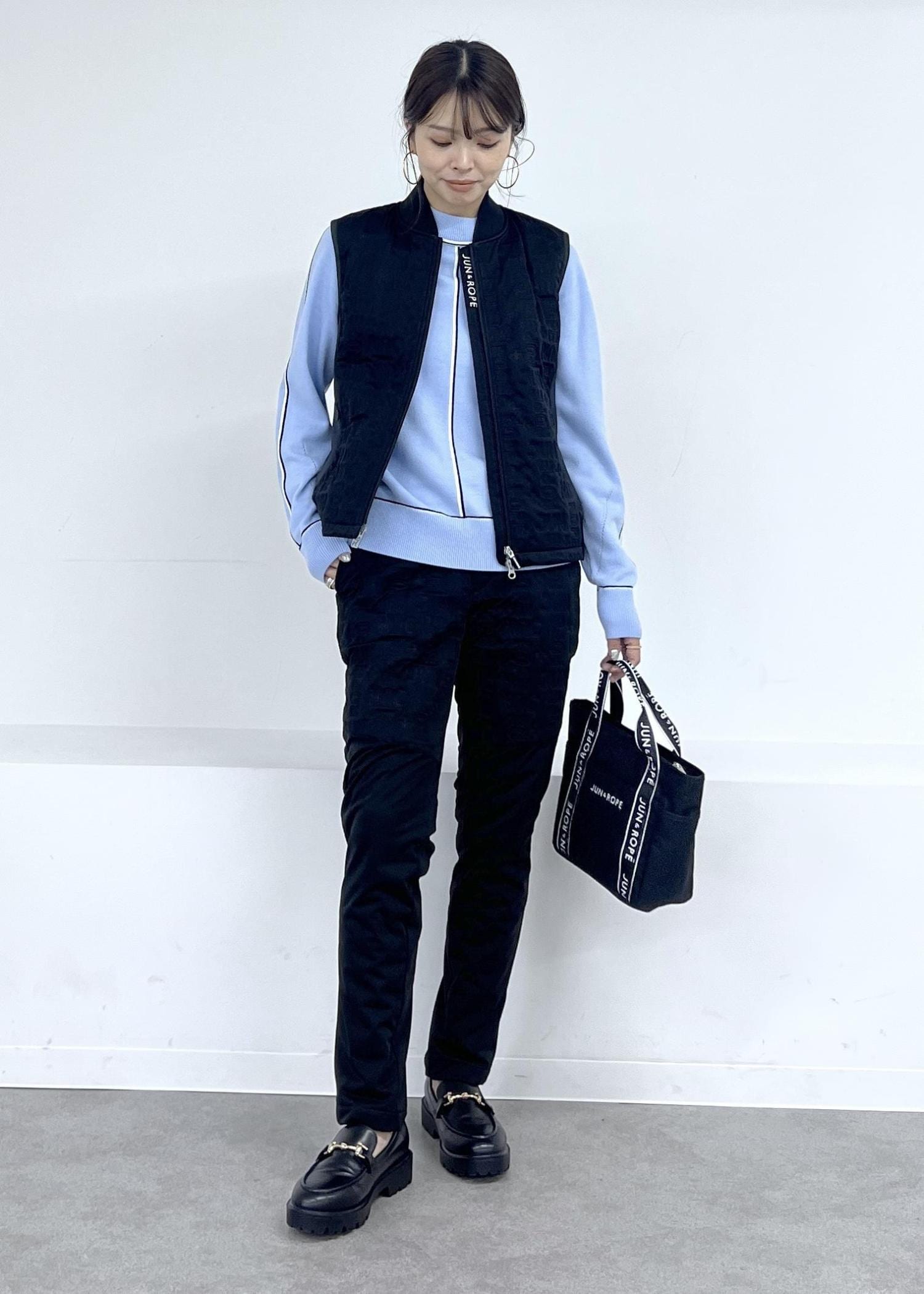 パンツも暖かみのある生地感で、動きやすいストレッチ性があるので冬の寒い時期のゴルフコーデにおすすめです。