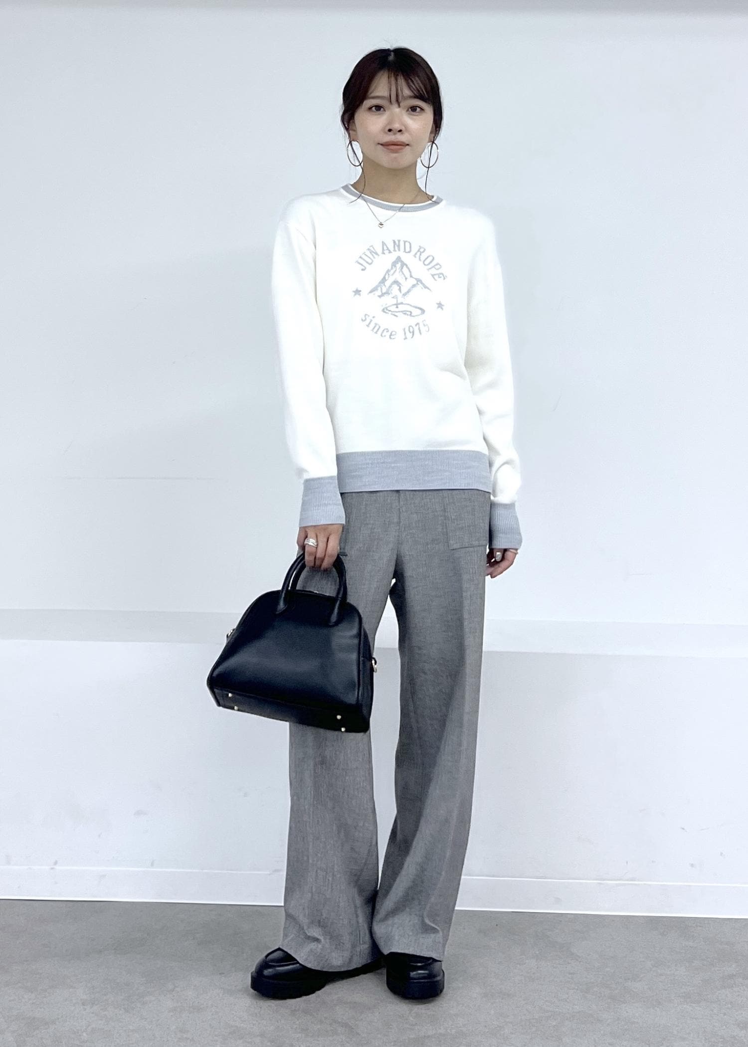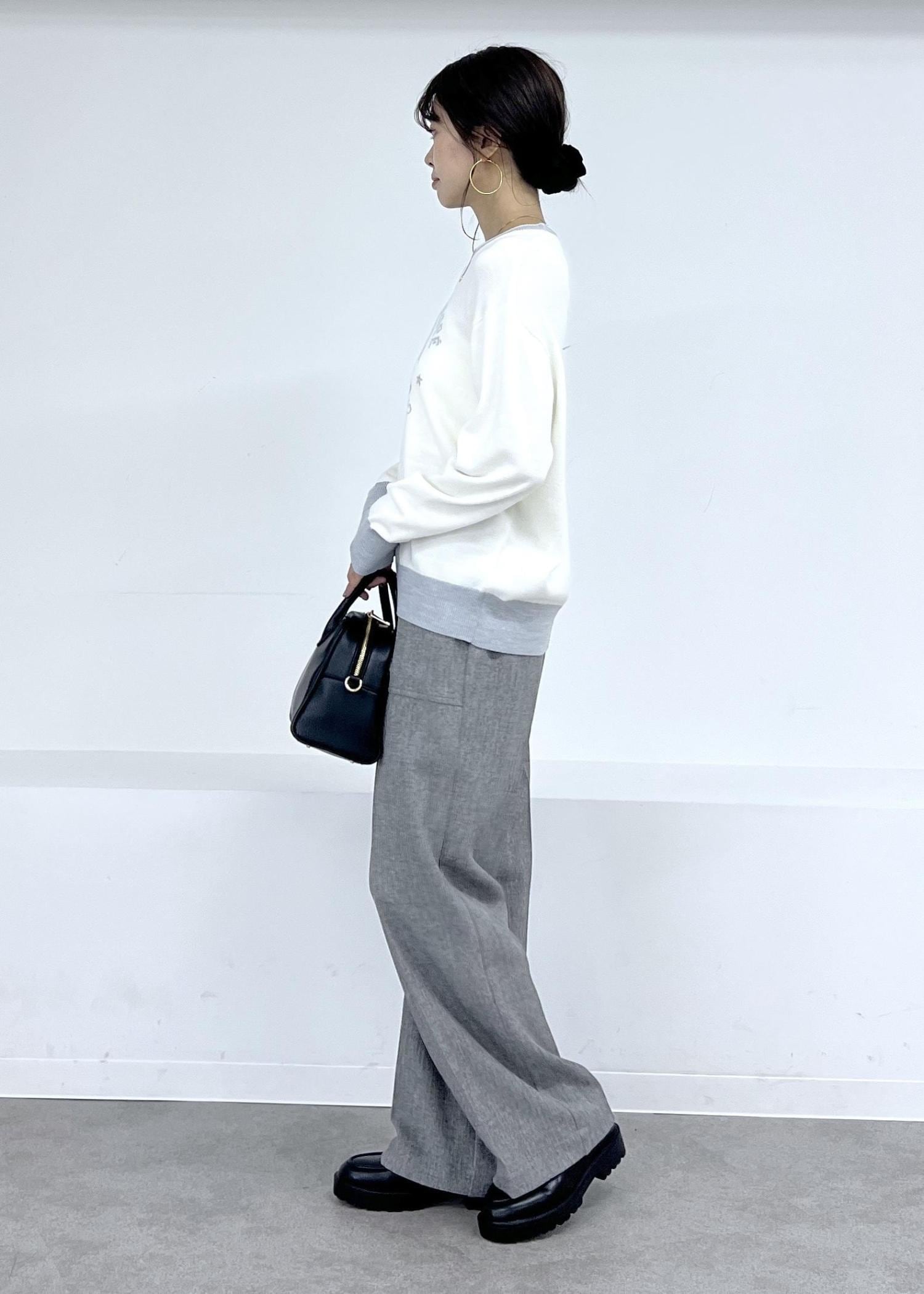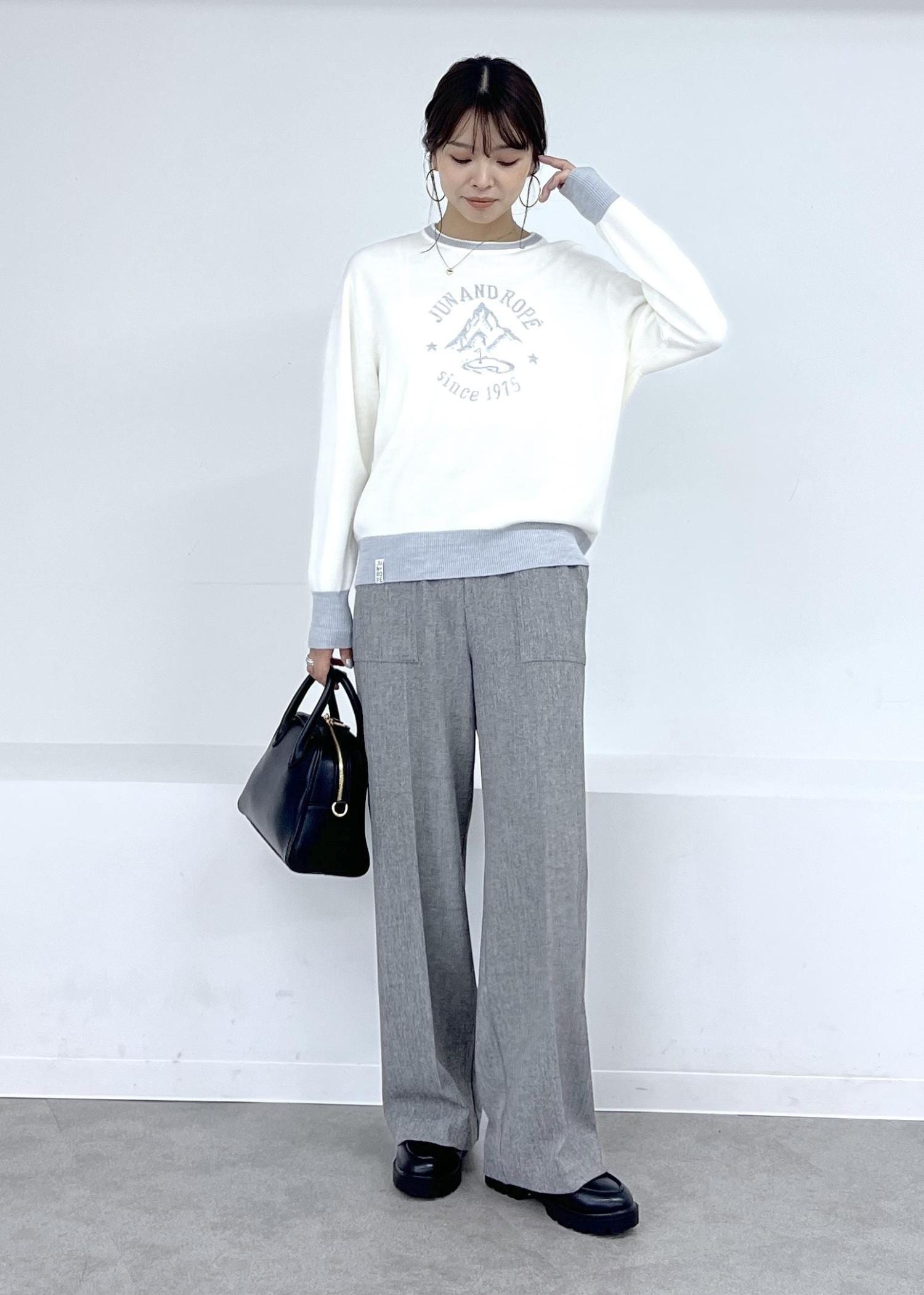 ホワイト×グレーにはブラックの小物で引き締めて、モノトーンでまとめるのが◎。