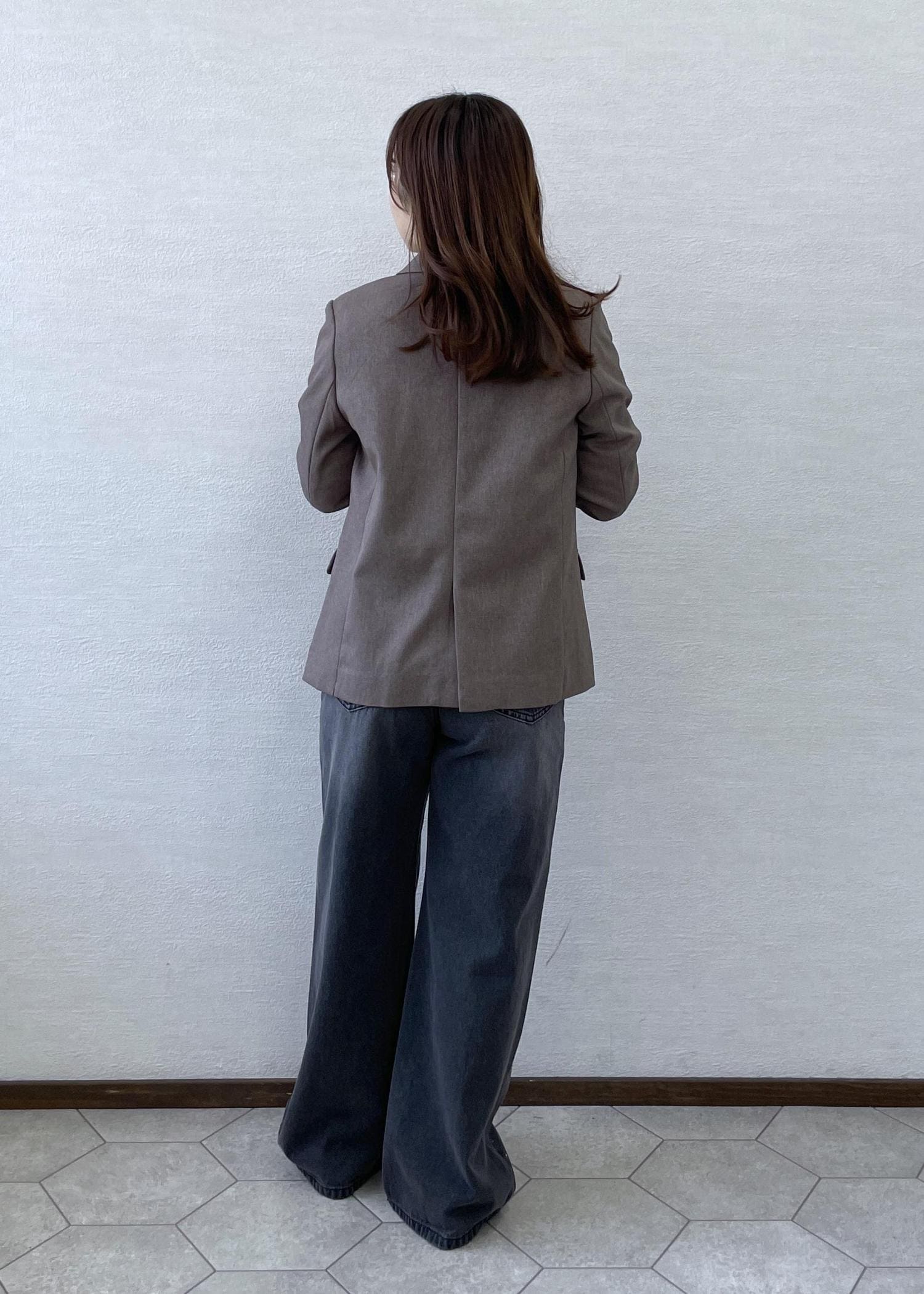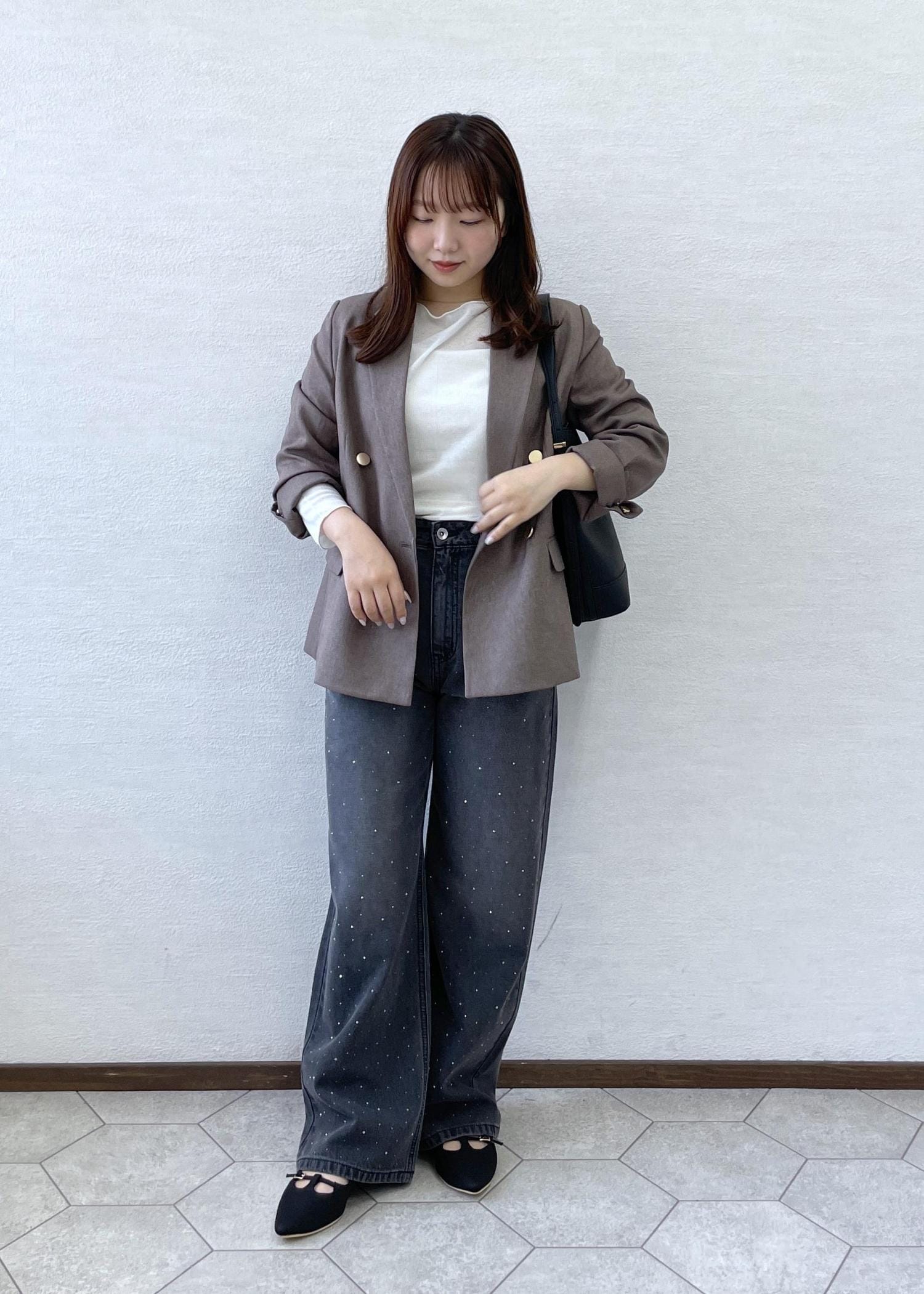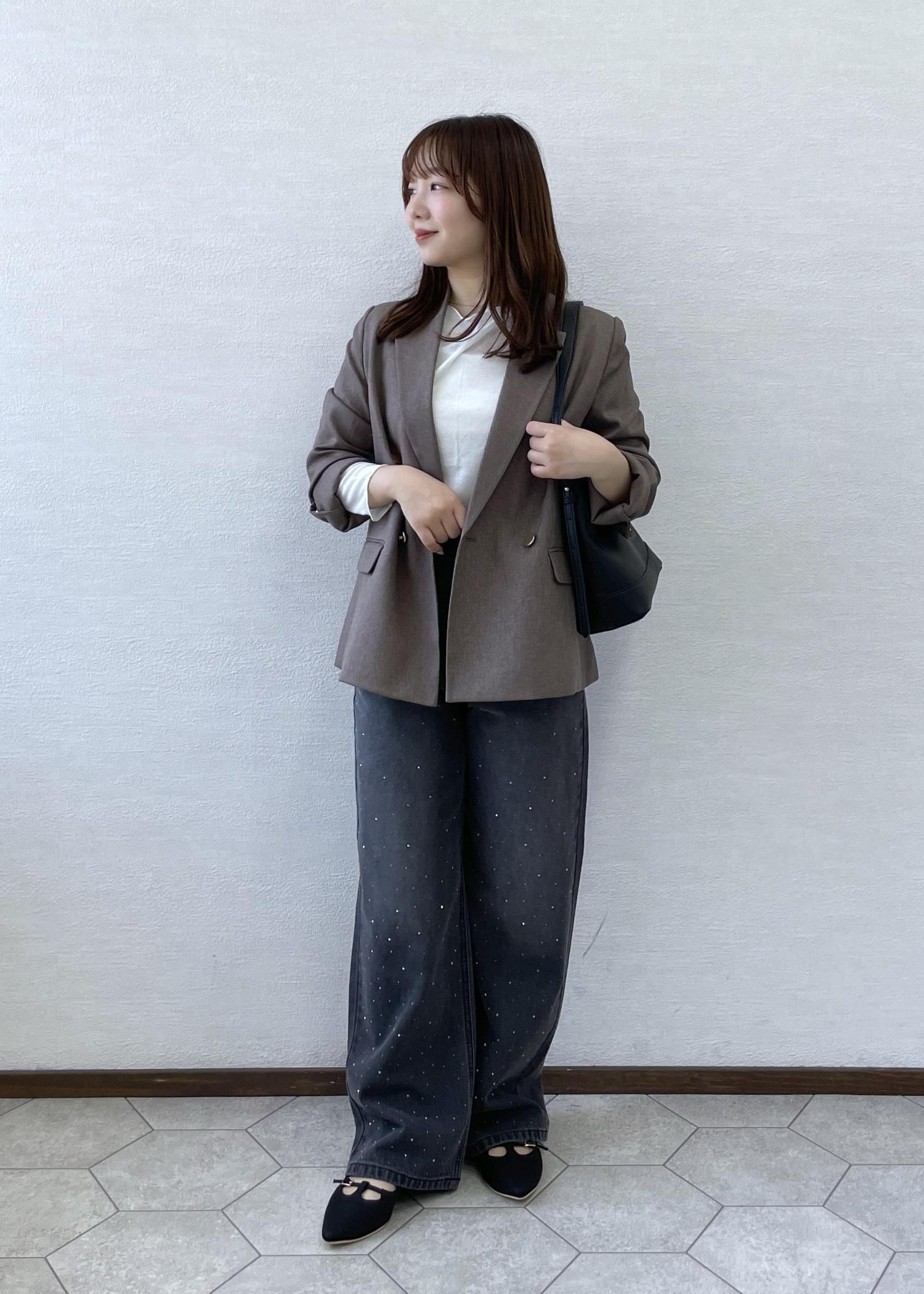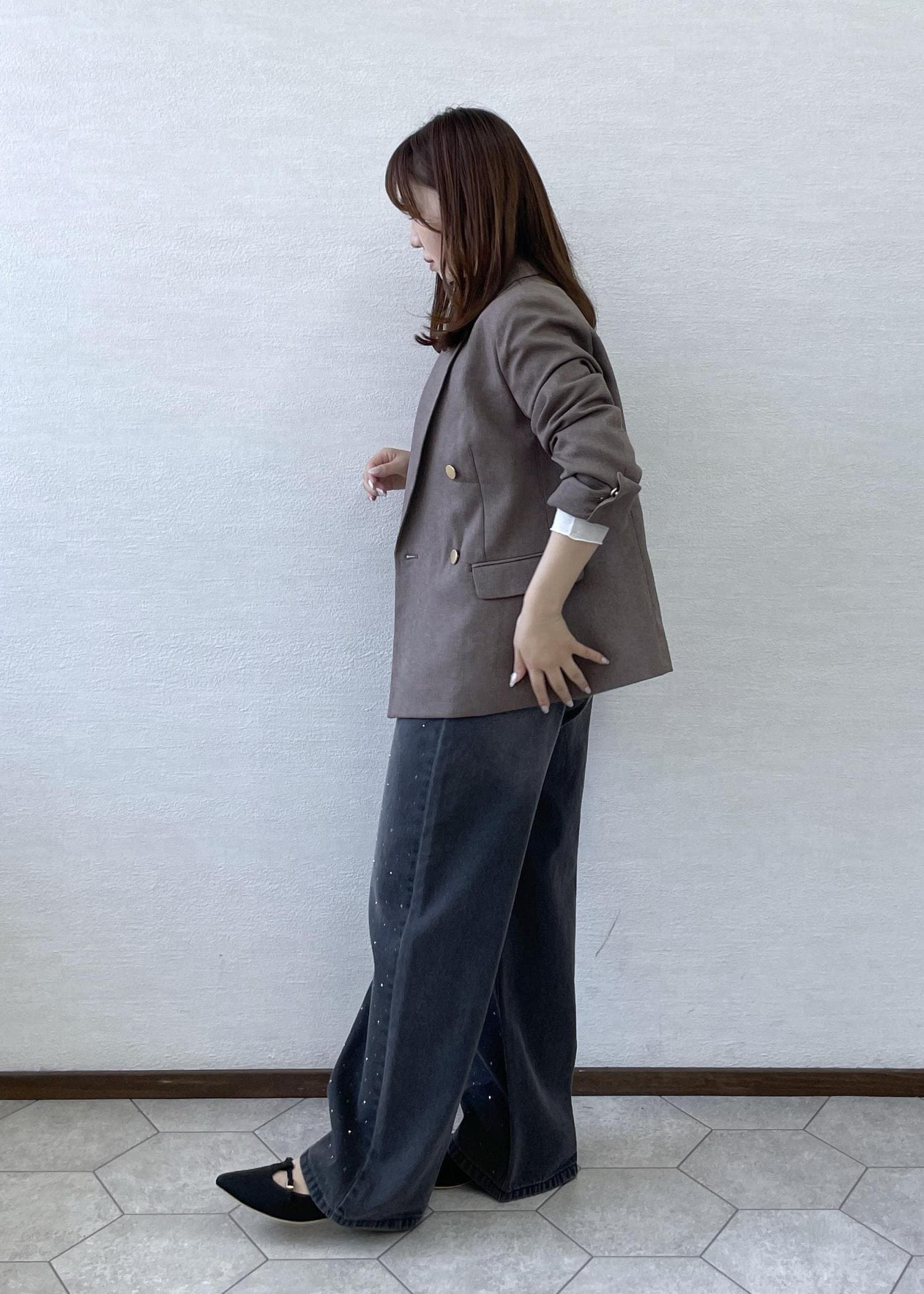 レディハンサムシリーズのジャケットはサイズ展開豊富でオンオフ問わず着ていただけます!新色のブラックのビジューデニムを合わせて落ち着いた色でまとめました!