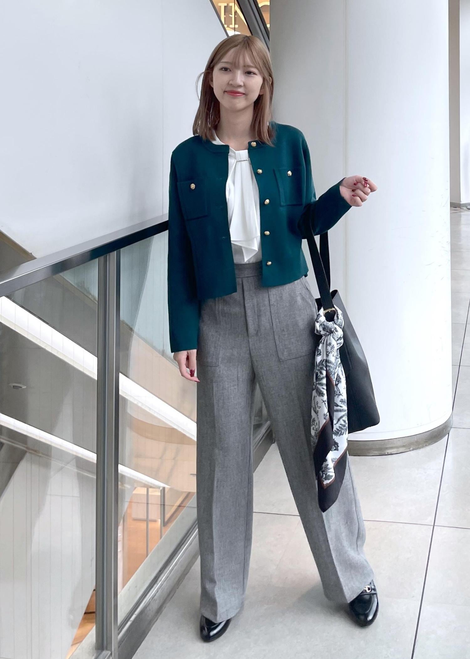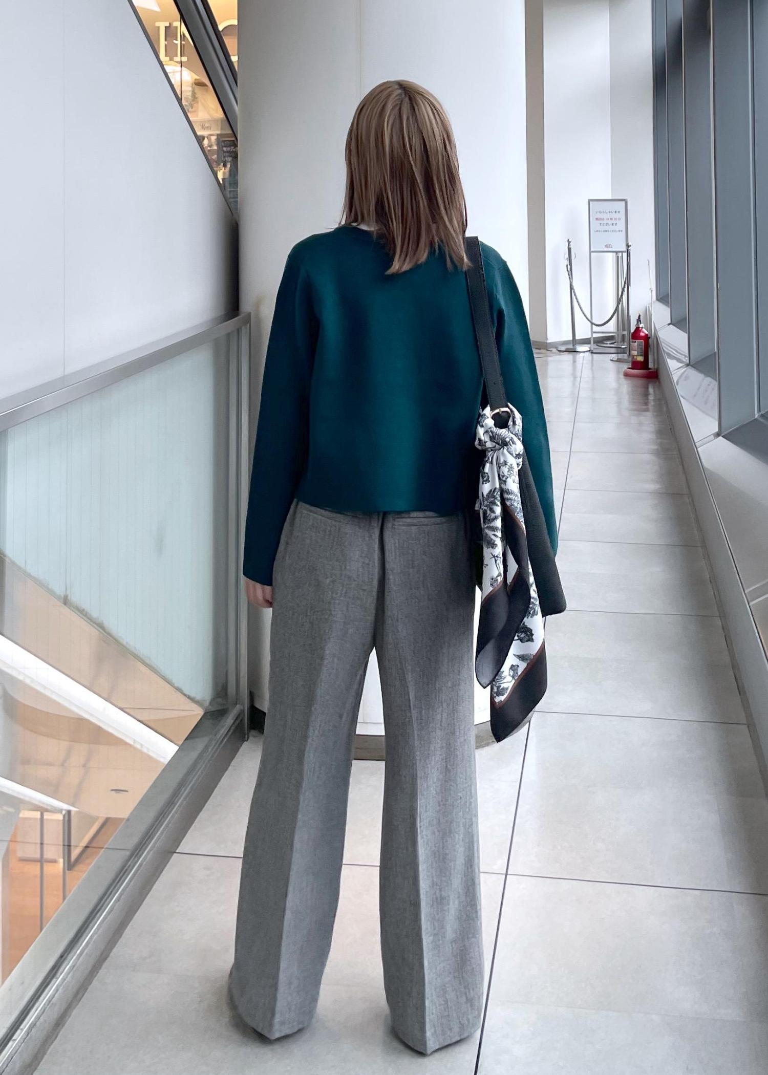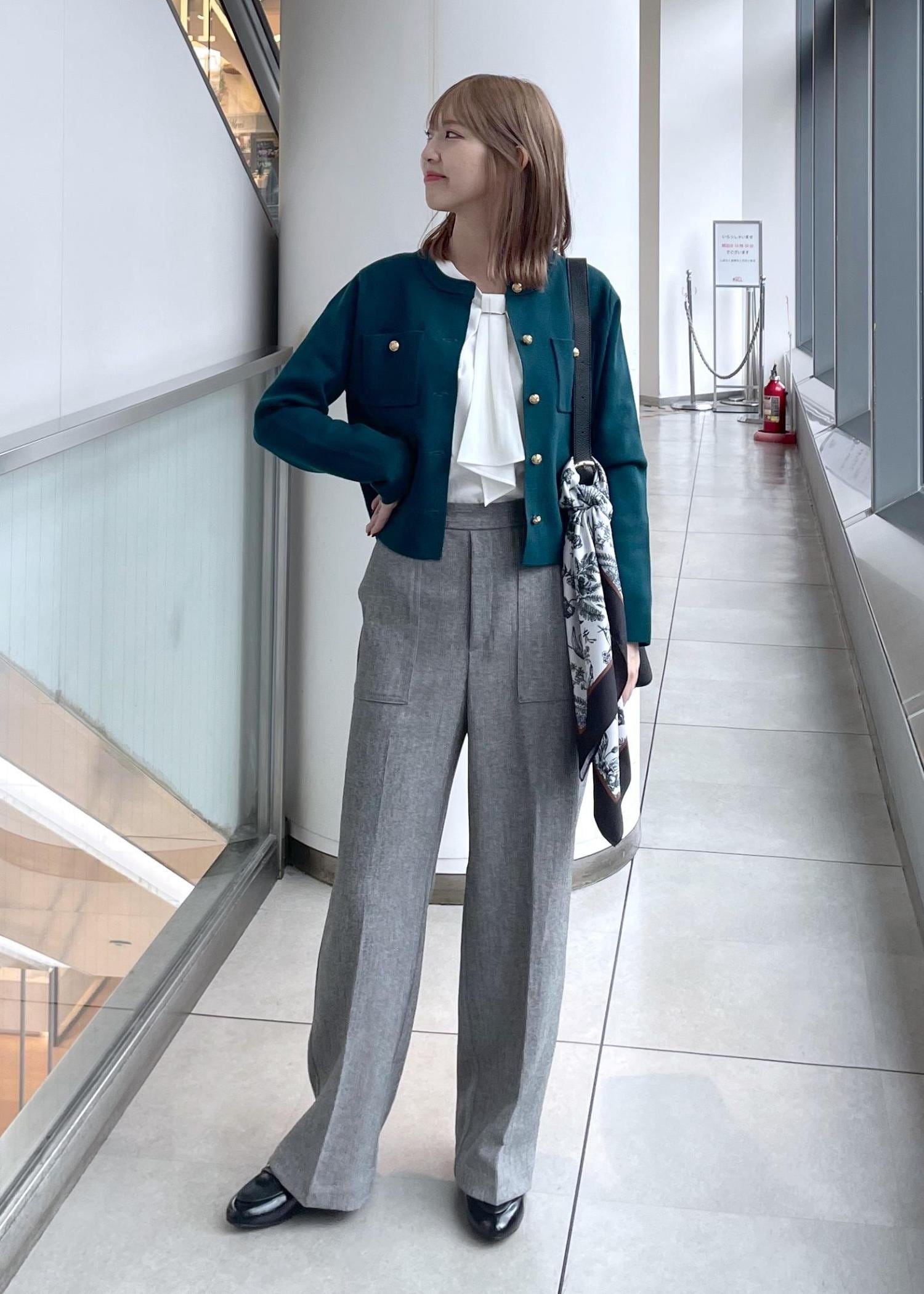 お仕事にもぴったりなキレイめスタイルです。深めカラーのカーディガンを使い秋っぽさをプラスしました。
