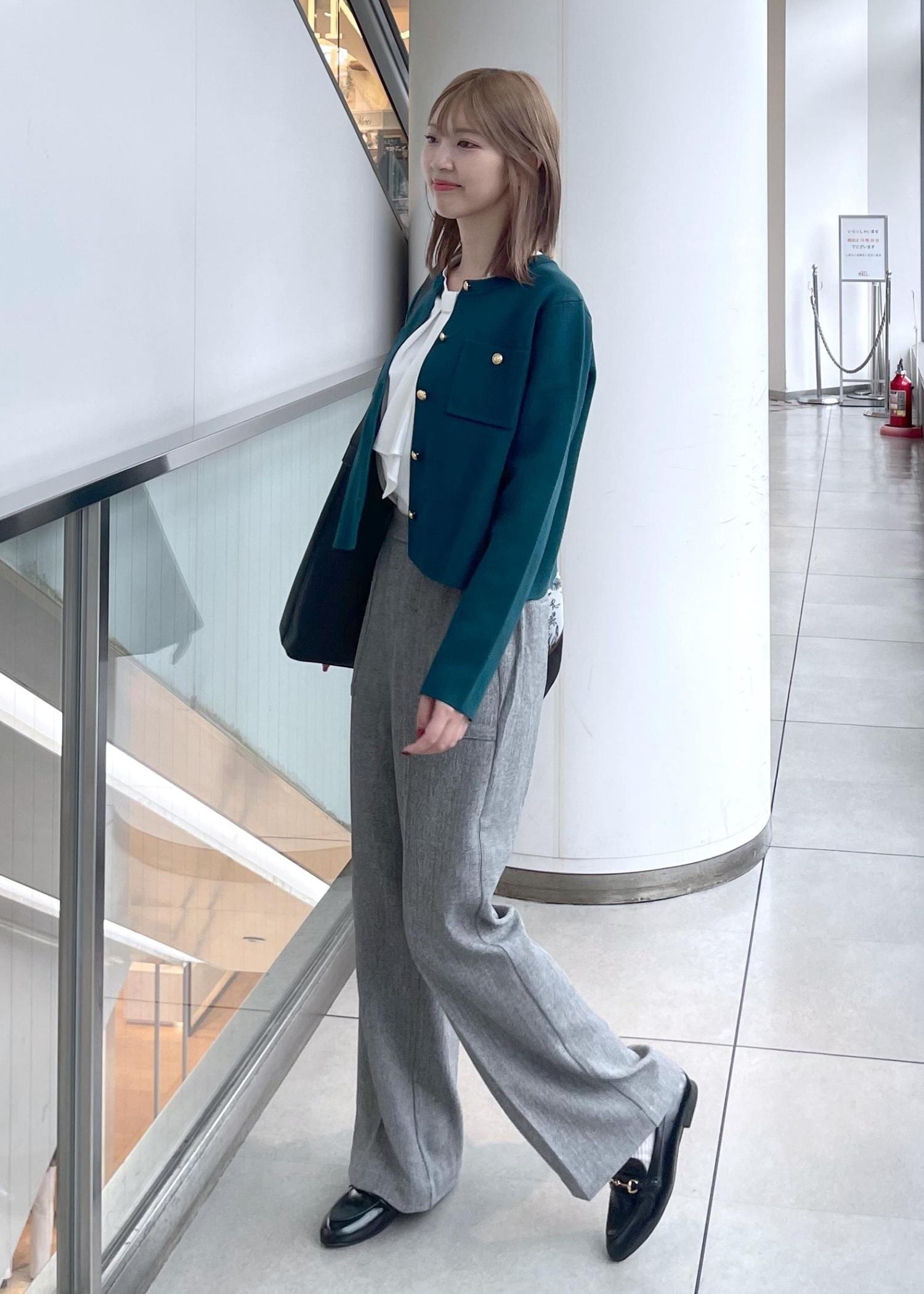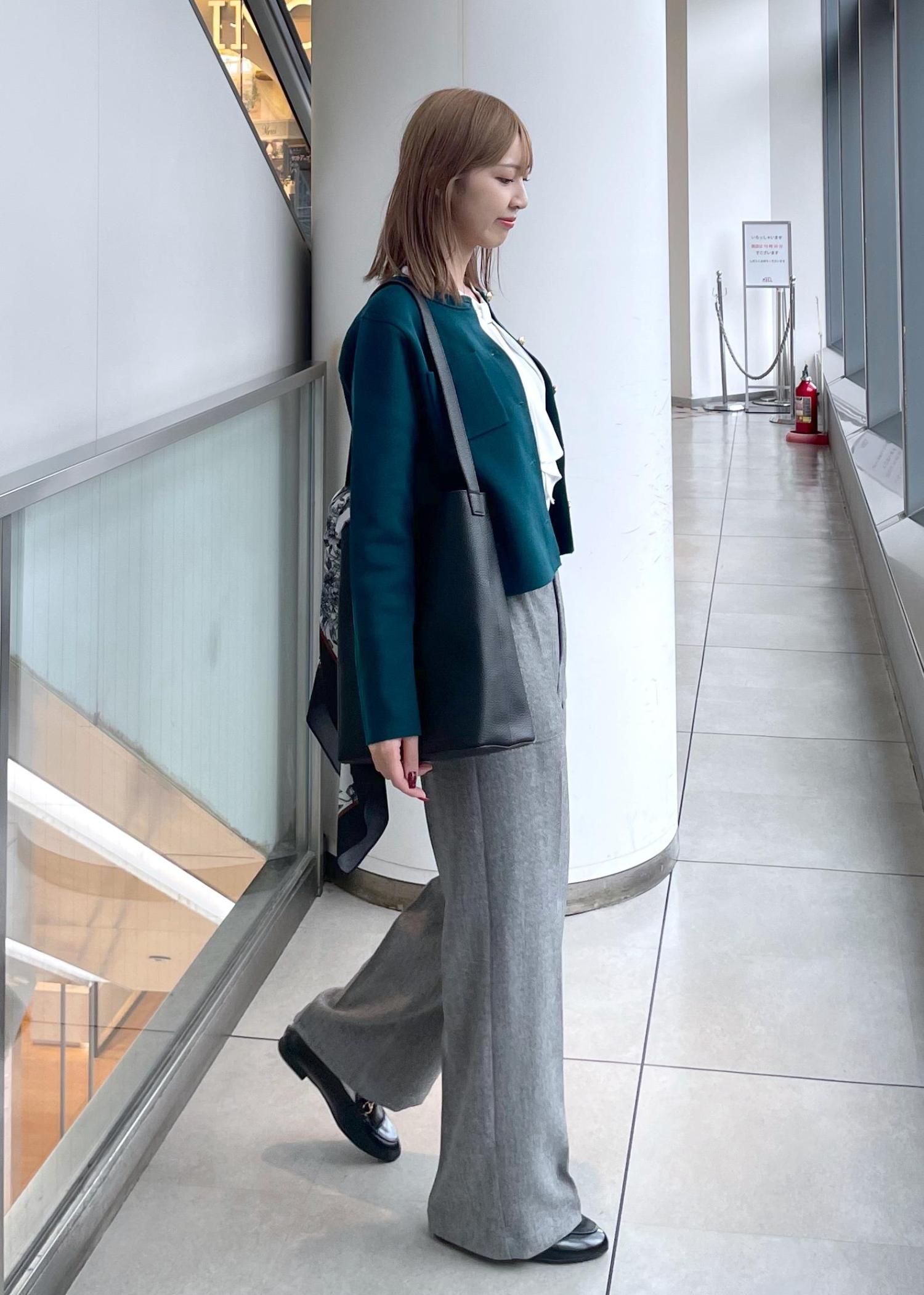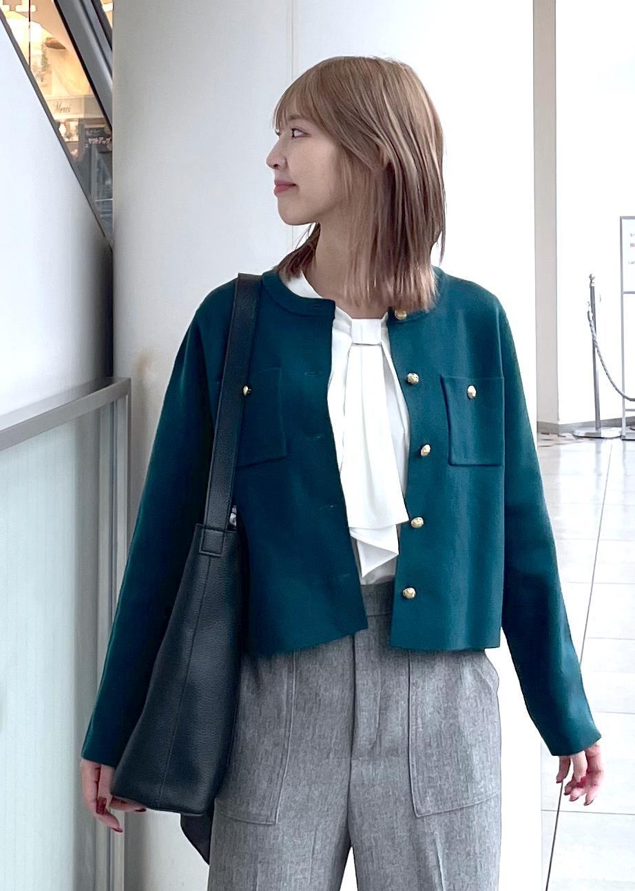 お仕事にもぴったりなキレイめスタイルです。深めカラーのカーディガンを使い秋っぽさをプラスしました。