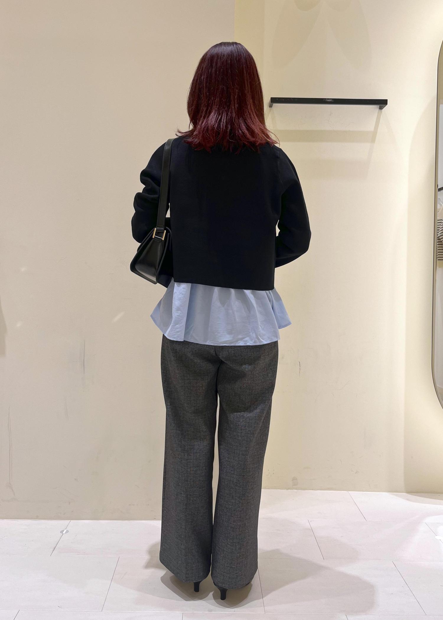ミラノリブカーディガンとペプラムブラウスを組み合わせたコーデです!ブルーのシャツが差し色でお気に入りです♪