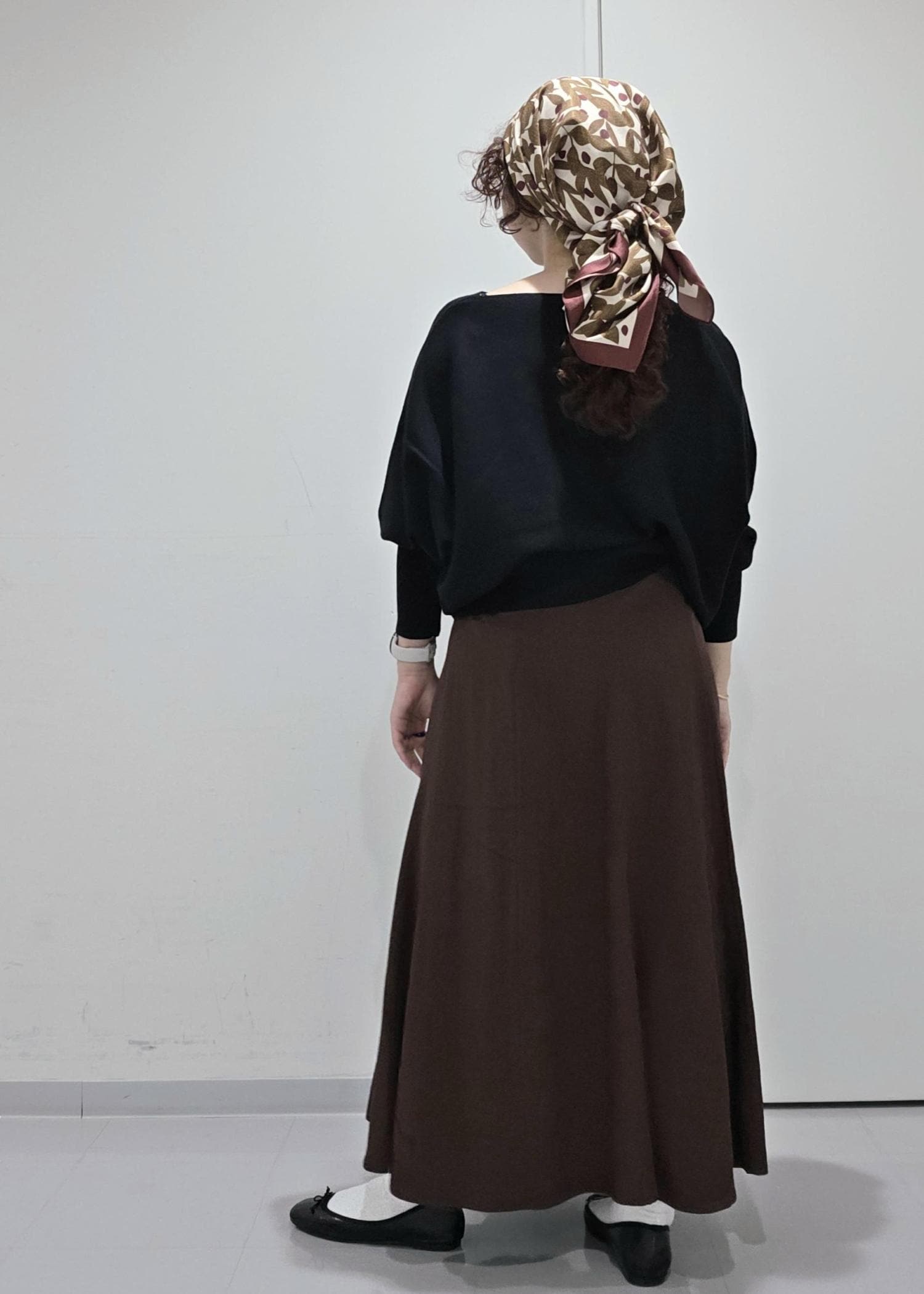 トップス、スカートともにシンプルだったので、スカーフを頭に巻いてアクセントに!