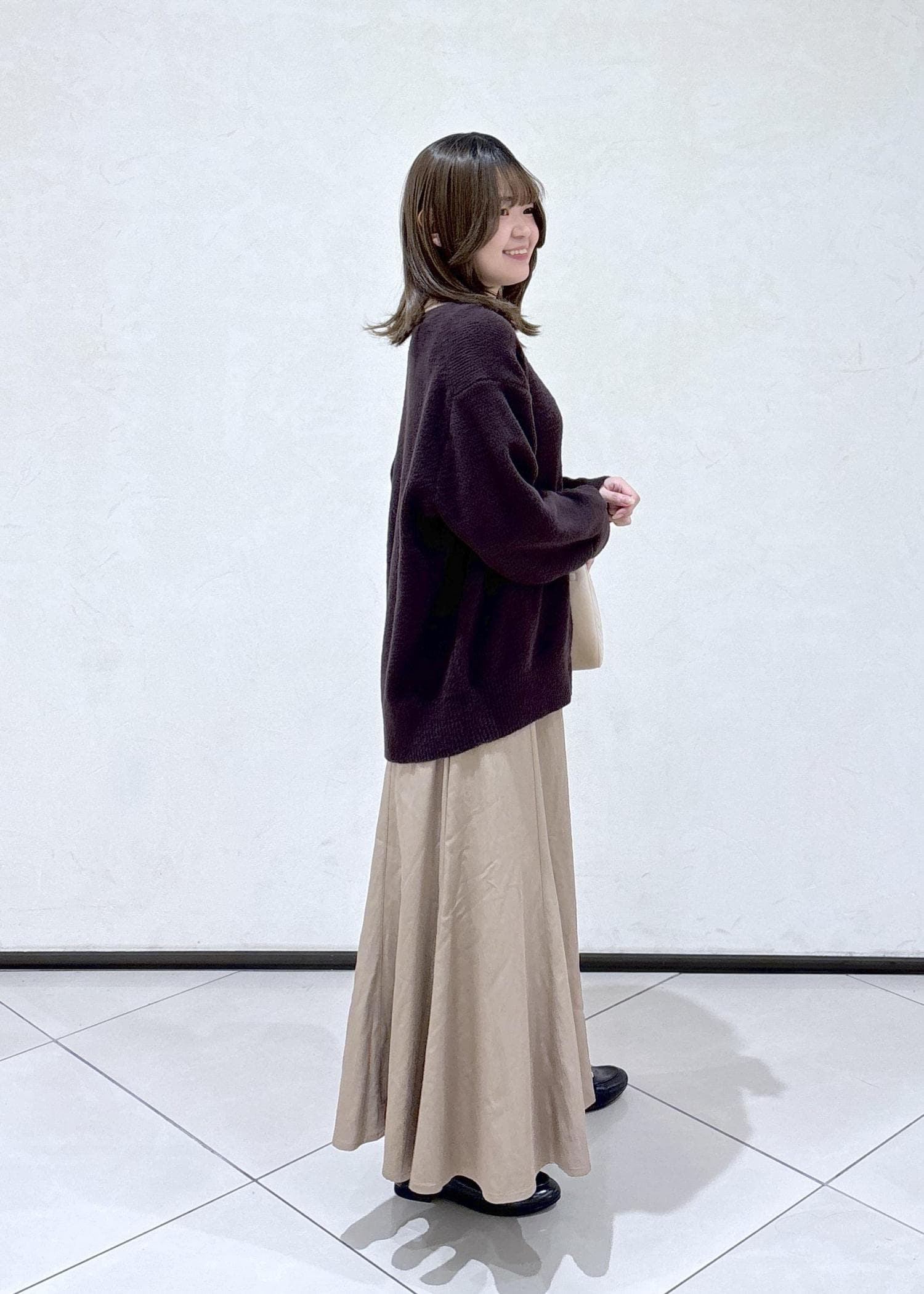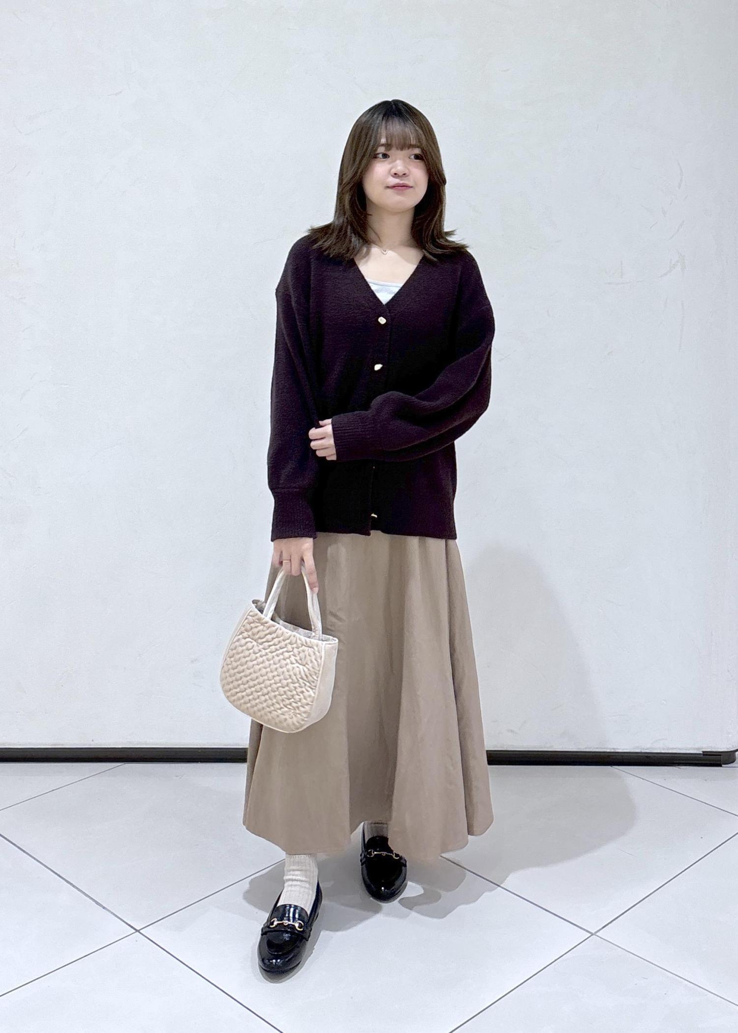 ロングカーデにロングのスカートで重たくなりそうですが、カーディガンの下ふたつのボタンを開けるとスリットっぽくなって重たくなり過ぎずバランスよく着やすいです!