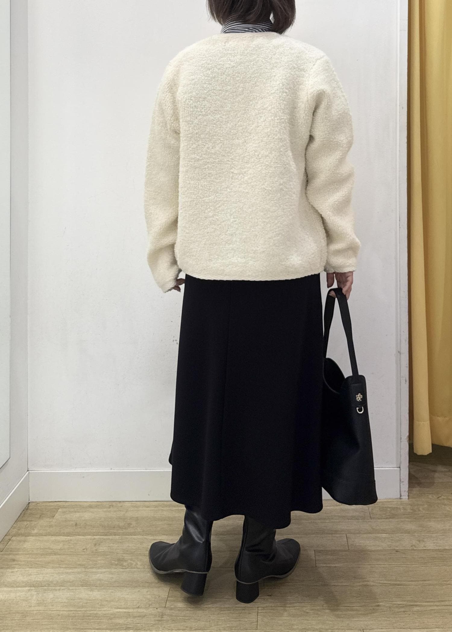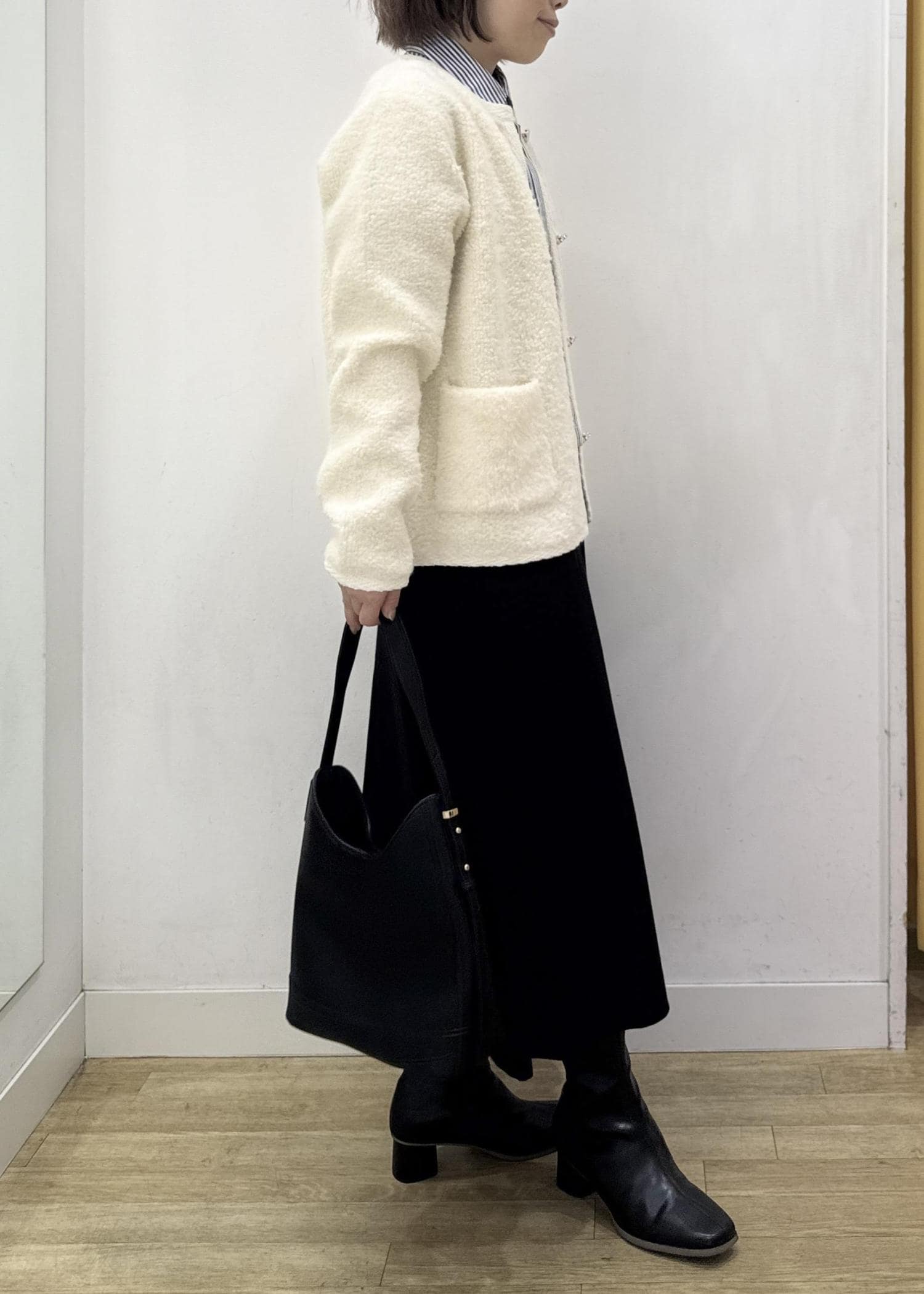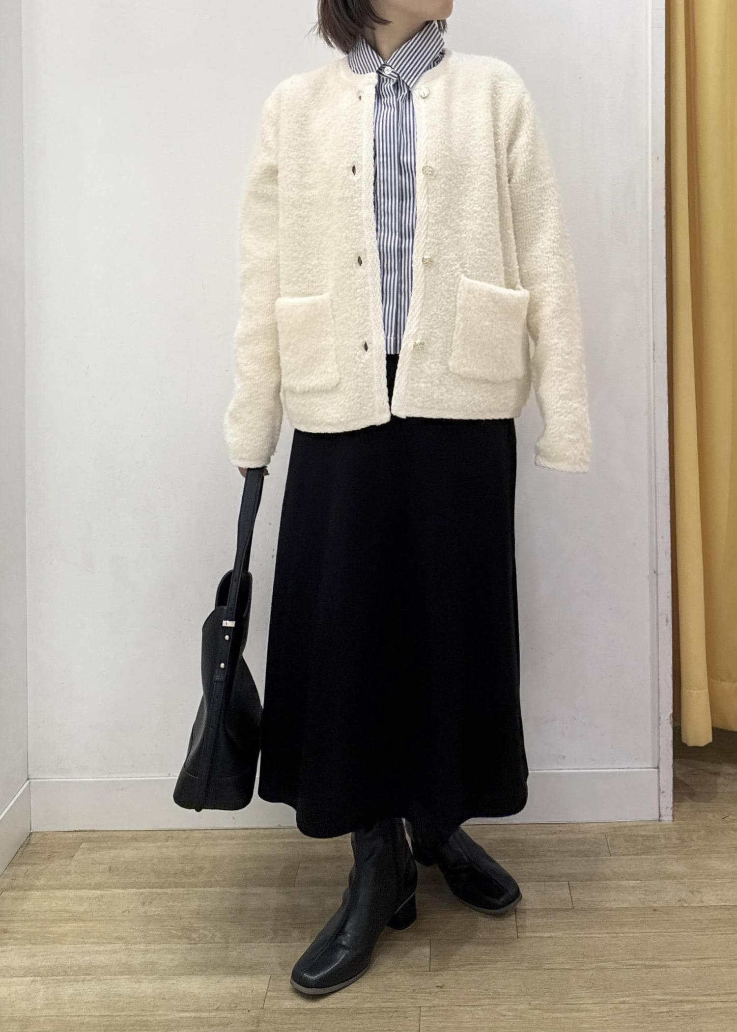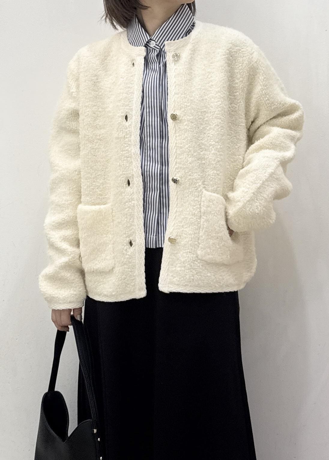 ヒップにかかるぐらいの着丈でパンツ、スカートどちらにも合わせやすい長さです。