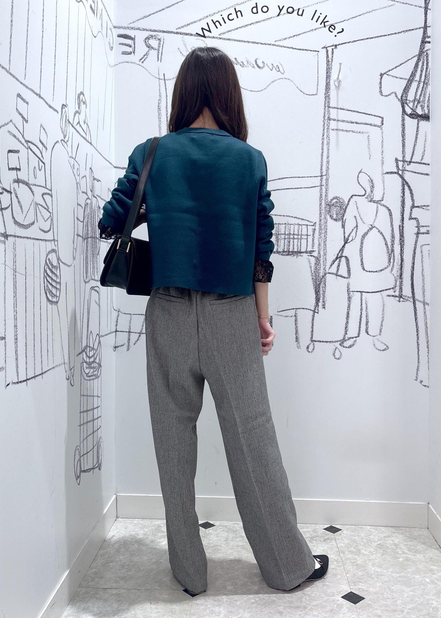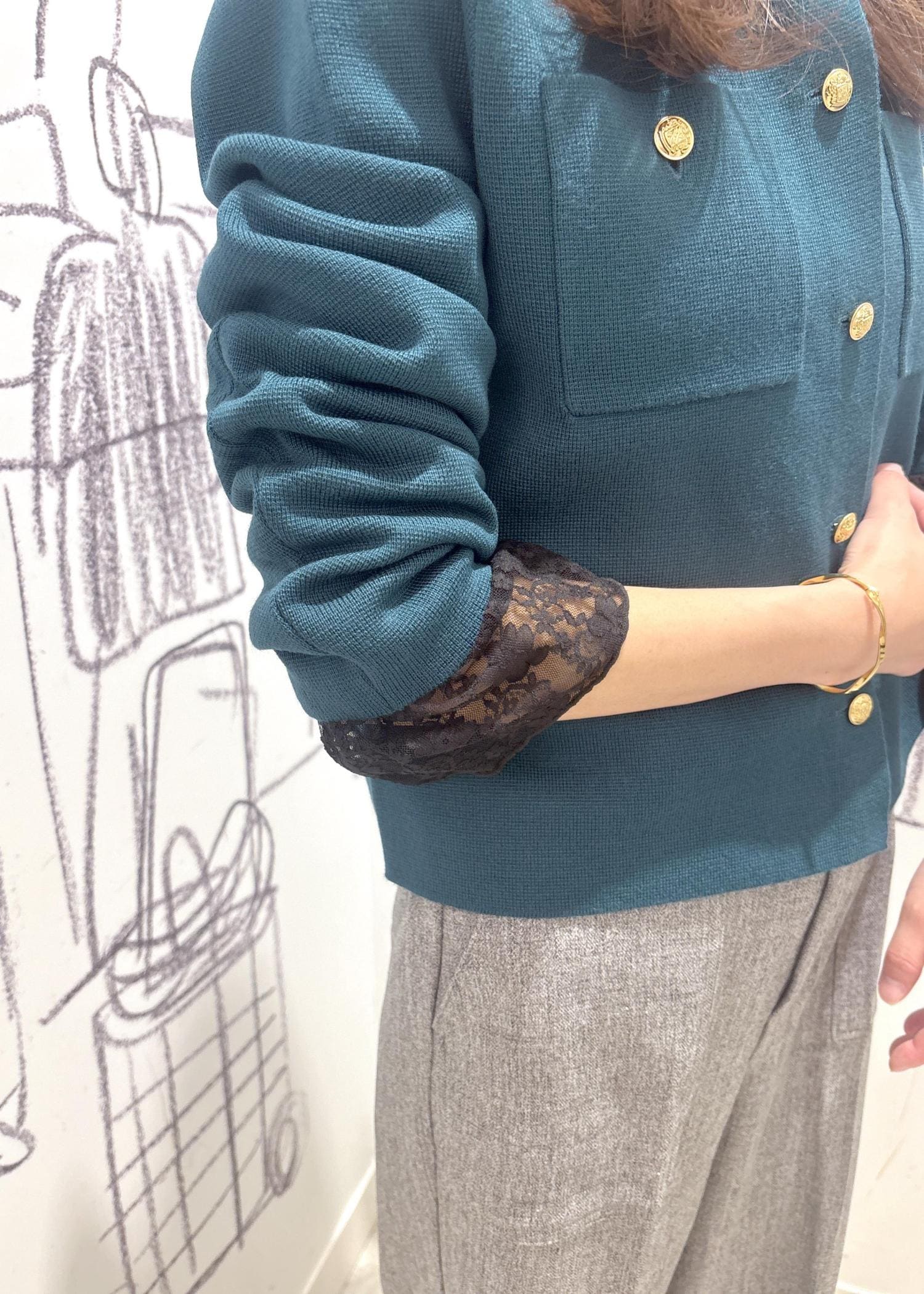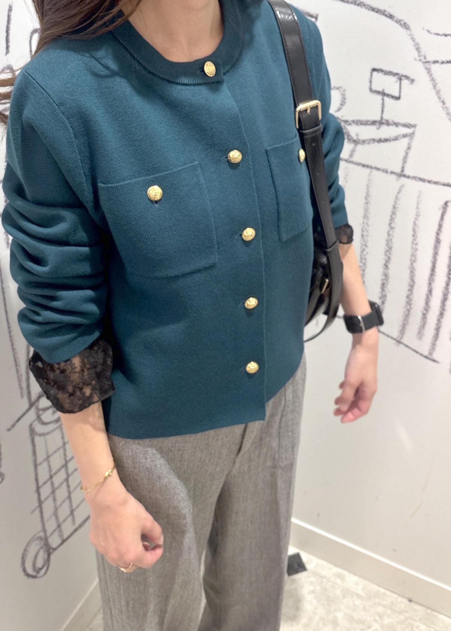 グリーンとグレーの落ち着いた色味でまとめたコーディネートです。金ボタンが綺麗見えするカーディガンで袖元からインナーレースをレイヤードしてワンポイントになるように着こなしました。
